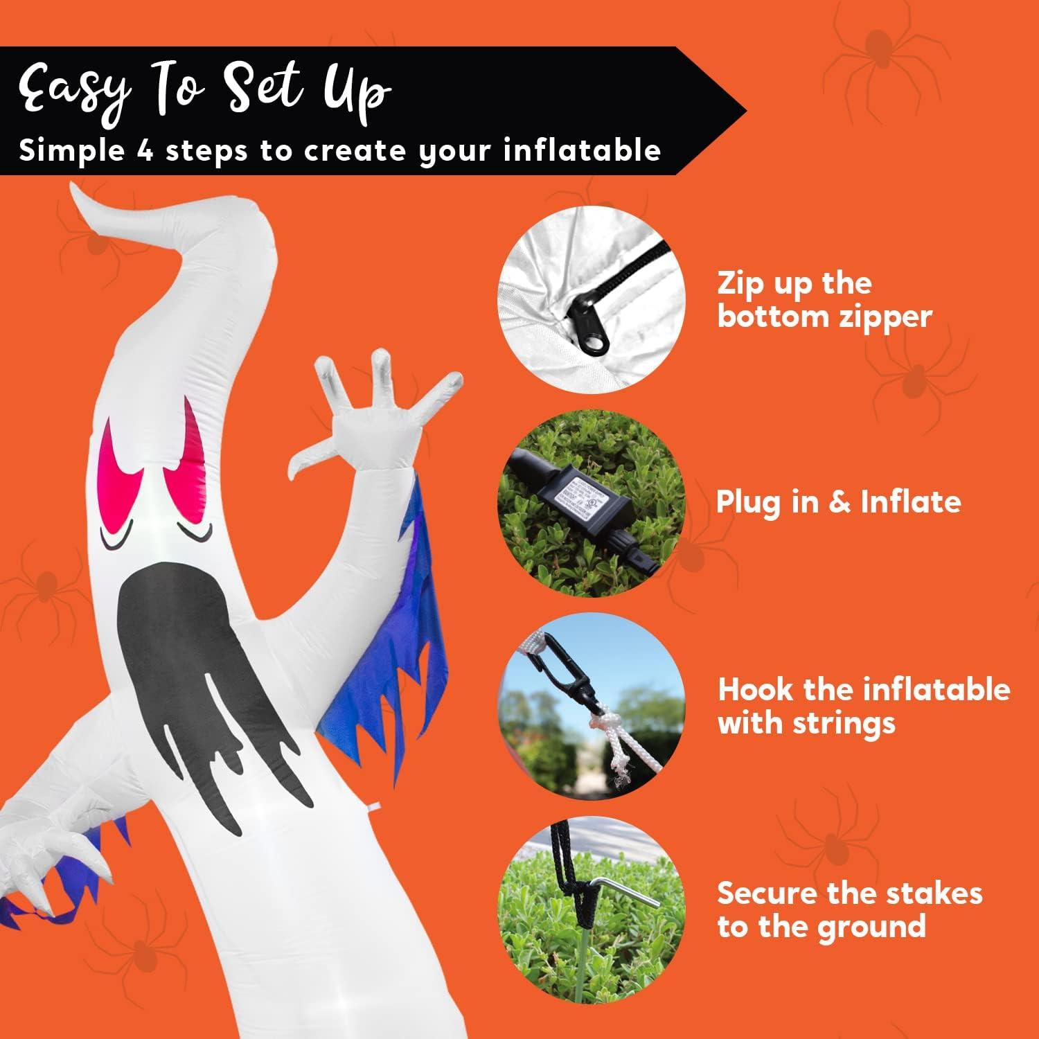 EXCELLENT DESIGN. This 12 ft tall Halloween Inflatable towering spooky ghost is the perfect addition to your Halloween Eerie Night. It brings a different kind of fun to your Halloween holiday. This inflatable comes with an extended cord, ground stakes, fastened ropes, built-in sandbags, and a plug with UL certification. These features help secure the ghost in place, preventing it from being blown away by wind outdoors.