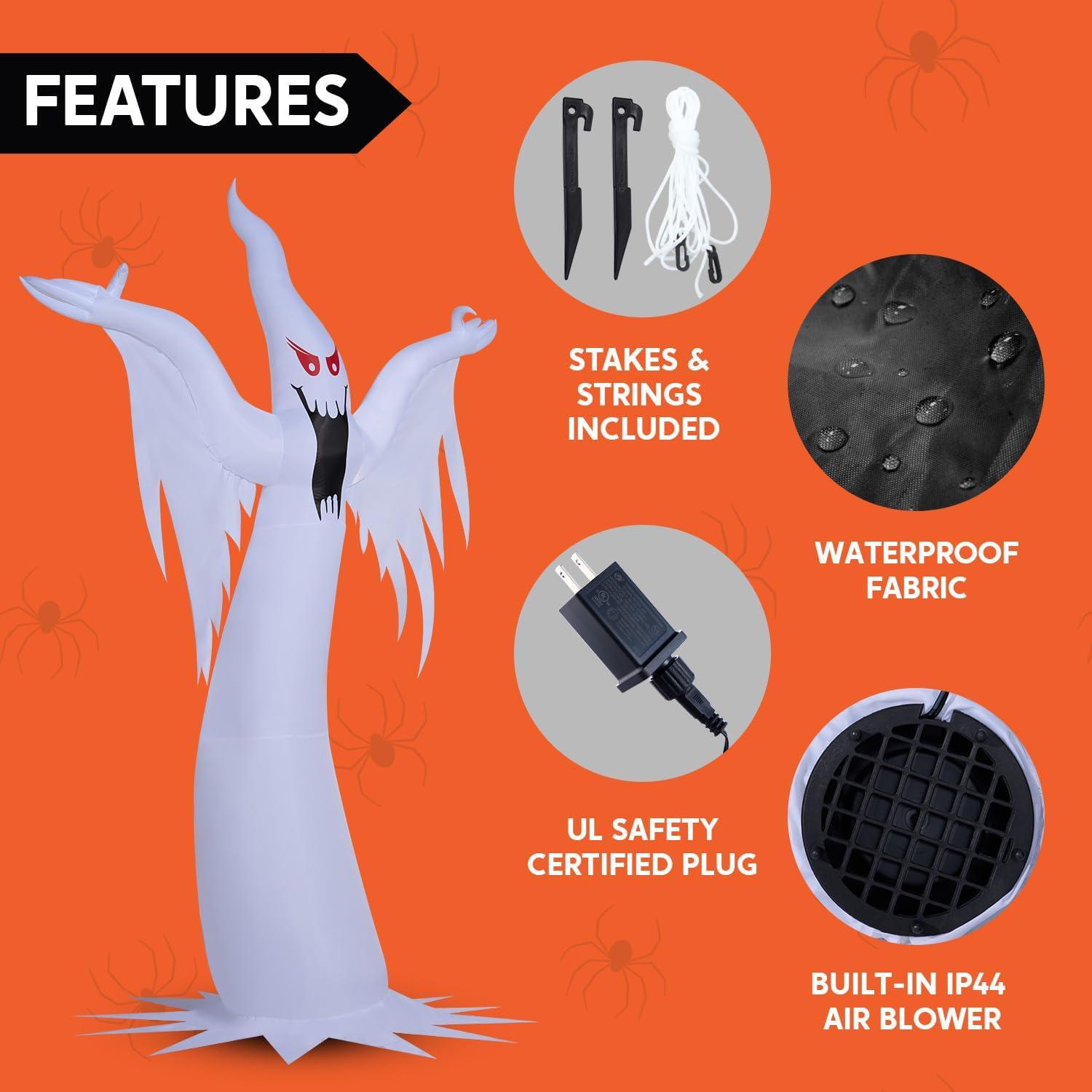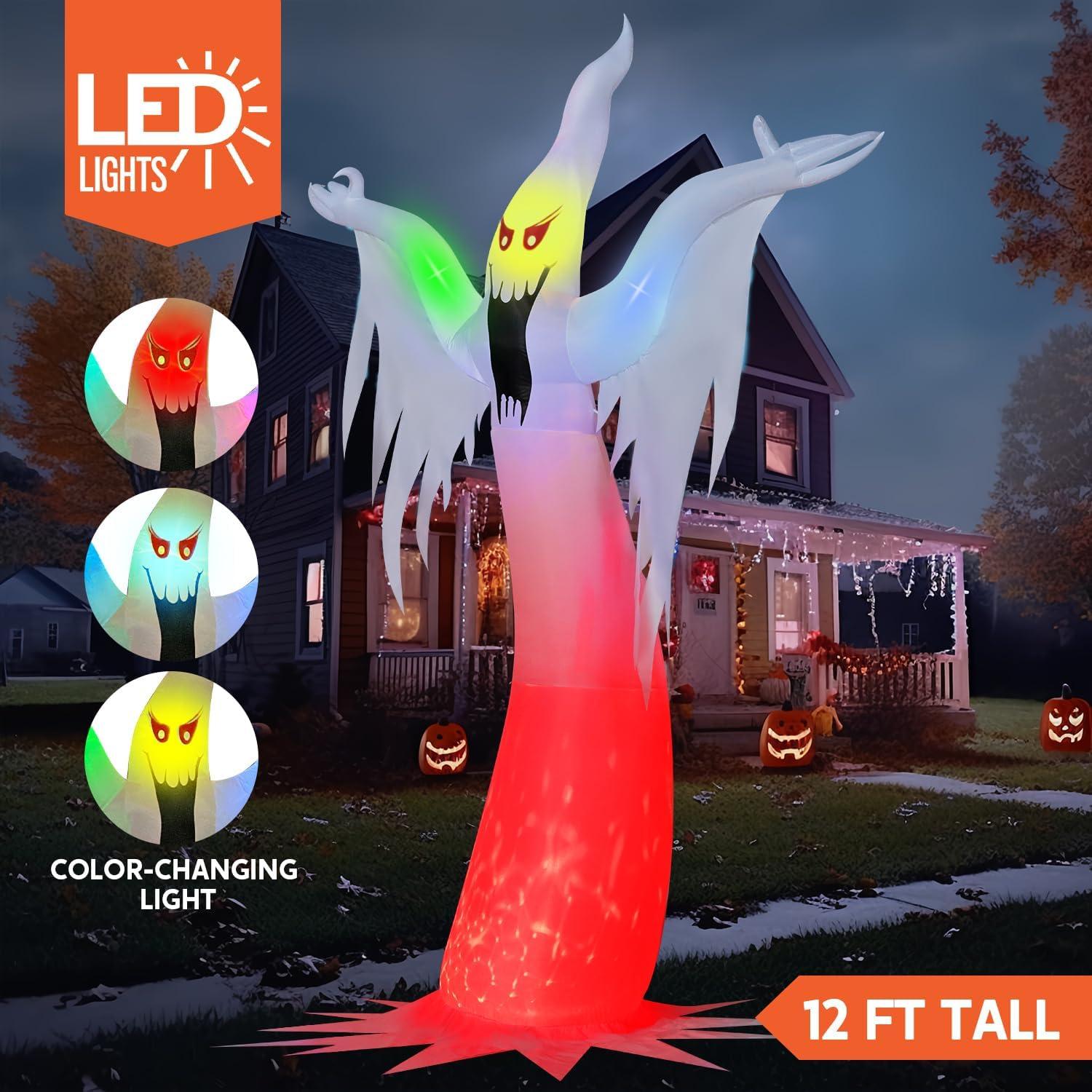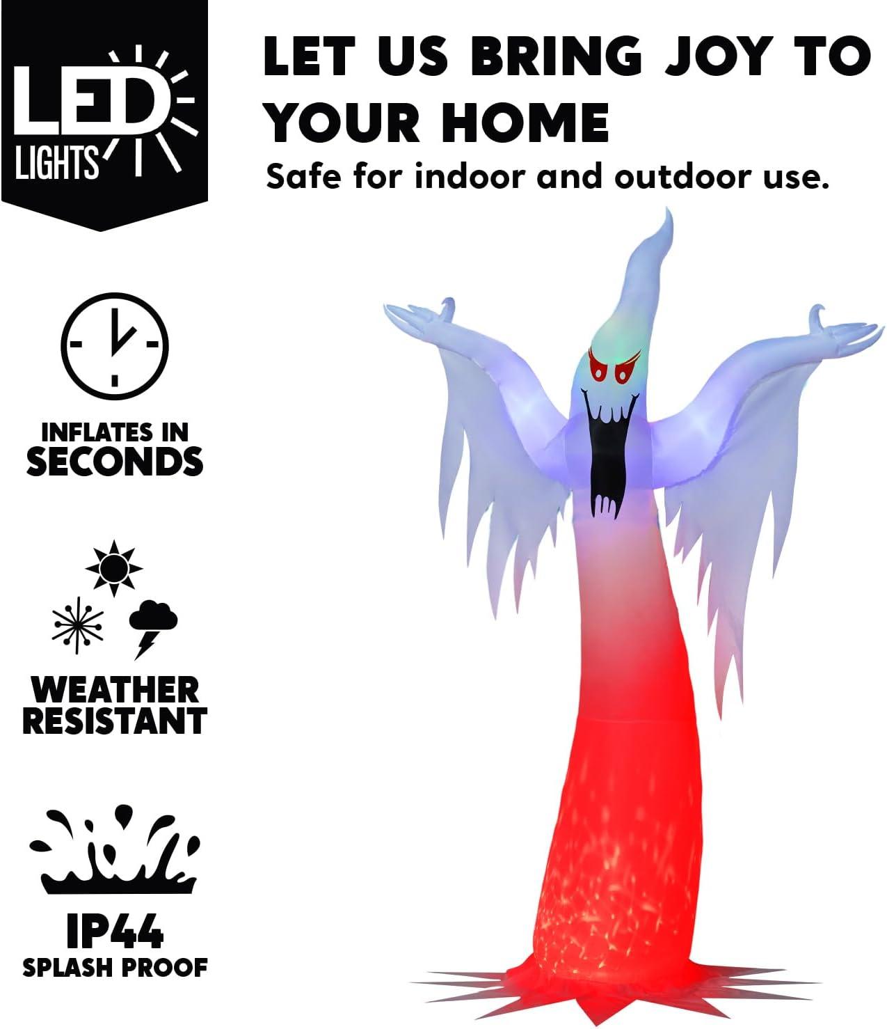 Excellent Design. This 12 feet tall Halloween inflatable ghost decoration features the color-changing lights on the top and fire-flaming lights at the bottom, creating a chilling and eerie atmosphere. Its life like appearance and attention to detail make it a standout piece that will capture the attention of all who sees it. This inflatable comes with an extended cord, ground stakes, fastened ropes, built-in sandbags, and a plug with UL certification.