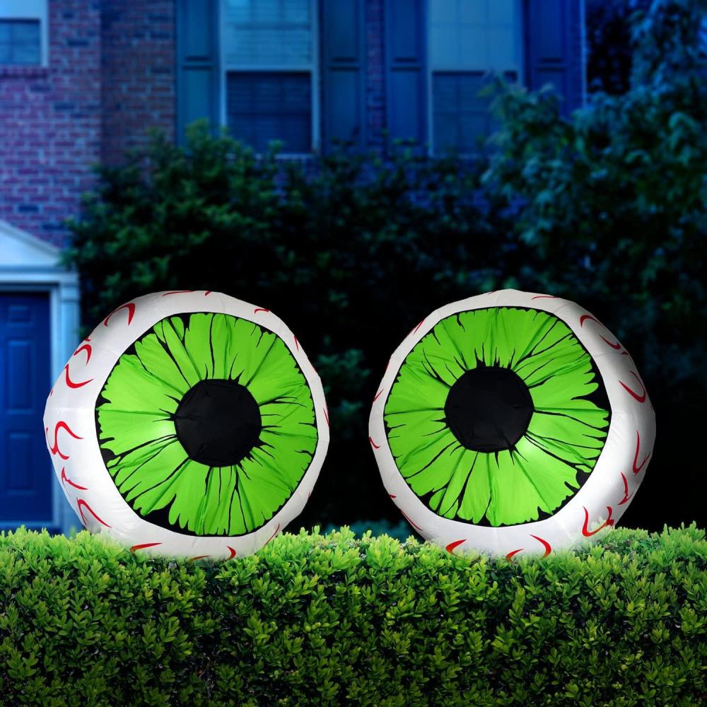 2 pack 3 feet tall sacry Halloween Inflatable Light Up Eyeball comes with extended cords, ground stakes, fastened ropes, built-in sandbags, and a plug with UL certification.