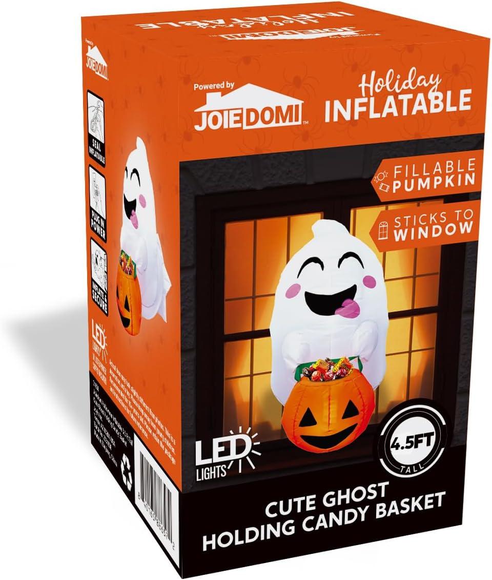 PERFECT DESIGN. Scare up some ghostly good fun with our 4.5 ft Tall Cute Halloween inflatables featuring its built-in adorable pumpkin that you can fill in with treats and goodies. This amusing animated halloween inflatables outdoor decorations comes with extended cords, screw sucker, fastened ropes, and a plug with UL certification.