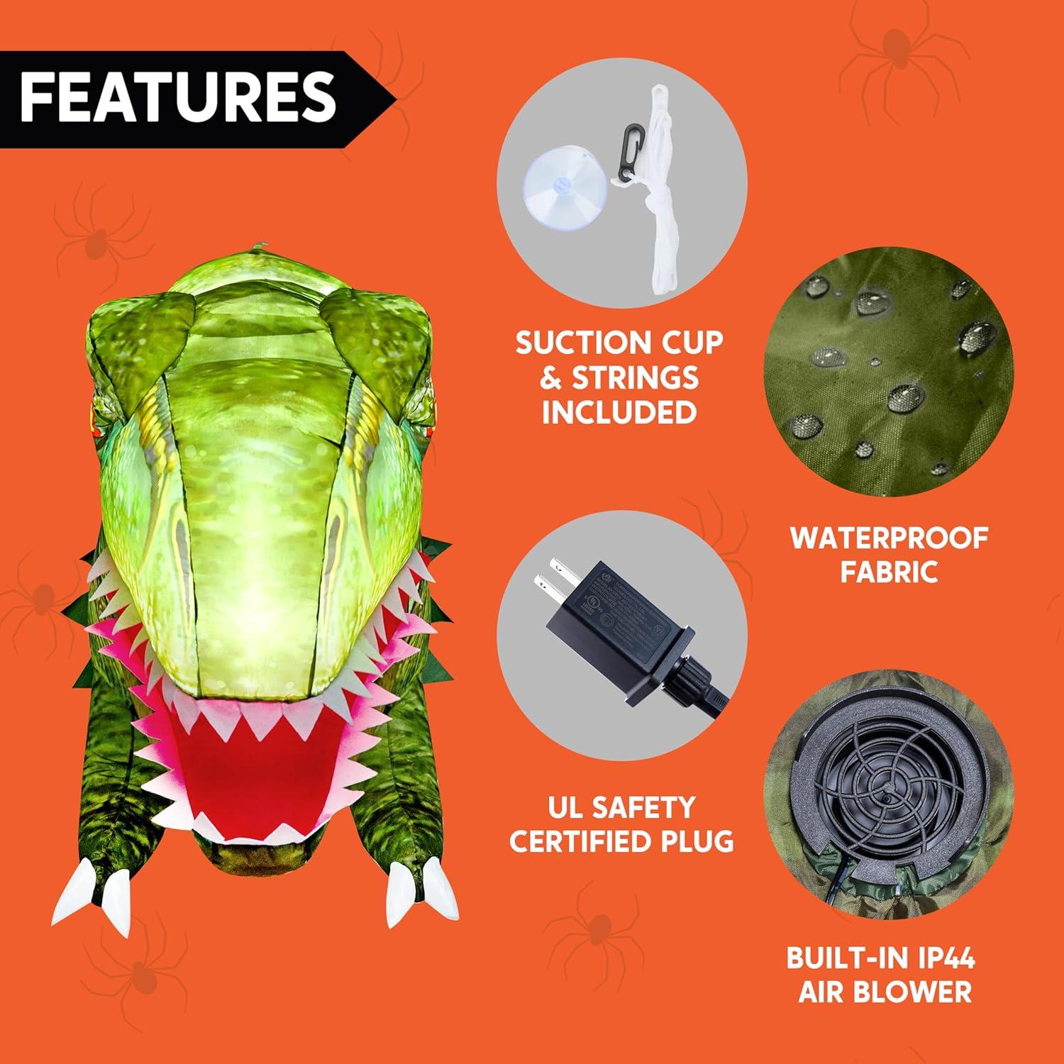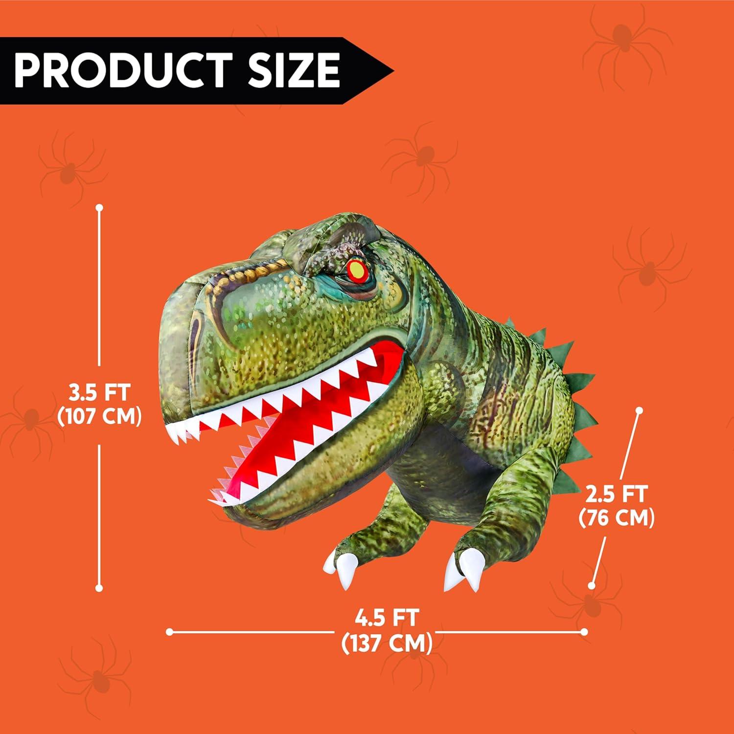 Unique Design. This Halloween inflatable green dinosaur decoration has stunning visual effects, making it an unmissable centerpiece for your Halloween party. Product size 2.5 x 4.5 x 3.5 feet. Comes with an extended cord, suction cups, fastened ropes, and a plug with UL certification.