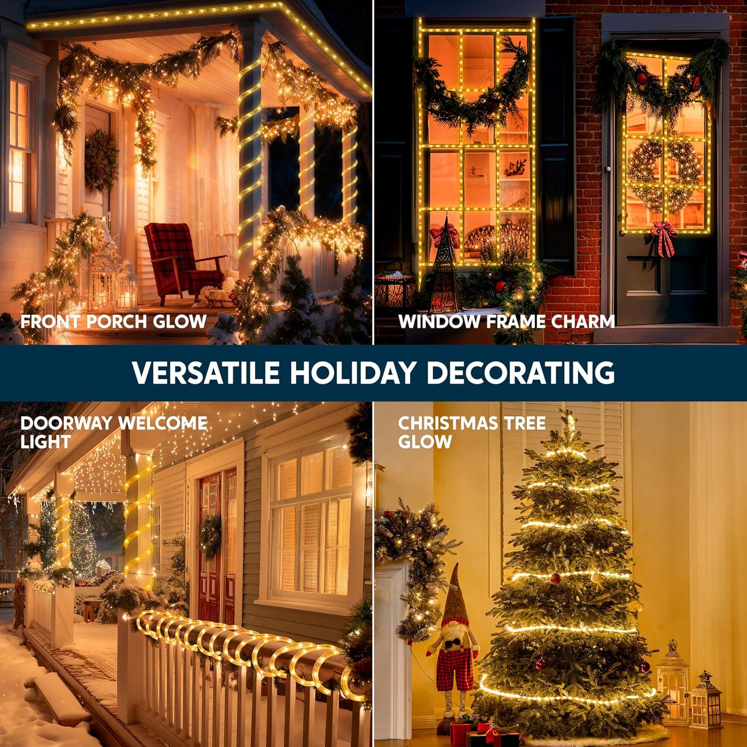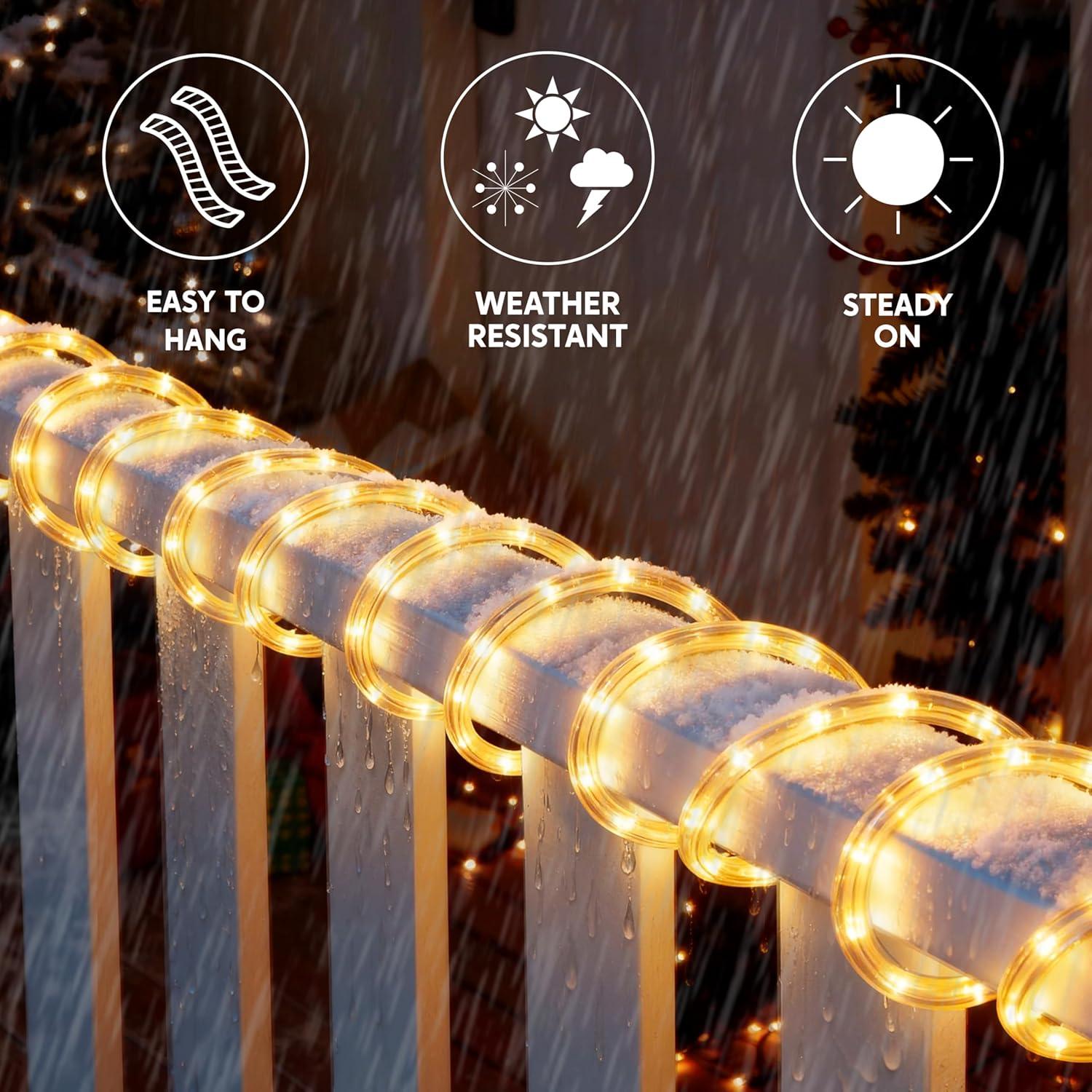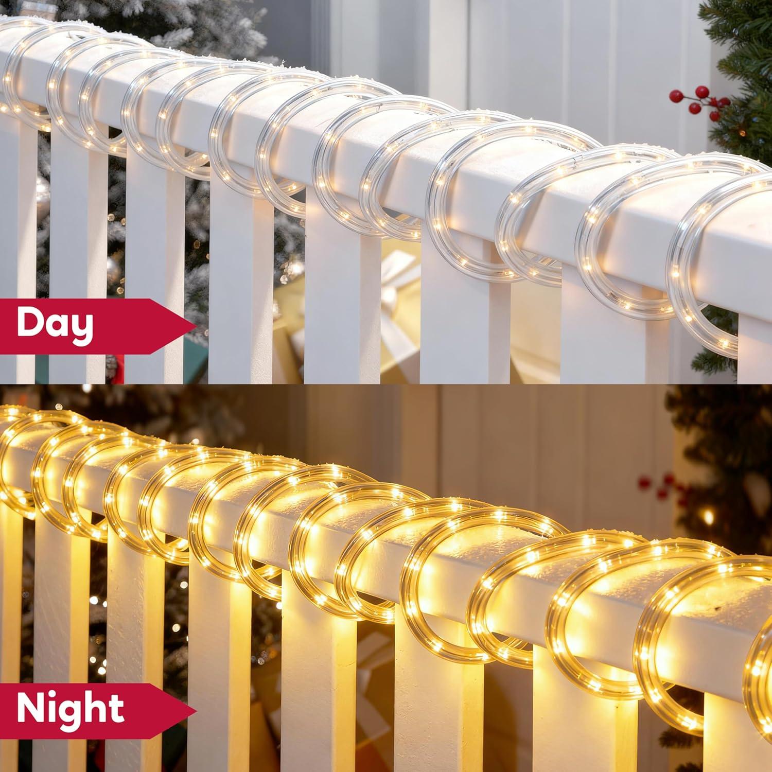 ESTIVE DESIGN. Has seamless red & white stripe pattern on the entire rope lights. Once this is lighted, the warm white bright lights would illuminate the strand making the colors and patterns more visible and emphasized.