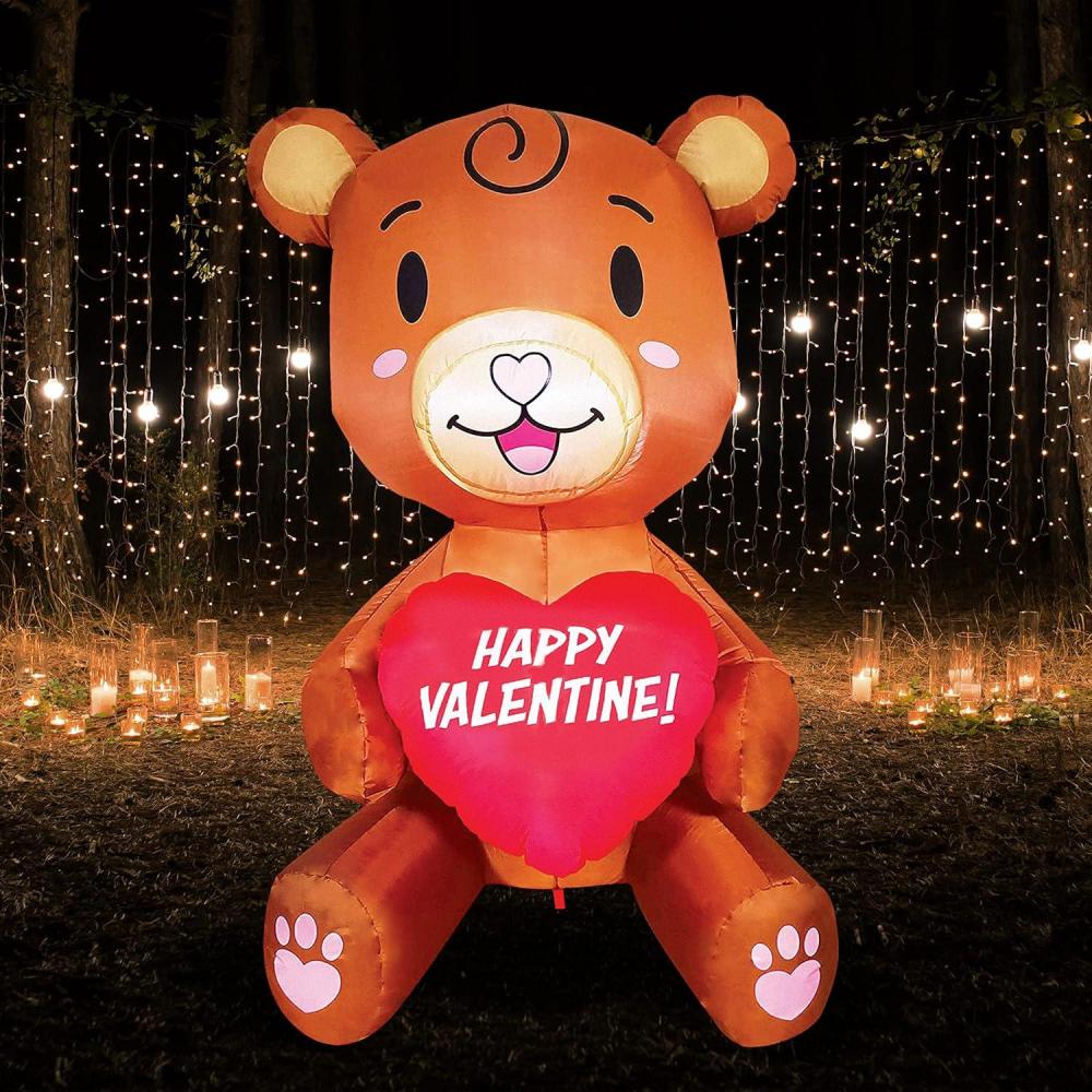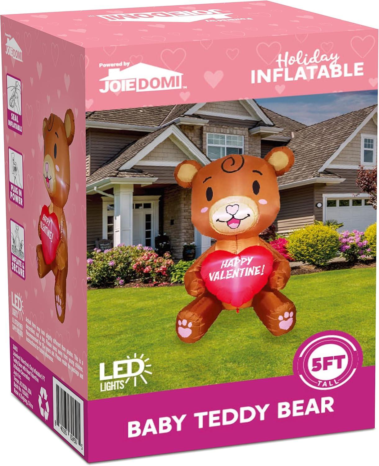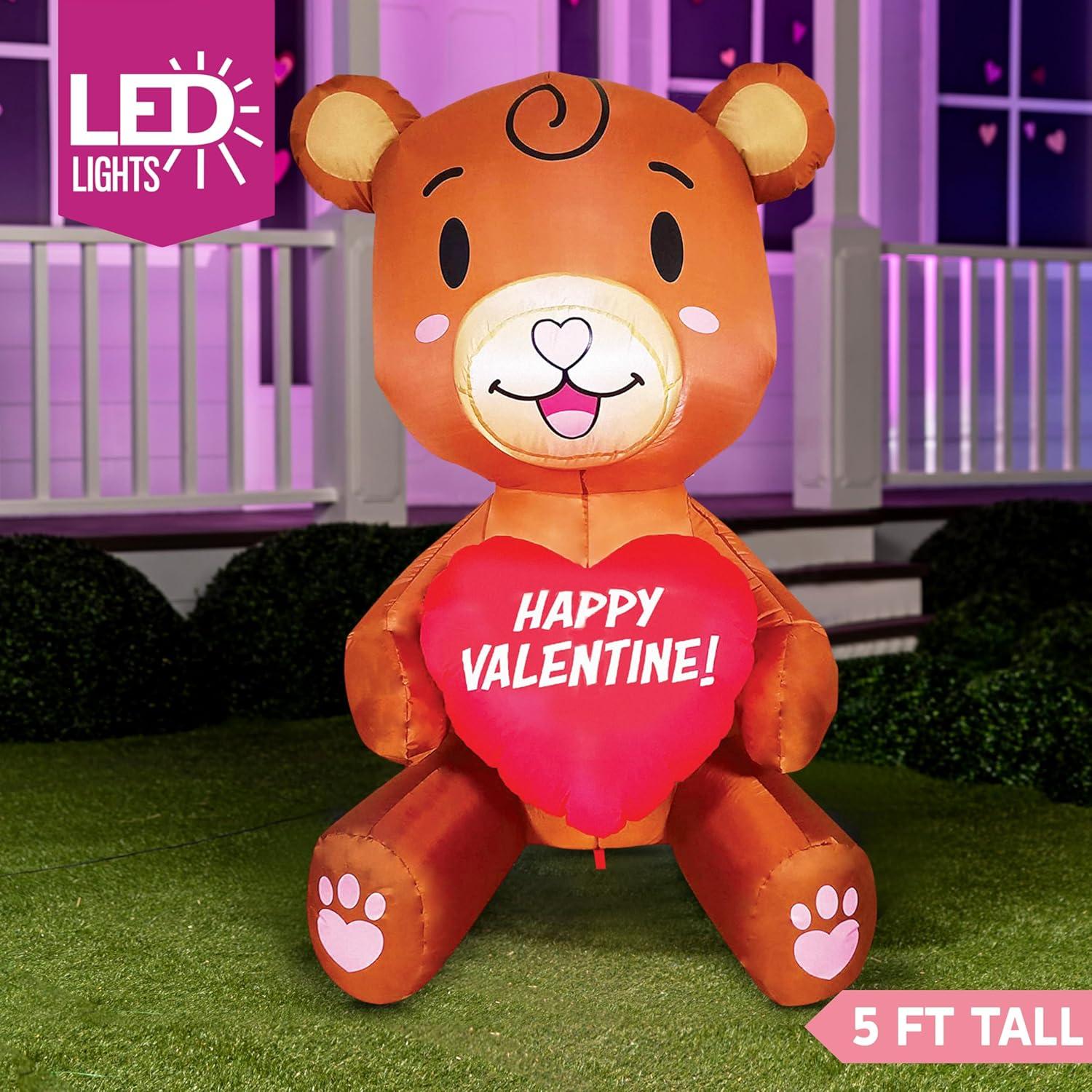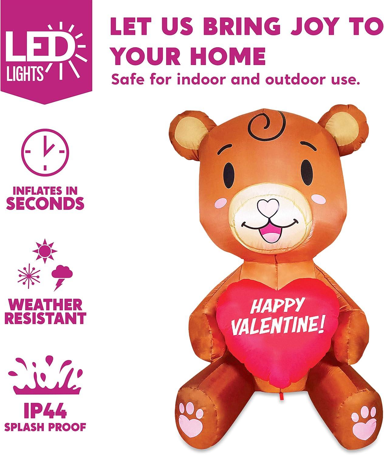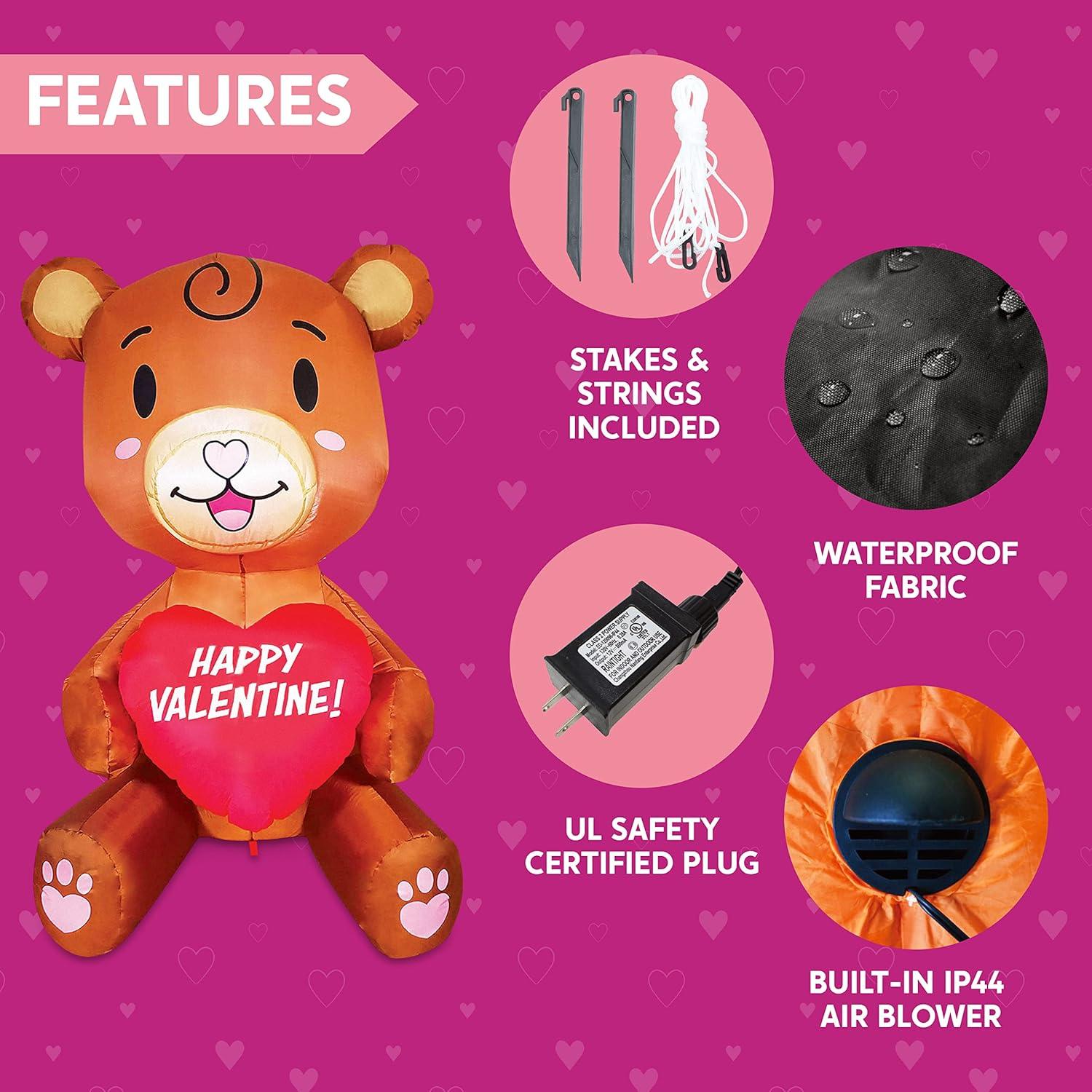 5 feet blow up Baby brown bear with Heart Valentine Inflatable comes with an extended cord, ground stakes, fastened ropes, built-in sandbags, built-in LED lights and a plug with UL certification.