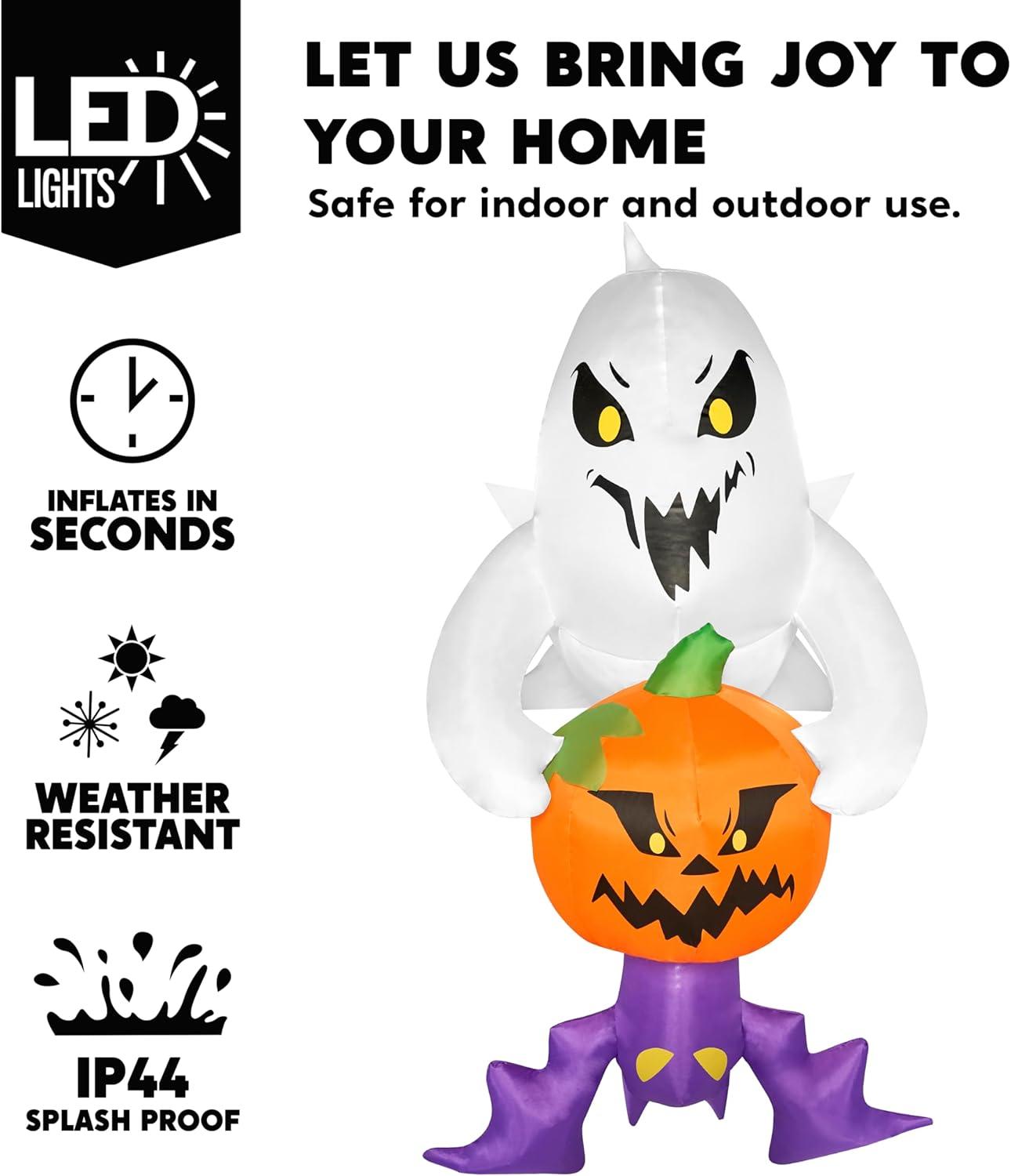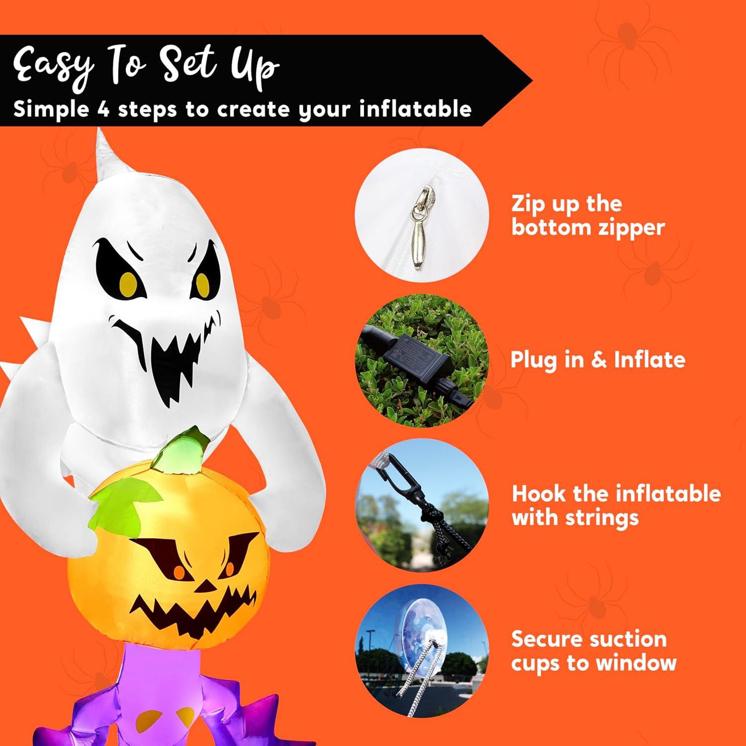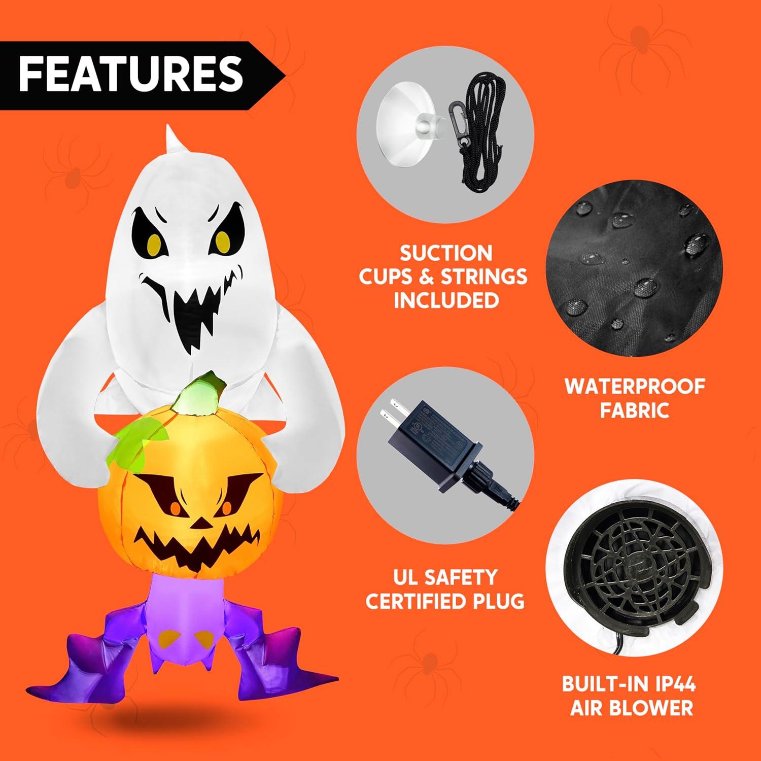 Unique Design. This Halloween inflatable scary ghost stealing pumpkin and bat decoration has stunning visual effects, making it an unmissable centerpiece for your Halloween party. Product size 2.5 x 2.8 x 6 feet. Comes with an extended cord, suction cups, fastened ropes, and a plug with UL certification.