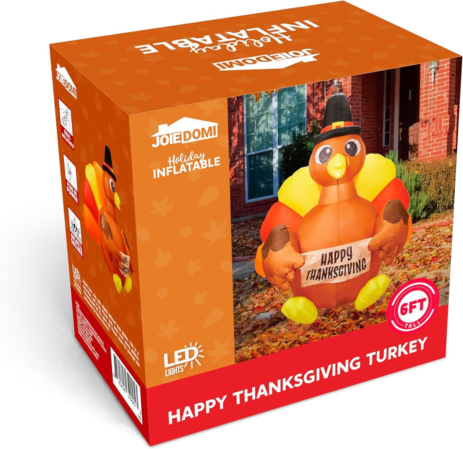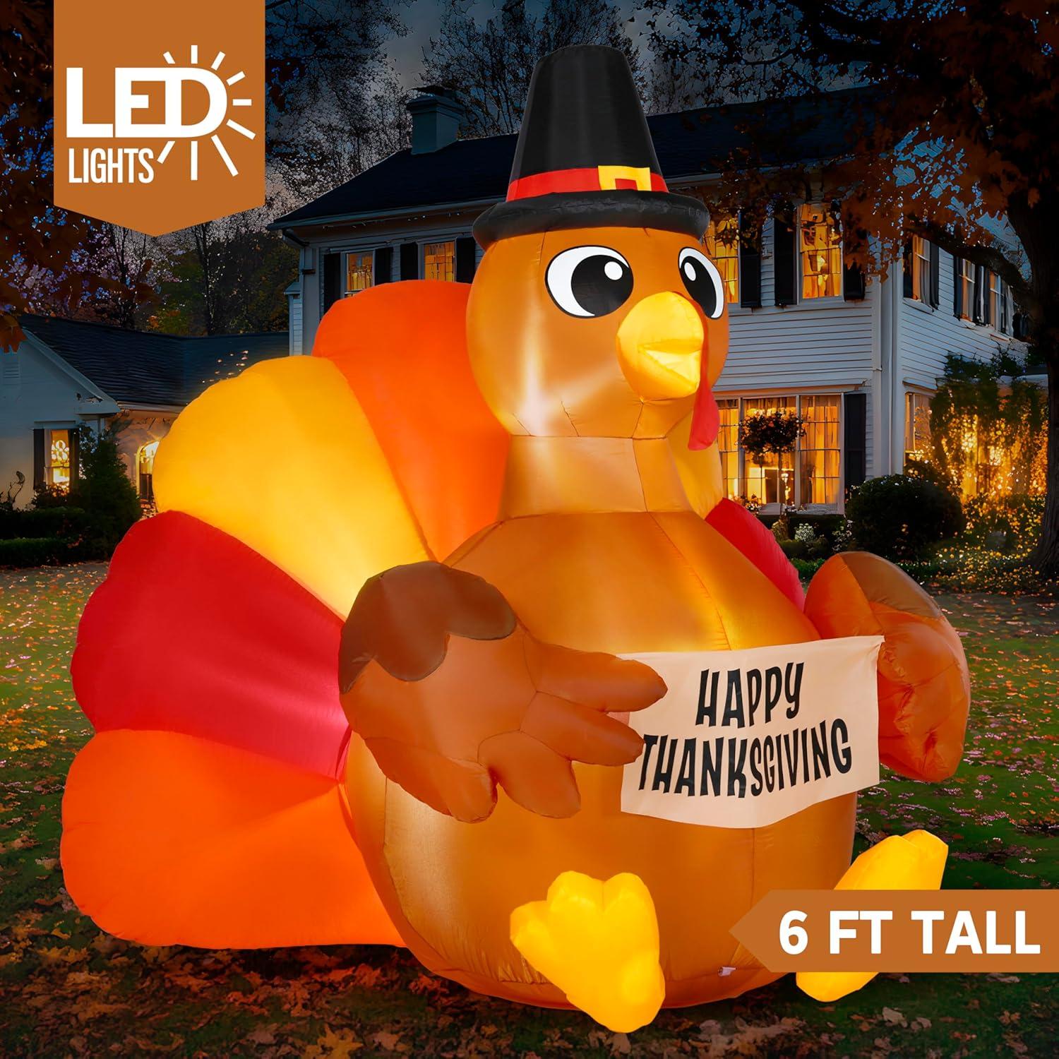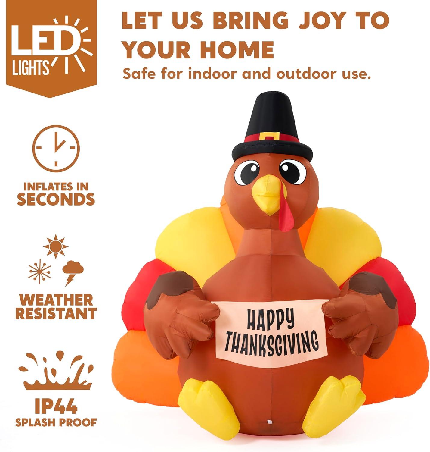 Impressive Size & Built-In Light: Standing at 6 feet tall, this Happy Thanksgiving Turkey Inflatable Decoration features a smiling turkey holding a “Happy Thanksgiving” sign and comes with internal LED lights to brighten up your holiday nights. Comes with everything you need—built-in blower, stakes, ropes, and sandbags for easy, secure setup.