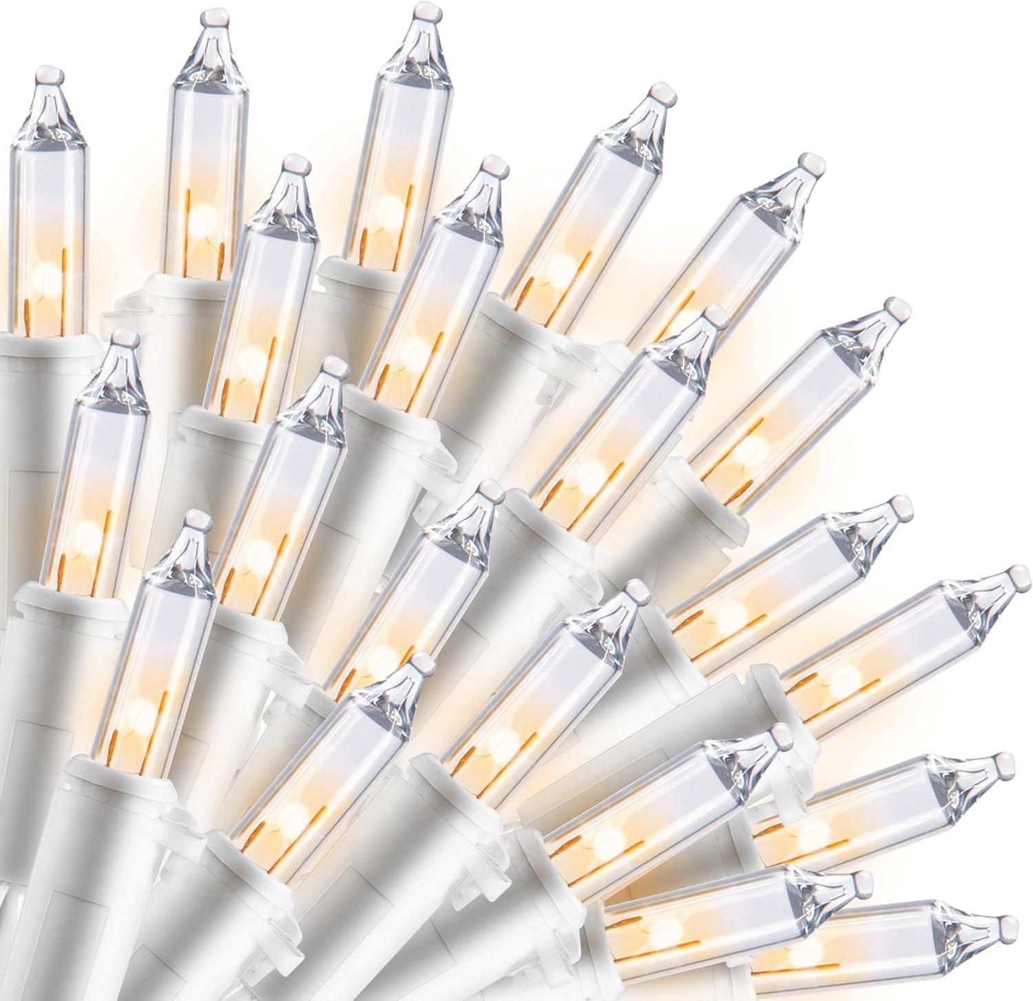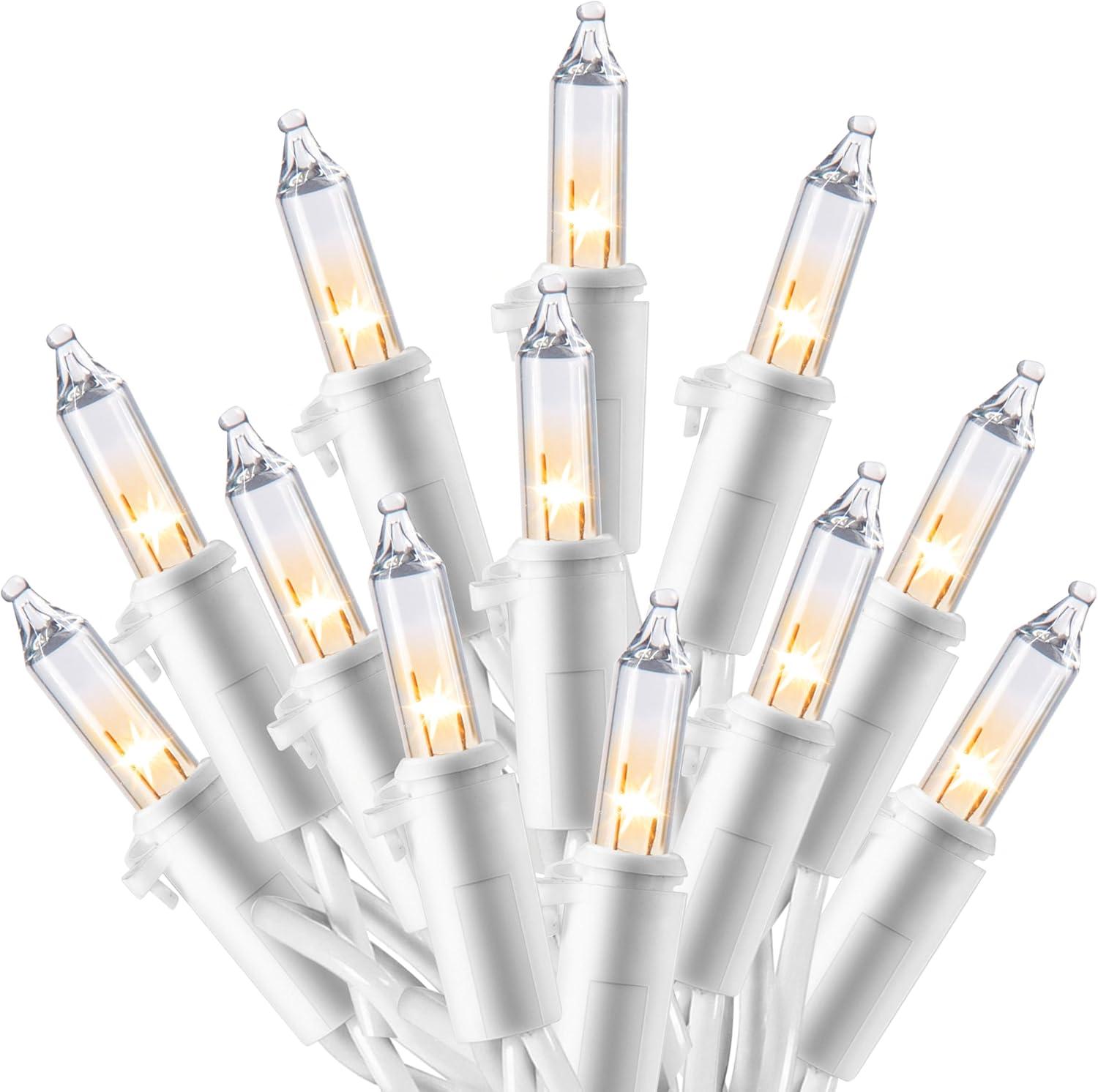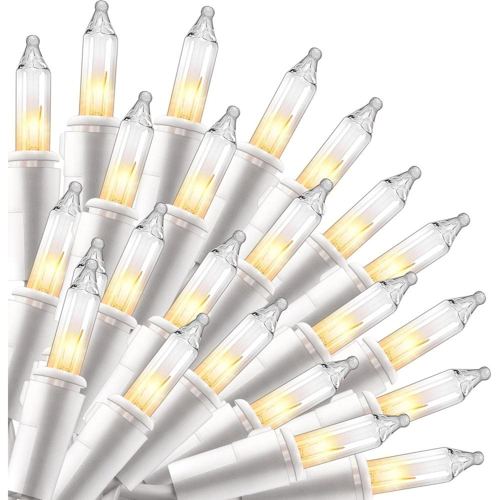 Super Value Pack: 100 Warm White Bulbs on 21.4ft Wire.Get brilliant coverage with 100 warm white T5 bulbs on a 21.4 ft white wire, offering a lighted length of 19.4 feet with 2.36-inch spacing. These high-voltage Christmas lights provide dense, vibrant illumination perfect for wrapping trees, lining roofs, or decorating mantels with a classic holiday glow.