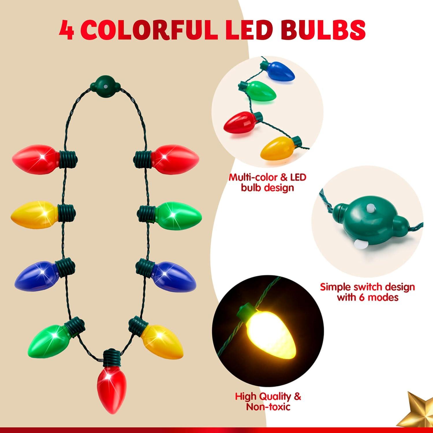 Complete Set: Our Holiday LED Light Up Necklace includes 1 pc of the LED light-up bulb necklace. Each Christmas Led Necklace features 9 plastic light bulbs that emit a vibrant glow, adding a festive touch to your holiday party costume.