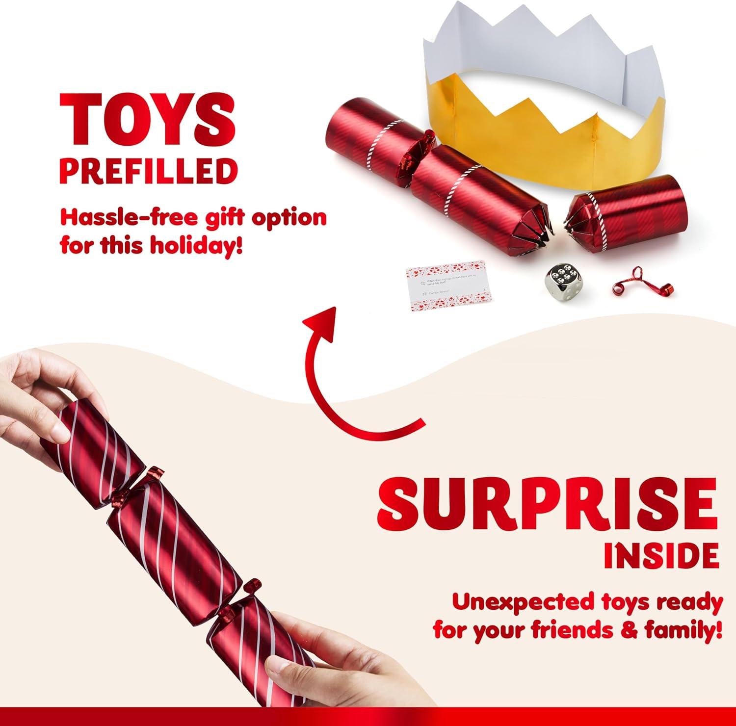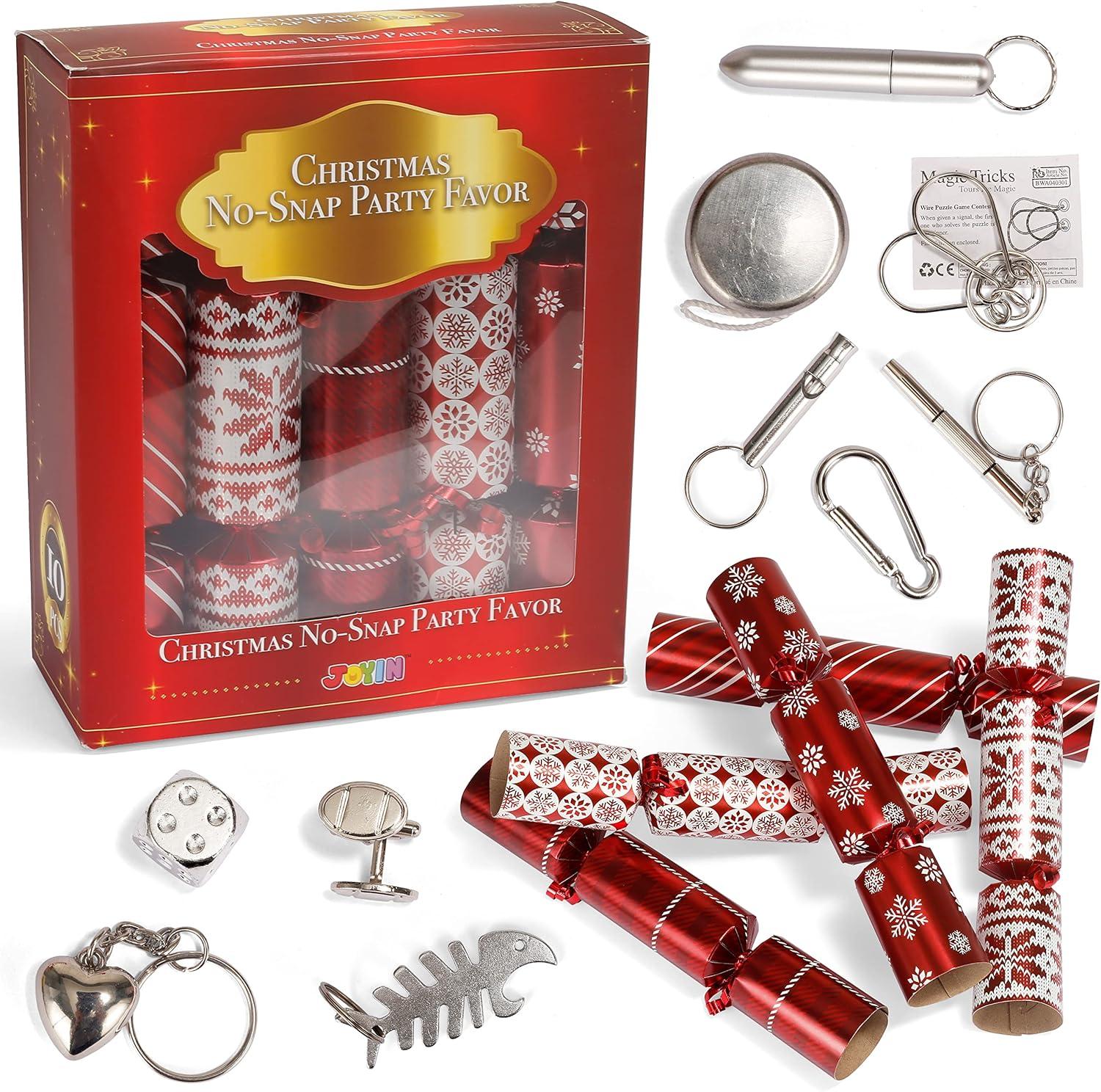 SUPER VALUE PACK: JOYIN Christmas no snap party favor set comes in 10 pieces of 10-inches table favor. Each 10” favor contains a party paper hat, Christmas jokes, and a random little toy or gift inside.