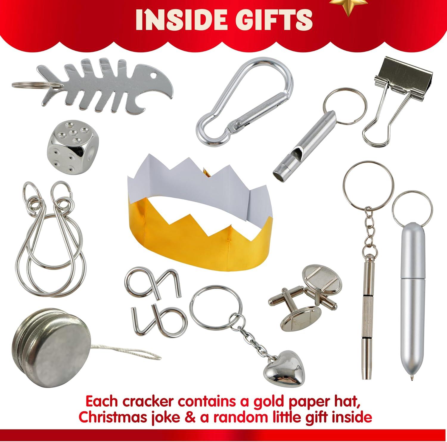 PERFECT GIFT: Our no snap crackers is a perfect party favor for your fall traditional celebration, novelty gifts, birthdays, presents, special occasions, and many more! Gifts include: Playing Cards, Ring Toss, 10 PCS Bowling set, Fortune Telling Fish, Mini Screwdrivers Set, Keyring with label in black, Bottle Opener, Metal Puzzle, Magic Cube & Red Dice.