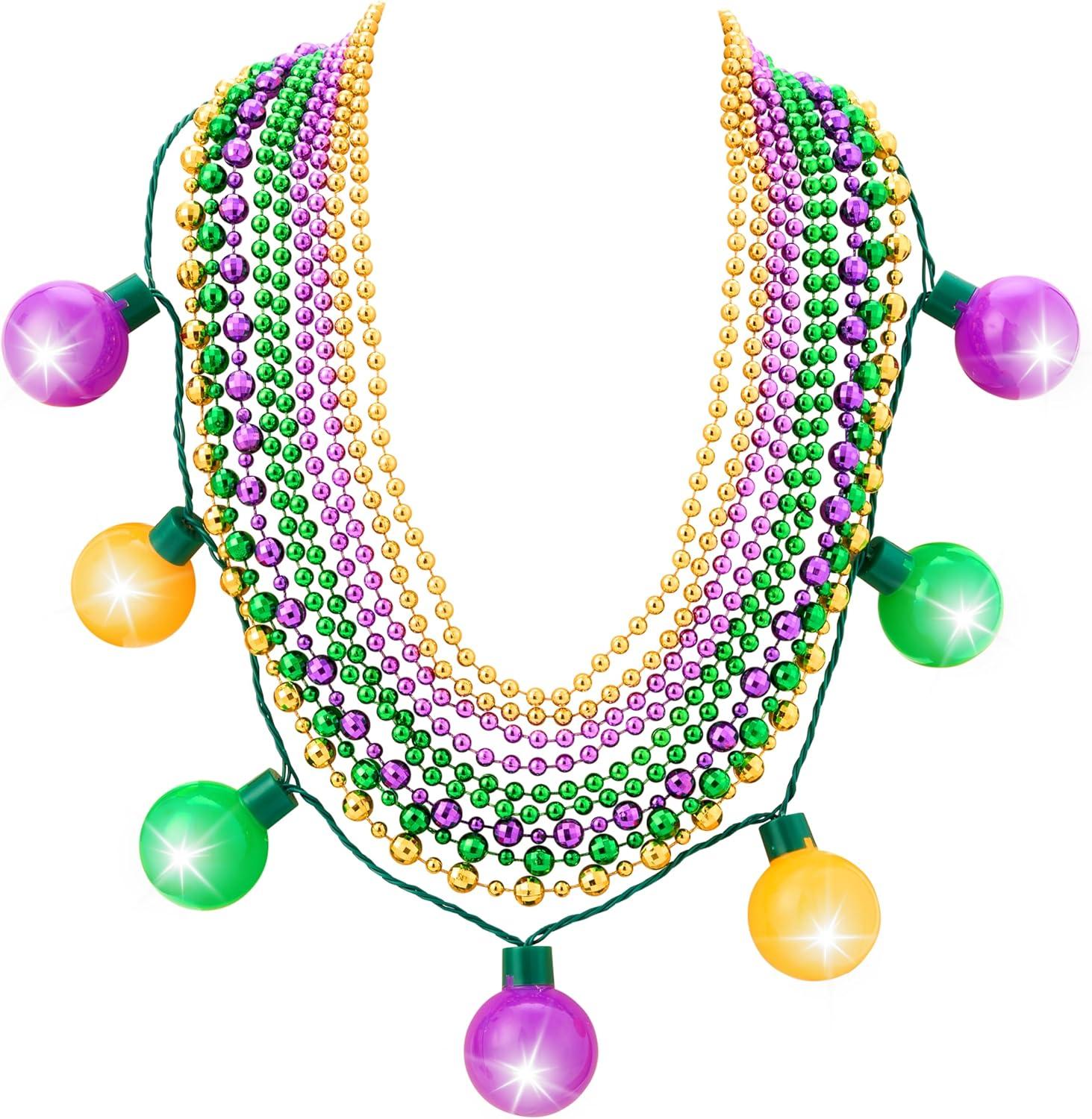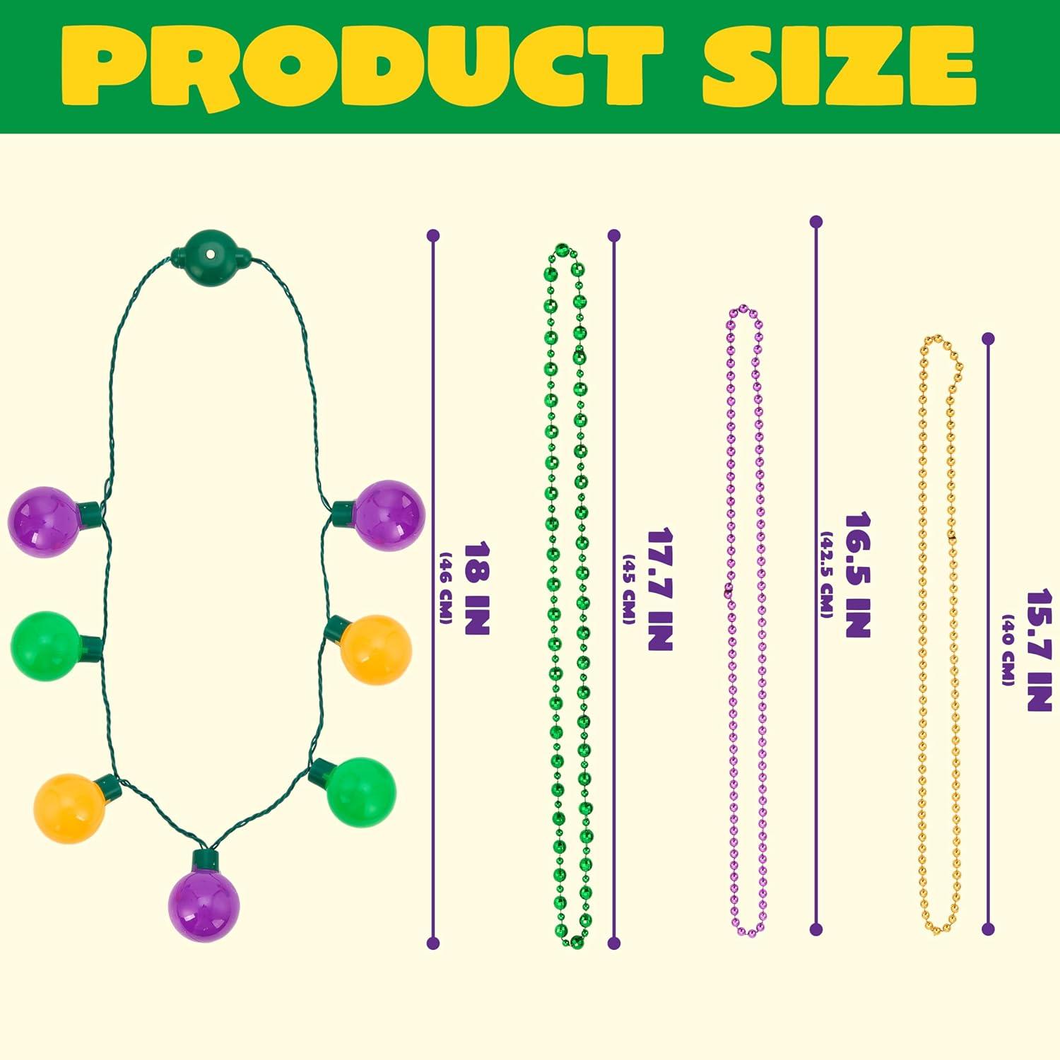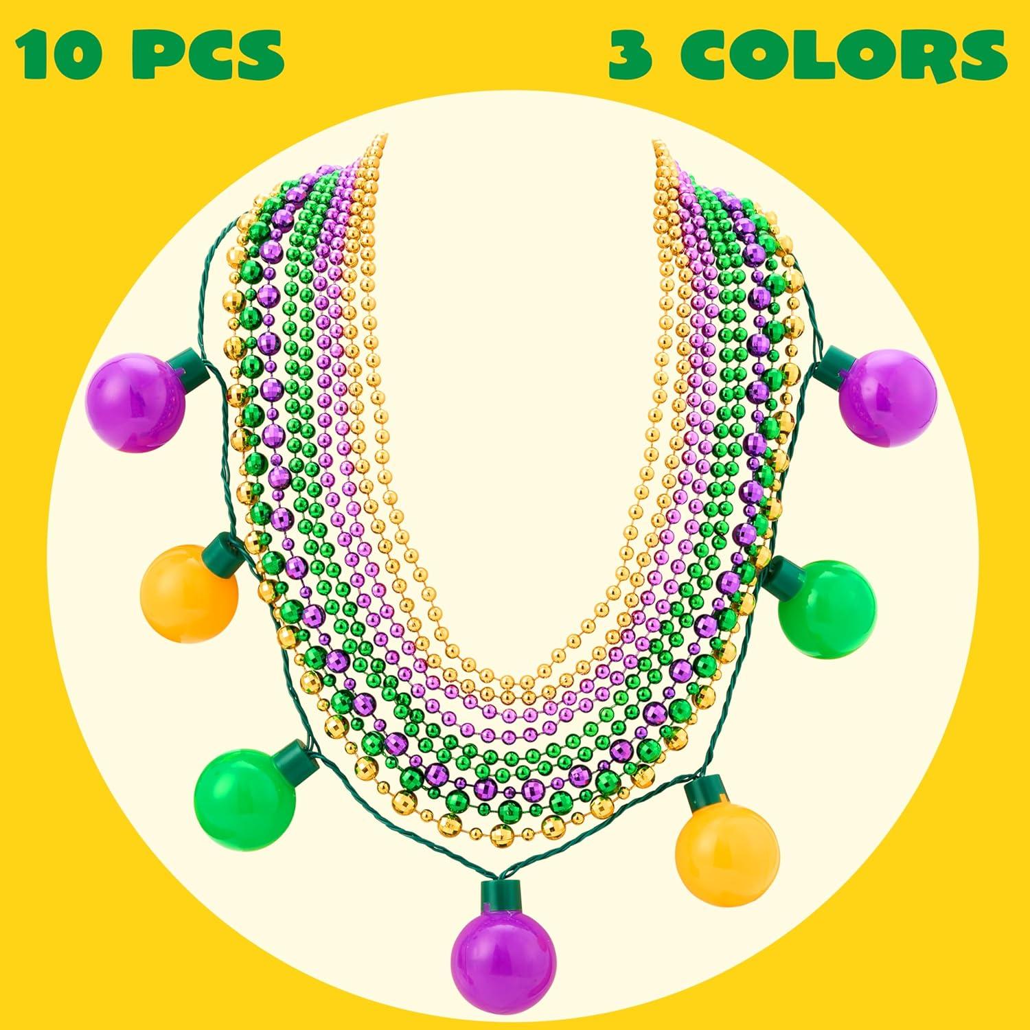 Super Value Pack: This set includes 10 Mardi Gras bead necklaces in total, featuring 1 LED light-up necklace (18''), 3 medium-sized bead necklaces (36''), and 6 small-sized bead necklaces (33'') in dazzling gold, green, and purple colors.