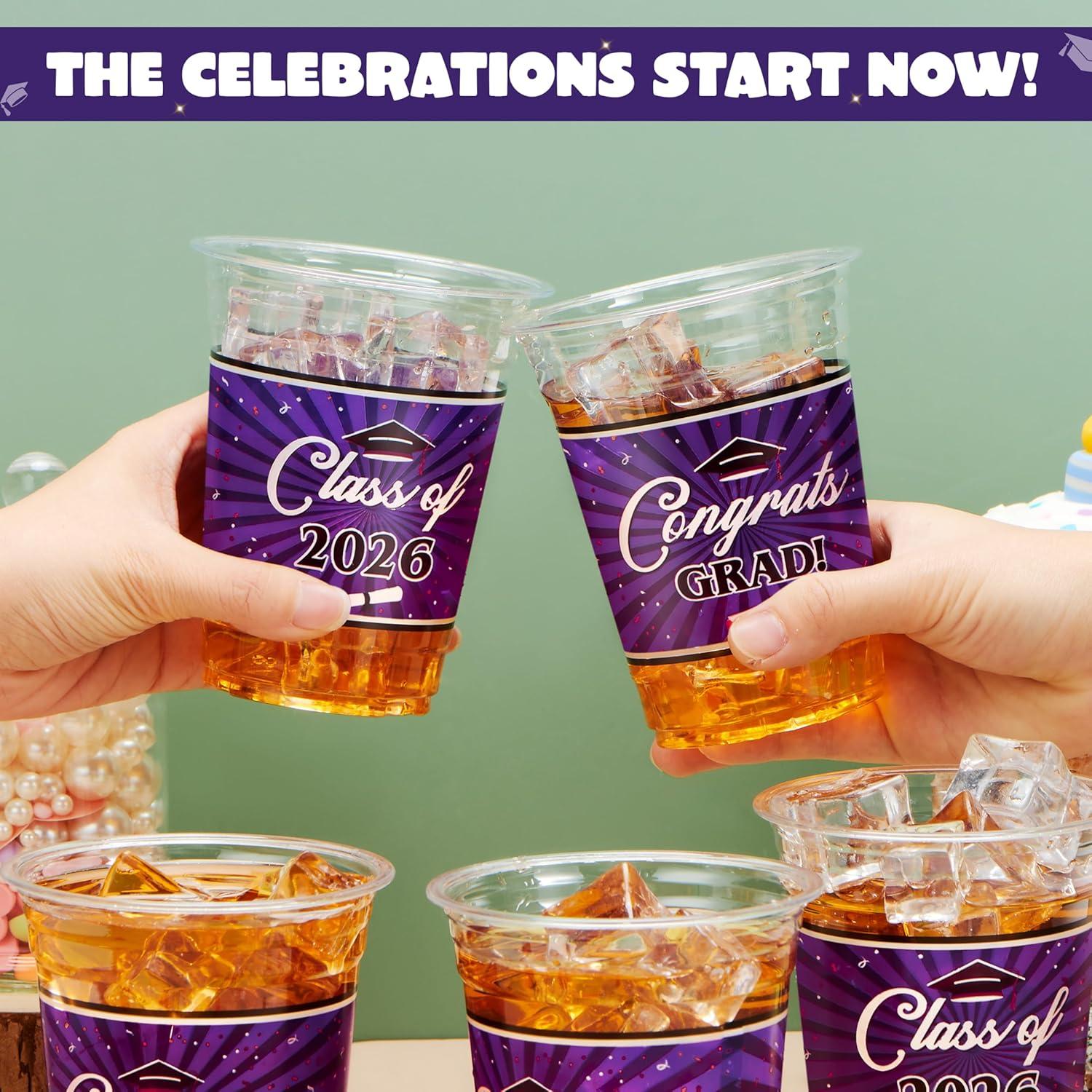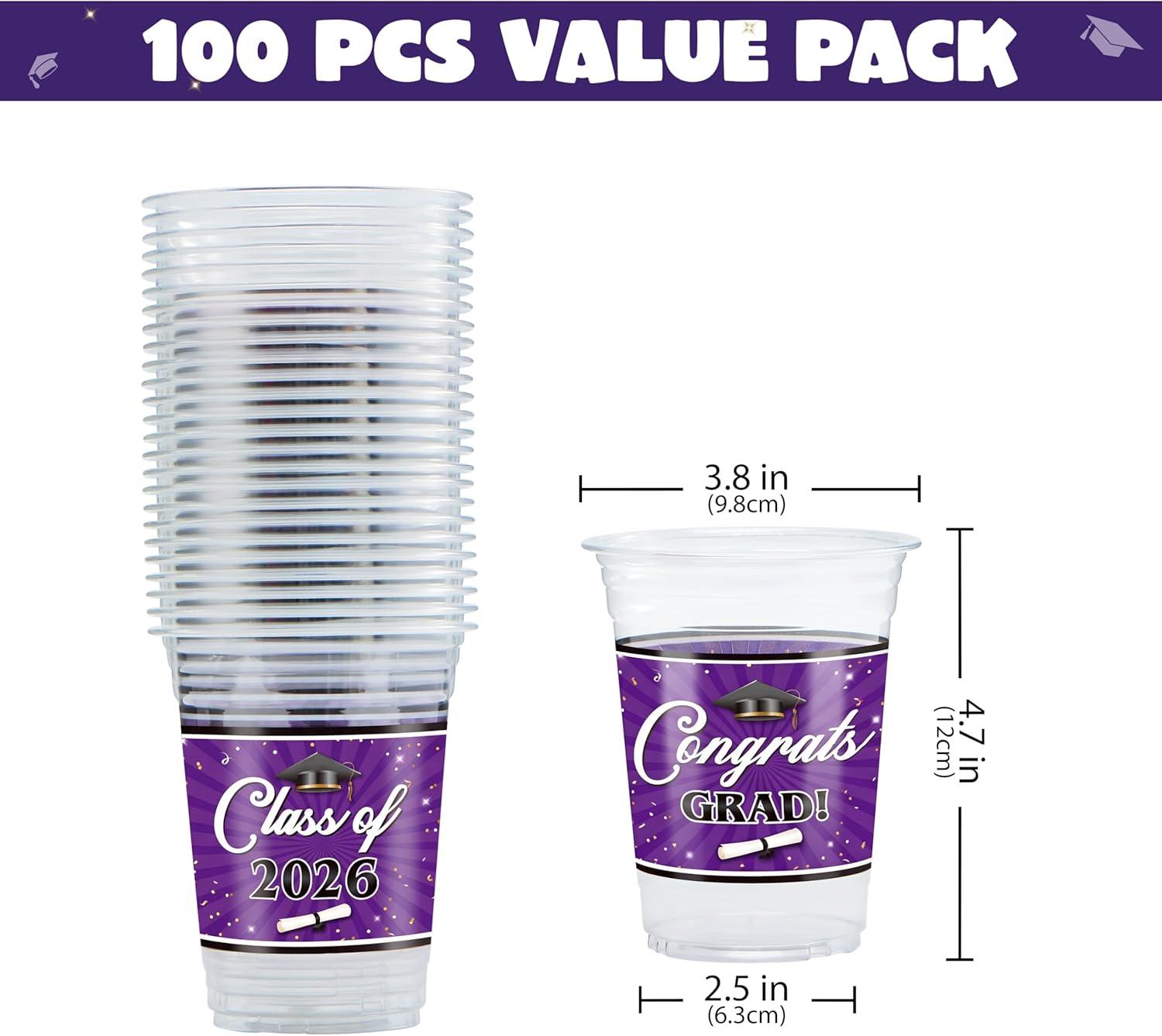 JOYIN 100 Pcs 16oz Graduation Party Plastic Cups (Blue), Grad Disposable Cups for Class of 2026 Graduates, PET Cup Tableware Bulk for 2026 High School College Graduation School Grad Party Supply Decor(Purple)