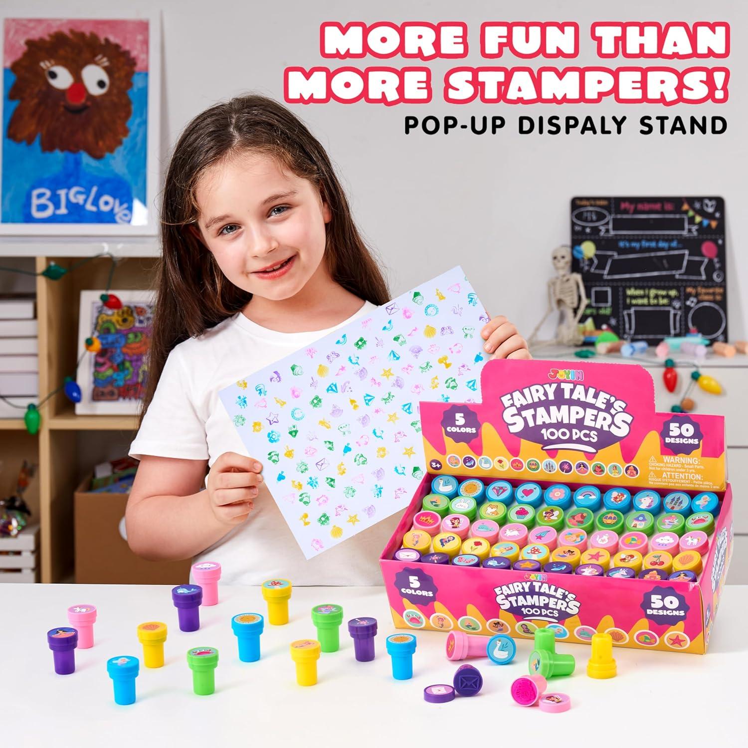SUPER VALUE PACK. Kids Assorted Mini Stampers includes 100 pieces stampers with 50 different designs. Each size is approx. 1.5’’ x 1’’. Comes in 5 different colors: red, blue, green, purple & orange.