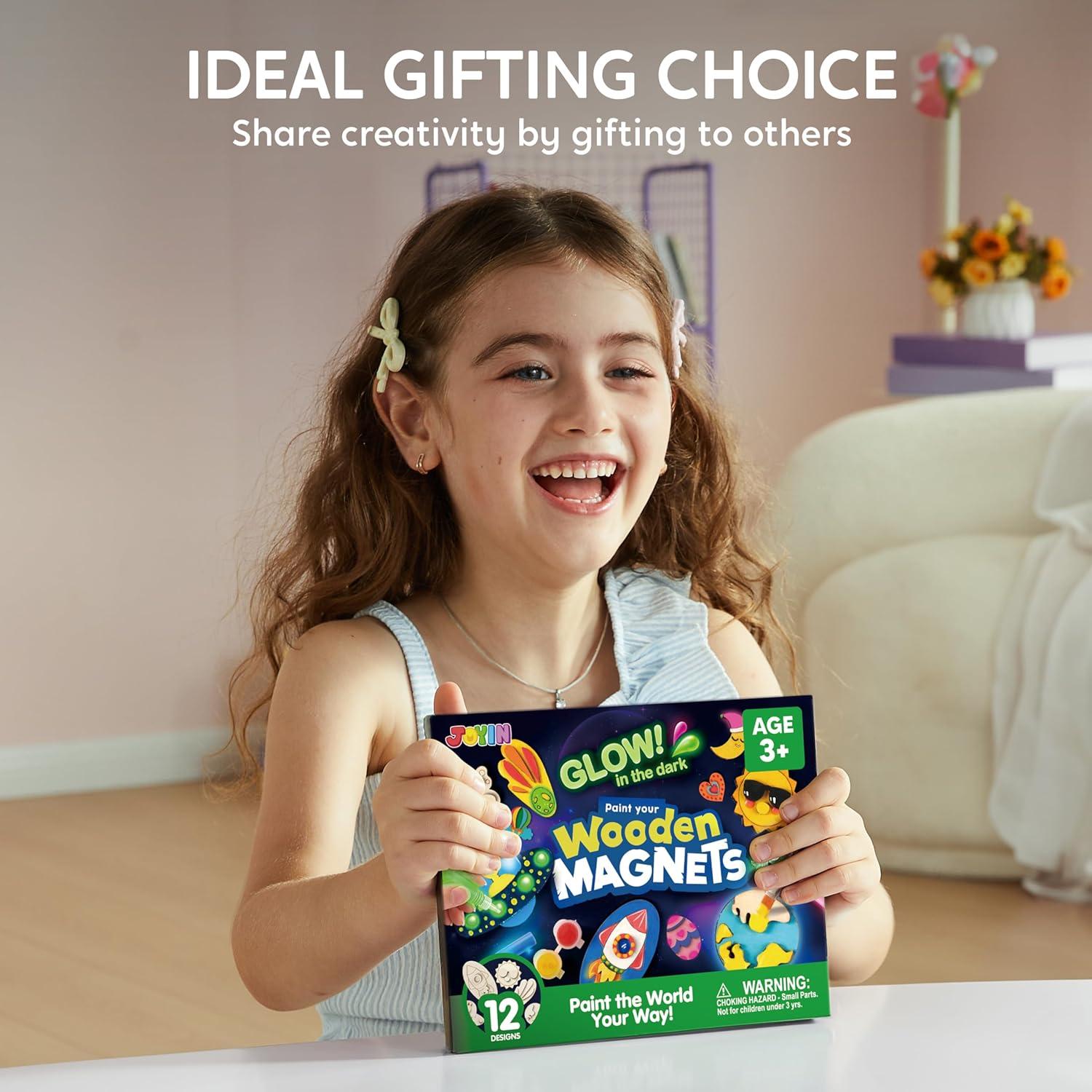 JOYIN 12 Glow in The Dark Wooden Magnets for Kids, Paint Your Own Arts and Crafts Painting Kit, Halloween Crafts Birthday Parties and Family Crafts Gift, Party Favors for Boys Girls Ages 3+(Glow in Space)
