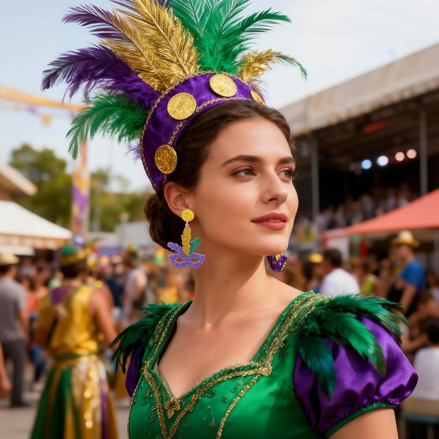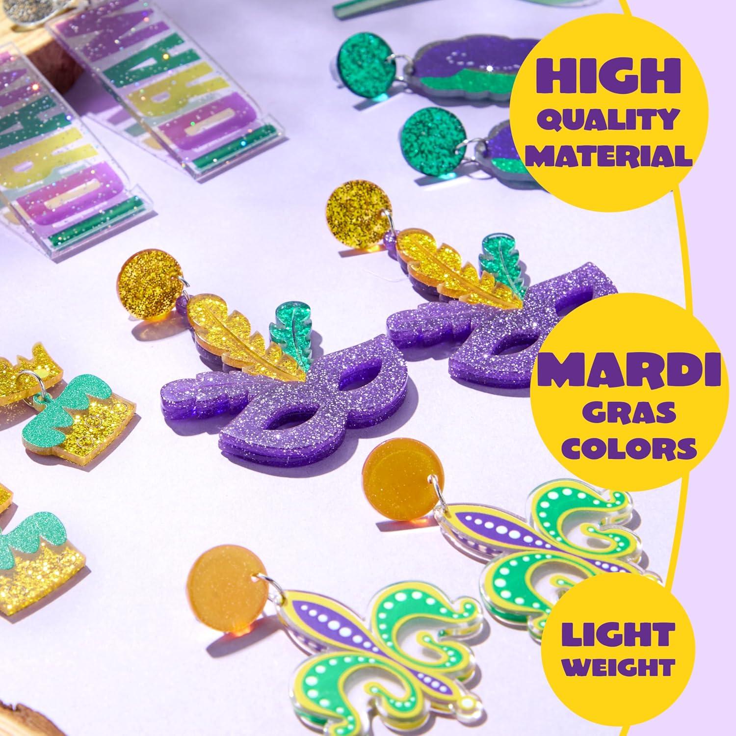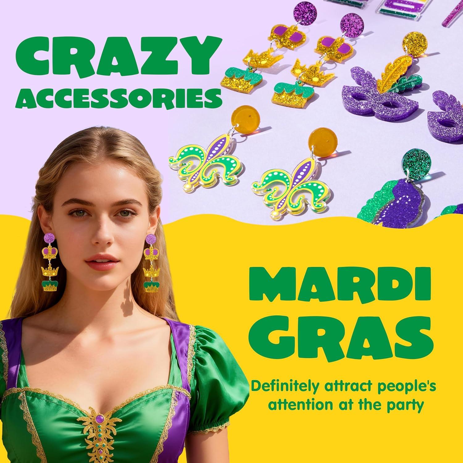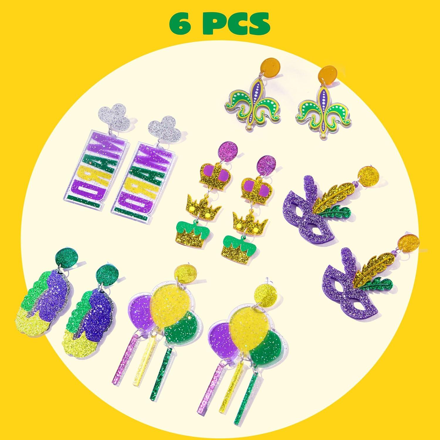 Super Value Pack: In this Mardi Gras earrings set, you'll receive 6 different pairs of Mardi Gras themed earrings. You'll have a unique pair for every party, parade, and festive occasion Mardi Gras Design: Our earrings feature the Mardi Gras colors of gold, green, and purple, adorned with classic Mardi Gras design elements. High Quality: Crafted from lightweight, non-toxic, and safe materials, these Mardi Gras earrings are designed to be comfortable and durable. You can wear them all day and night as you celebrate Mardi Gras without feeling weighed down. Wide Applications: Wear them as part of your Mardi Gras costume, use them as Mardi Gras decor, or share them with friends and guests as party favors. Mardi Gras Accessories: This Mardi Gras earrings set offers instant festivity and charm to your Mardi Gras celebration.