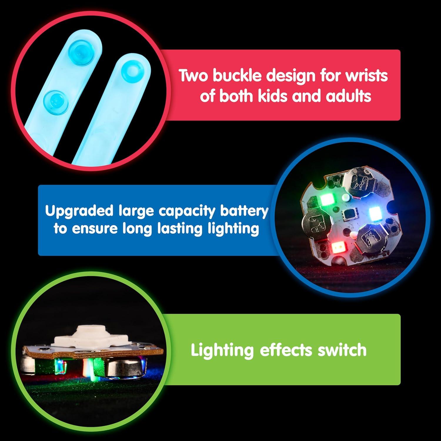 TRENDY GLOW ACCESSORY FOR EVERY EVENT: Stand out in the crowd with these eye-catching, futuristic bracelets. Perfect for Halloween parties, nighttime events, or sensory play, they provide visual stimulation and help ease restlessness while adding a playful glow to any Halloween costume.
