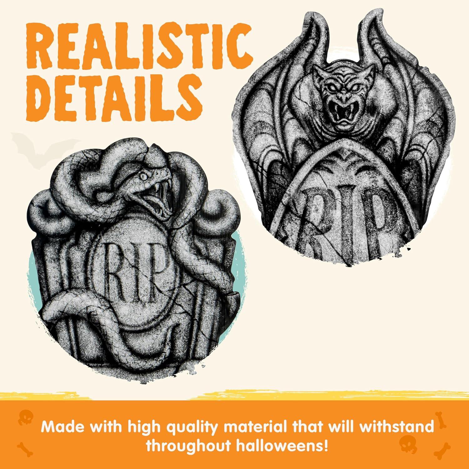 Versatile Halloween Use: Whether you're hosting a Halloween party or just want to add some spooky flair to your yard, these tombstones are perfect for outdoor decor. Lightweight for easy repositioning. Simply place them in your yard, lawn, or garden to create an instant graveyard ambiance.