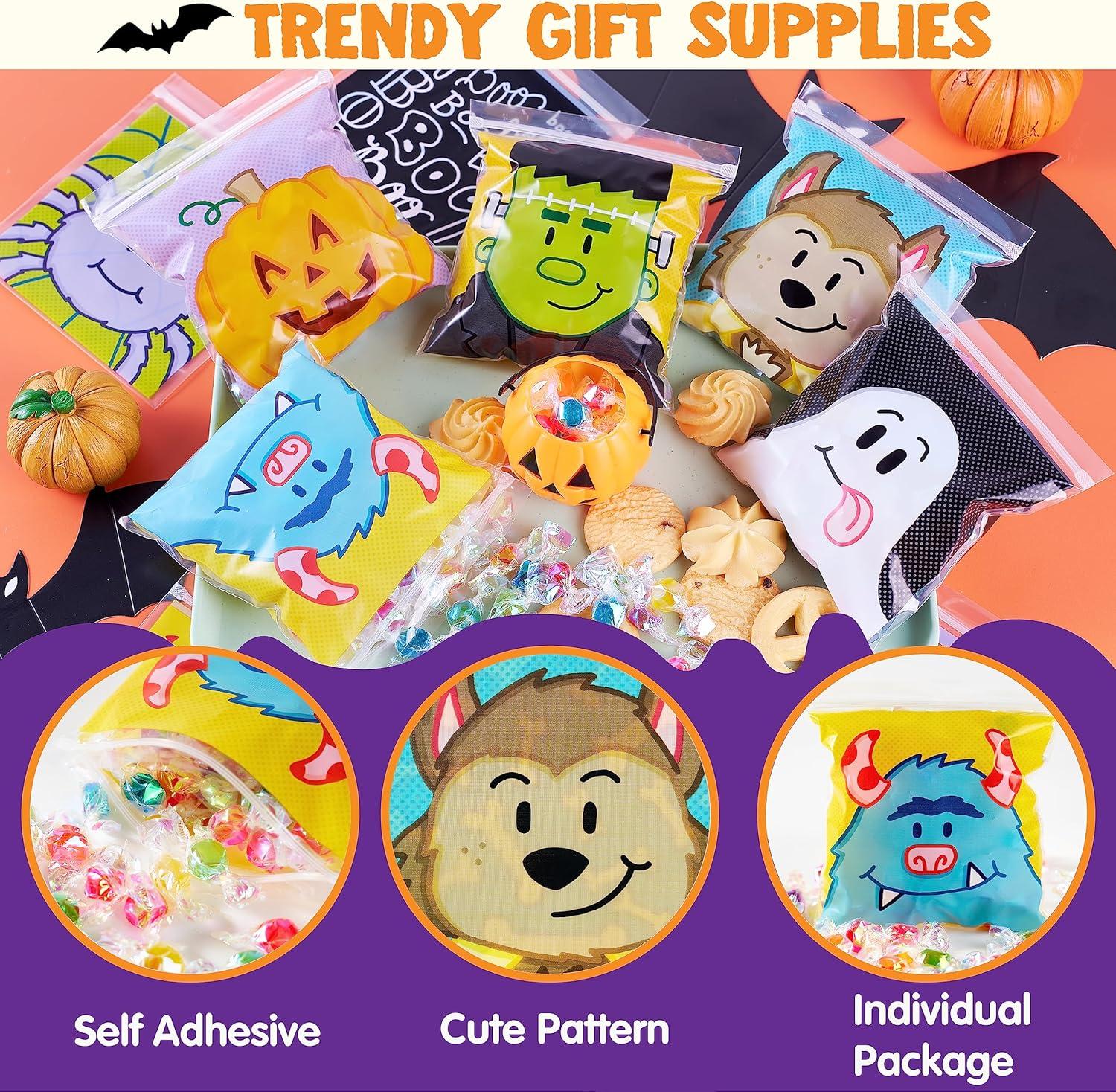 Super Value Pack. Our Halloween Candy Bags for Party includes 150pcs of Halloween Cellophane Bags in 6 Character Designs. These adorable Halloween bags for trick or treating feature a super vivid design that will surely make trick or treating fun, creepy and exciting.