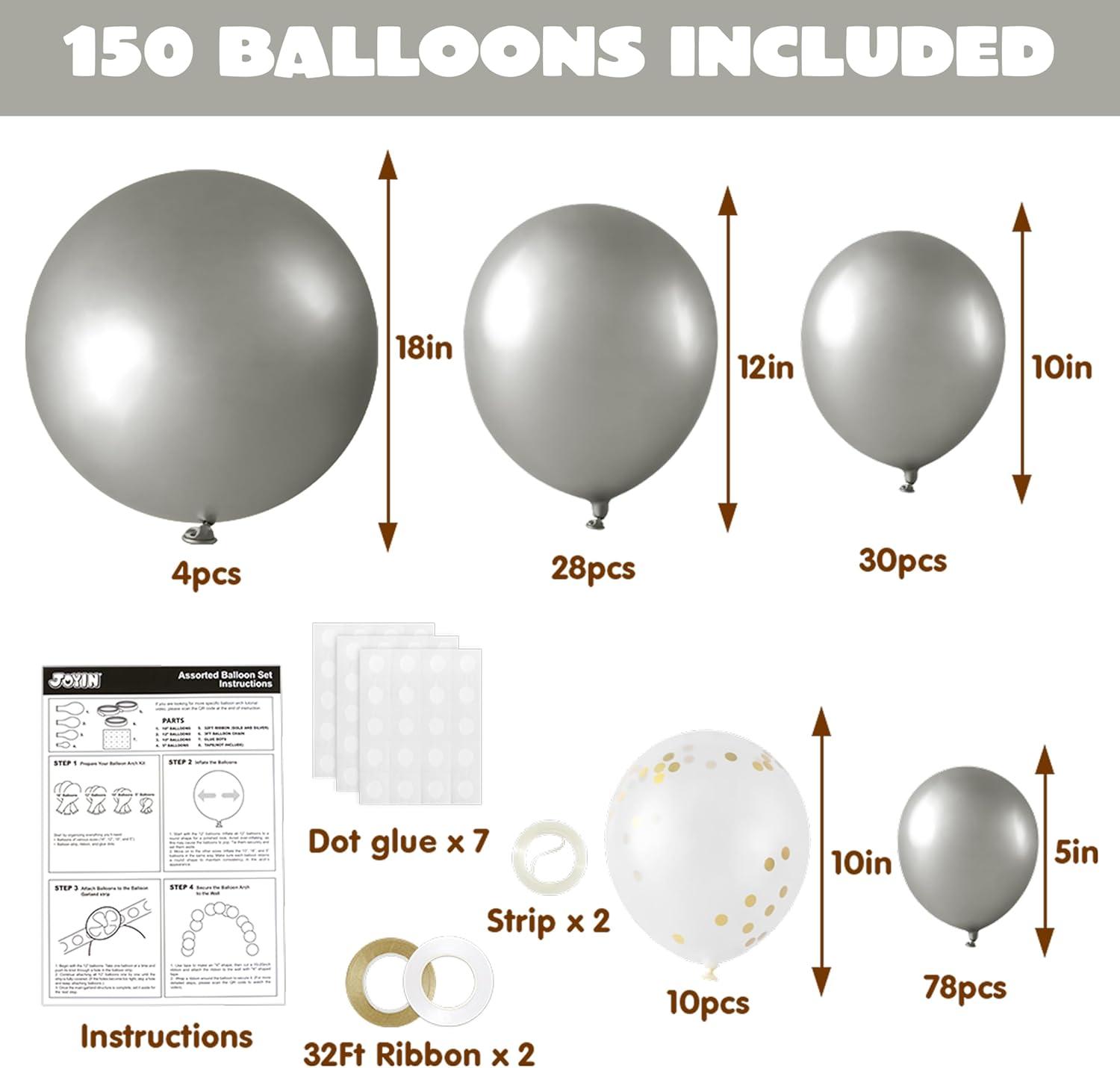 JOYIN 150 Pcs Sand White Balloons, Different Sizes 18 12 10 5 Inch Sand White Latex Balloon Arch Kit with Instruction for Birthday Party Graduation Wedding Holiday Decoration(Silver)