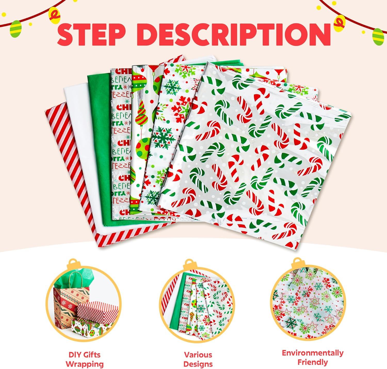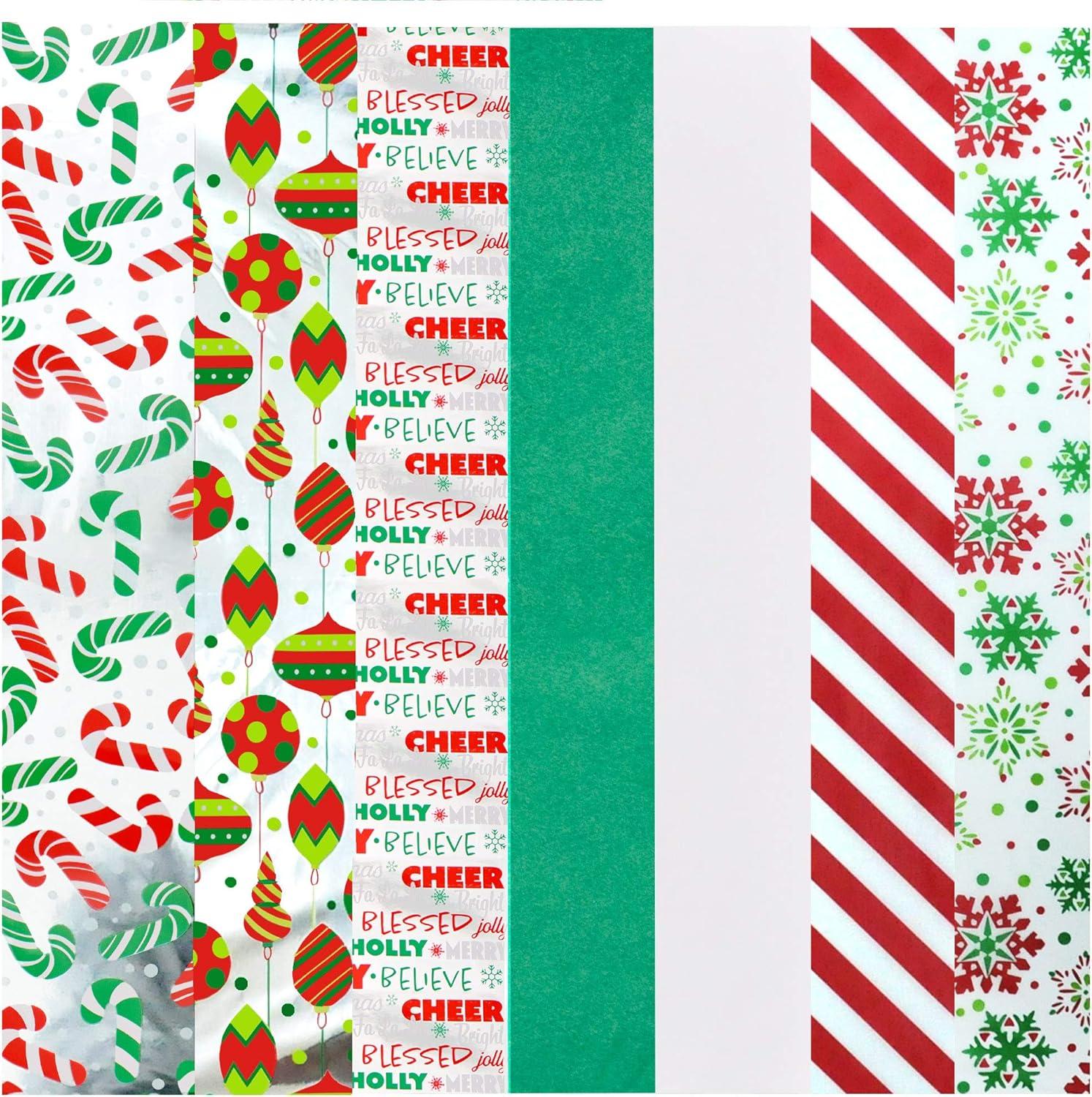 SUPER VALUE PACK. Holiday Tissue Paper Assortment (seven Colors) Gift Tissue Paper includes 150 pcs of Holographic and Printed Tissue Paper. Each sheet measures 20″ x 20″ inches. These are High Quality Tissue Paper and 100% Recyclable Paper.
