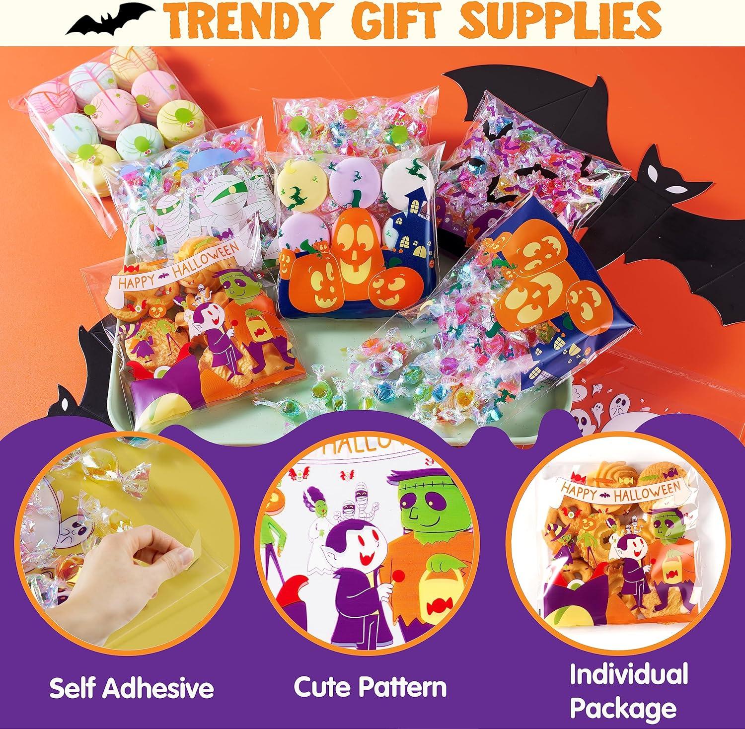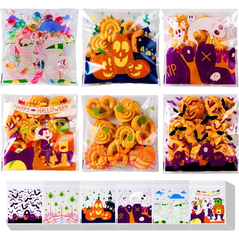 Value Set. Our Halloween Cellophane Bags include 150 pcs of square 5×5 inch goodie bags with 6 different character designs for Halloween.