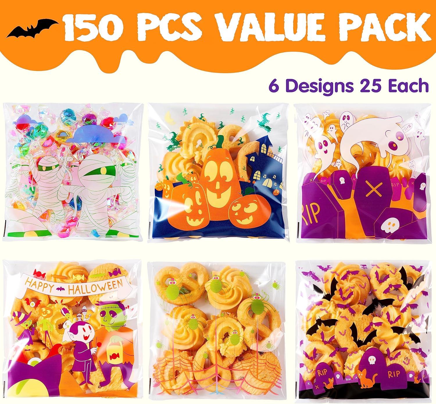 JOYIN 150PCS Halloween Cellophane Treat Bags, Halloween Goodie Candy Bags, Clear Self-adhesive Bag, Plastic Cookie Bag Bulk for Kids Trick or Treating, Classroom Party Favor Supplies in 6 Designs(Multicolor)