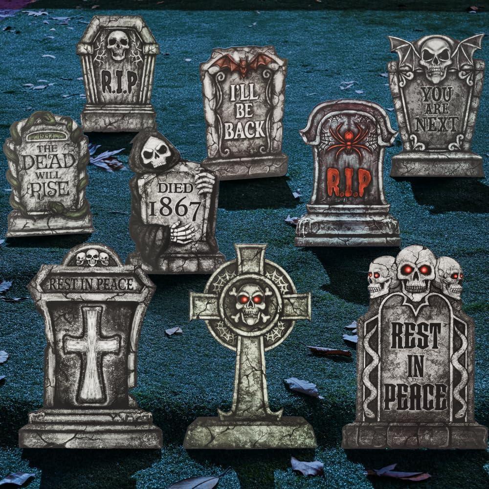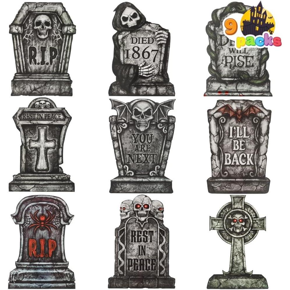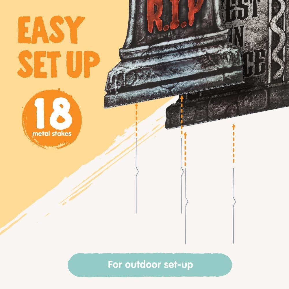 Super Value Set: With this set, you'll receive 9 different tombstones with 18 metal stakes, each tombstones standing at a spooky 16 inches tall. It's a super value set that ensures you have everything you need to create a hauntingly unforgettable graveyard scene in your yard!