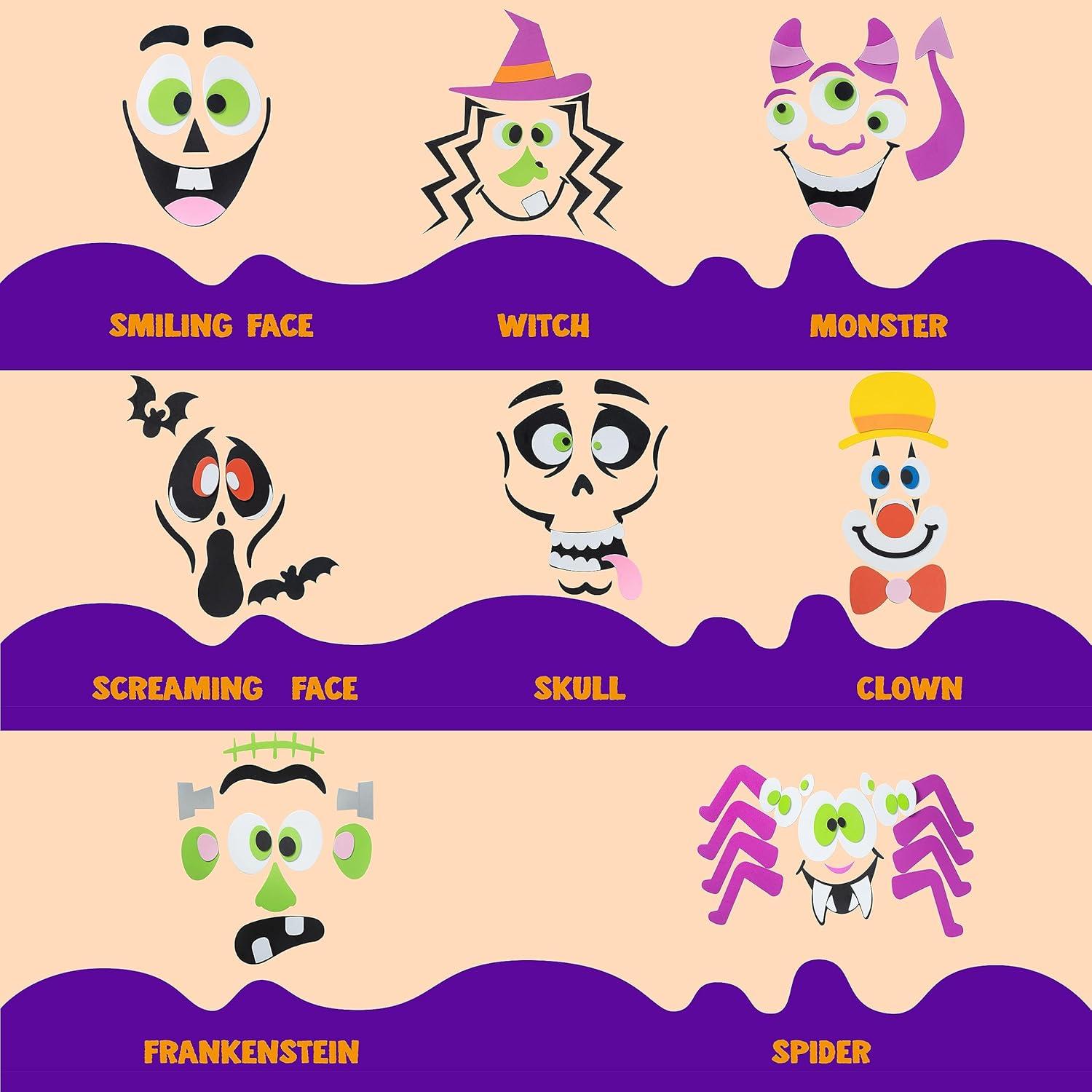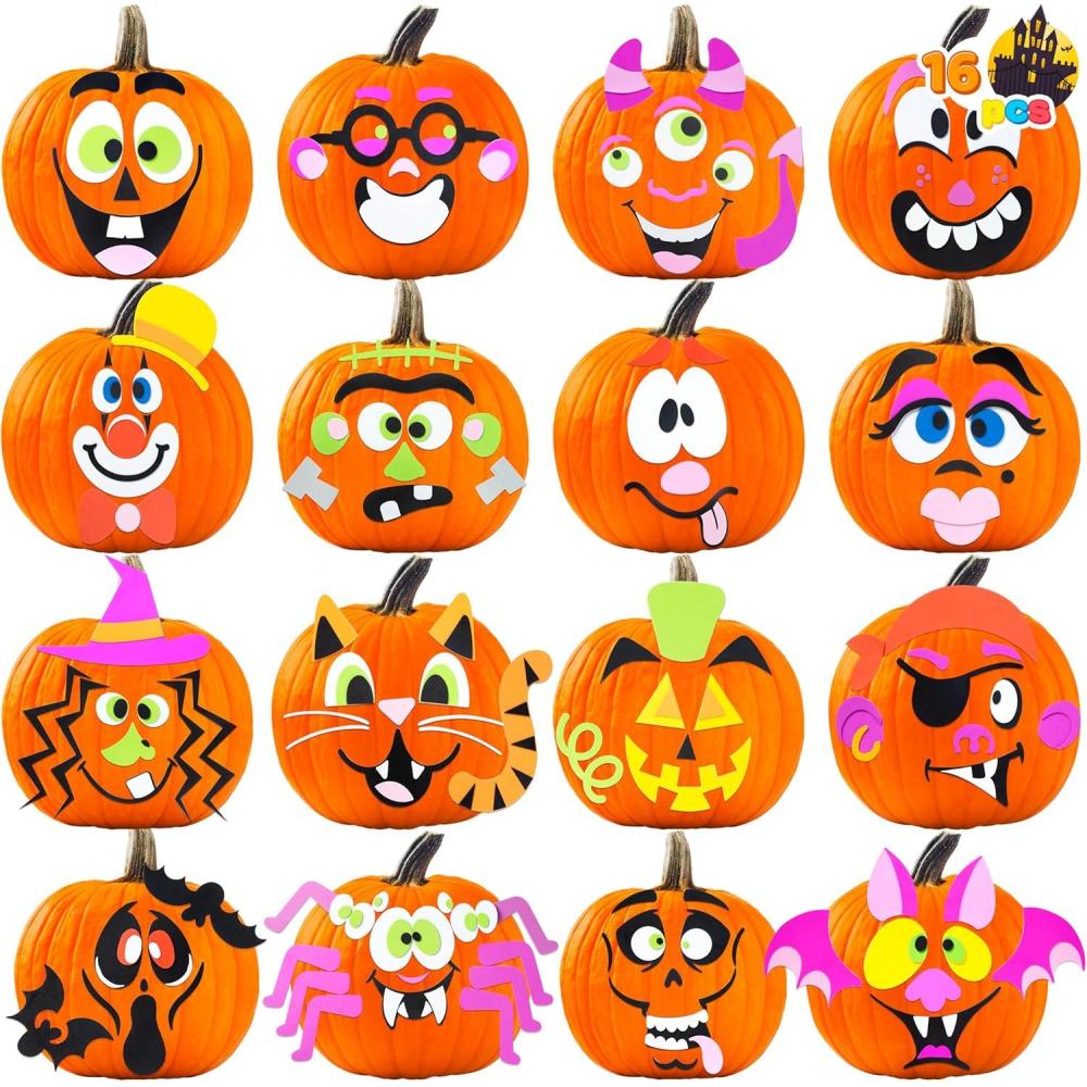 SUPER VALUE SET. 16 Packs Pumpkin Decorating Craft Kit Stickers in 16 Design Faces. Including Jack-o-Lanterns, Witch, Warlock, Vampire, Bat, Zombie, Skeleton, Ghost, Cat, Frankenstein etc.