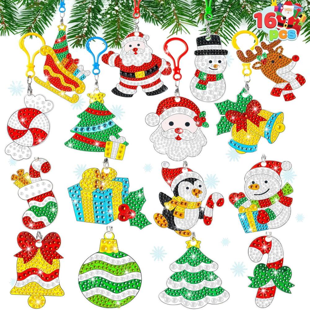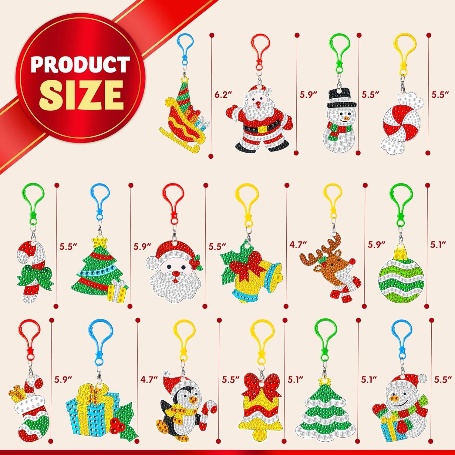 Package Content: Our Christmas Diamond Art Decoration Kit includes 16 ornaments. Let your imagination run wild with the art kit featuring 16 unique designs. Additionally, it contains 4 waxes(0.8''*0.8''), 1 rhinestone picker, 1 tray, and 16 lobster clasps. This kit empowers you to unleash your imagination and create imaginative Christmas decorations. (Age 8+)