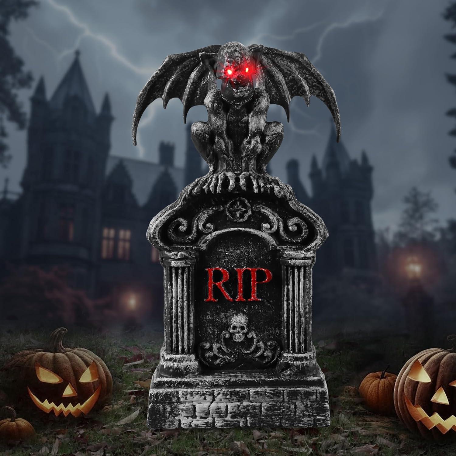 Unique Design: Combine classic tombstone aesthetics with modern technology – imagine weathered stone textures, bat wings, Gargoyle heads, and mysterious epitaphs, paired with LED-lit electronic Halloween decorations to bring your horror scenes to life.