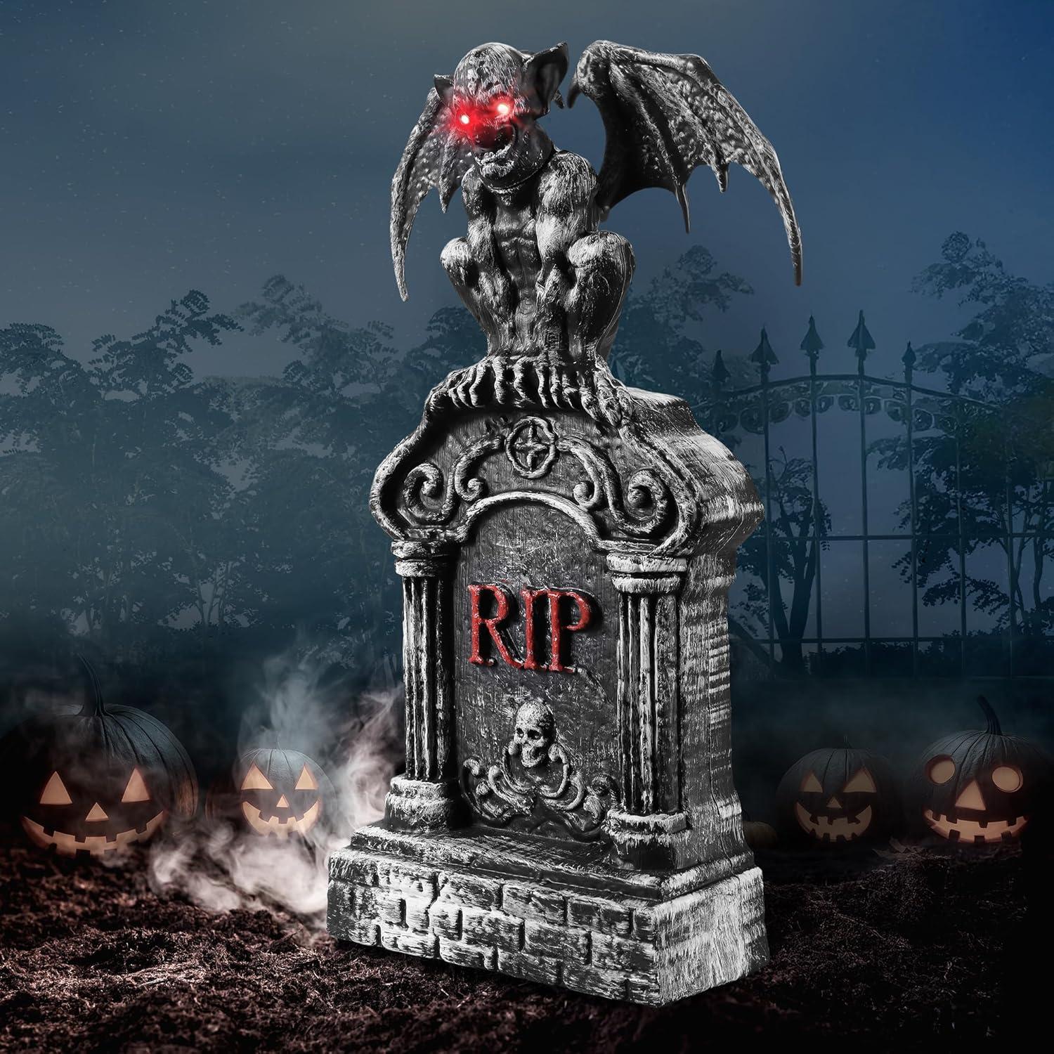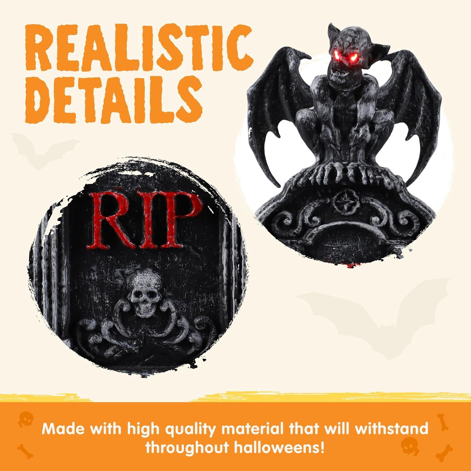 Premium Quality & Easy to Use: Crafted from high-impact plastics, this halloween animatronics tombstone can use year after year. Requires 3 AA batteries (not included), you can be placed anywhere you want, perfect for lawns, porches, themed parties, aisle or corridor, whether it is for your home yard, cemetery scene or Halloween party, our props are perfect and fit the Halloween theme.