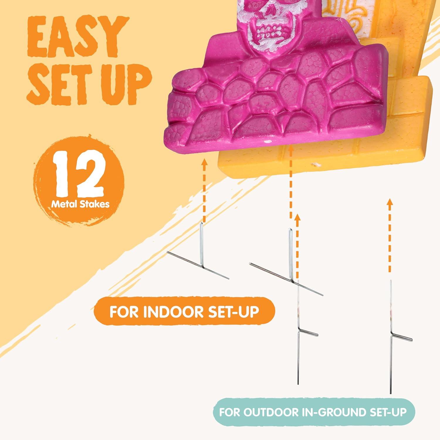 EASY TO USE: Halloween tombstone set tombstones are made of foam material and come with metal ground stakes, which can better fix them. There are two ways to install ground plugs. Method 1: You can insert the short side of the stake plug is inserted into the tombstone and place it in the courtyard or garden, but cannot be inserted into the grass. Method 2: You can install the long side of the ground plug is inserted vertically into the tombstone and can be inserted in the graveyard, yard, garden or other relatively soft places. The installation method of the ground plug can refer to the installation step diagram.