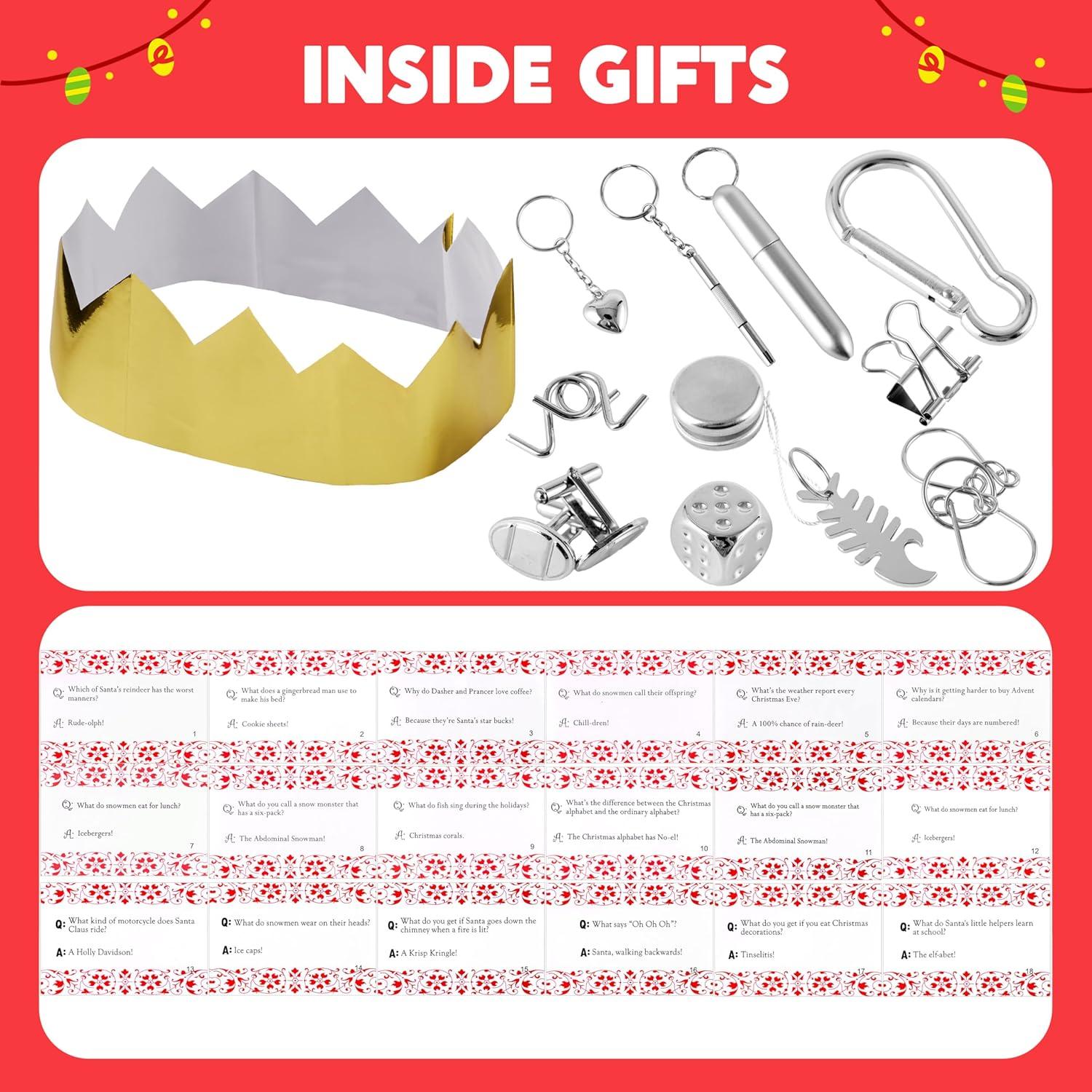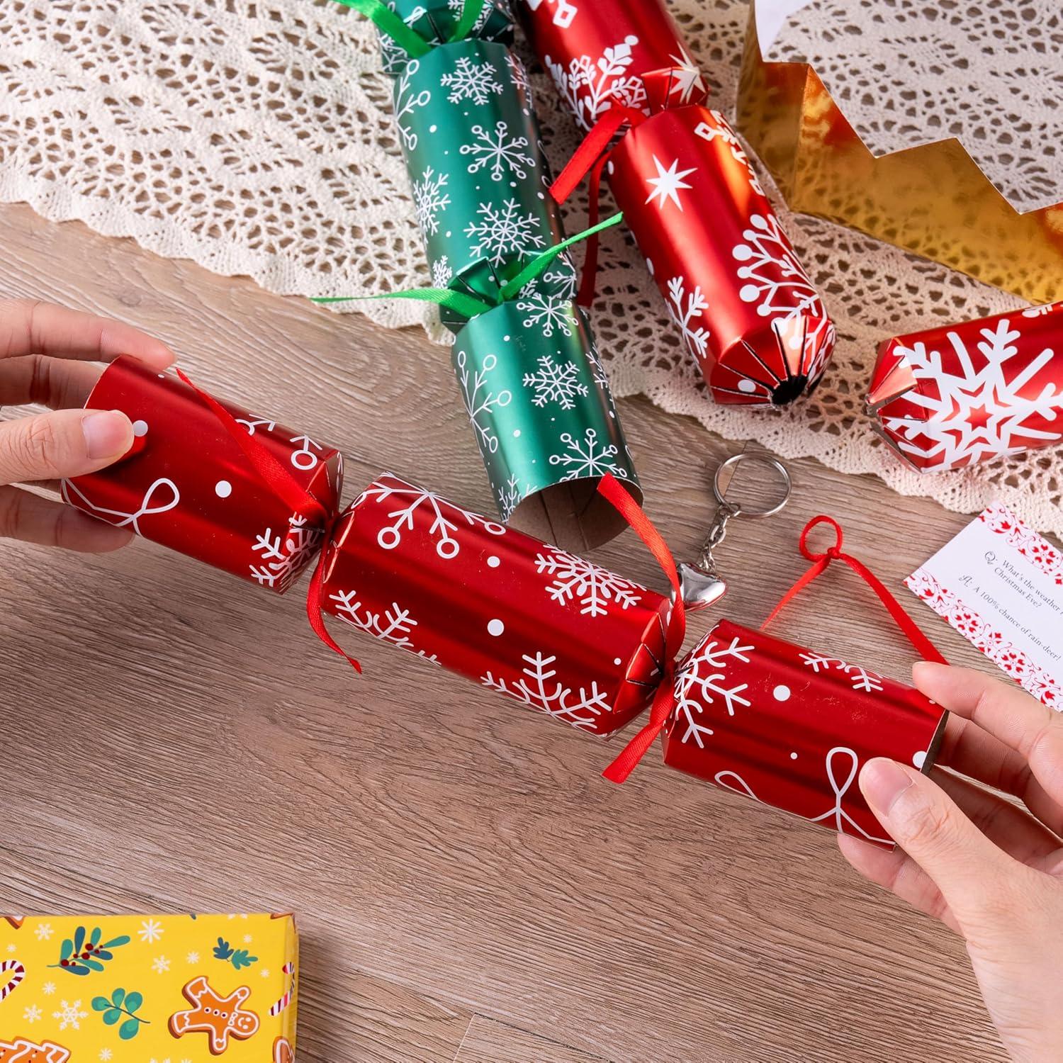 Xmas No-Snap Party Favor: Our Holiday Party Favor Set includes 18 packs of Christmas party table favors with snowflake designs. Each party favor contains a paper crown hat, a Christmas joke paper, and a random gift inside.