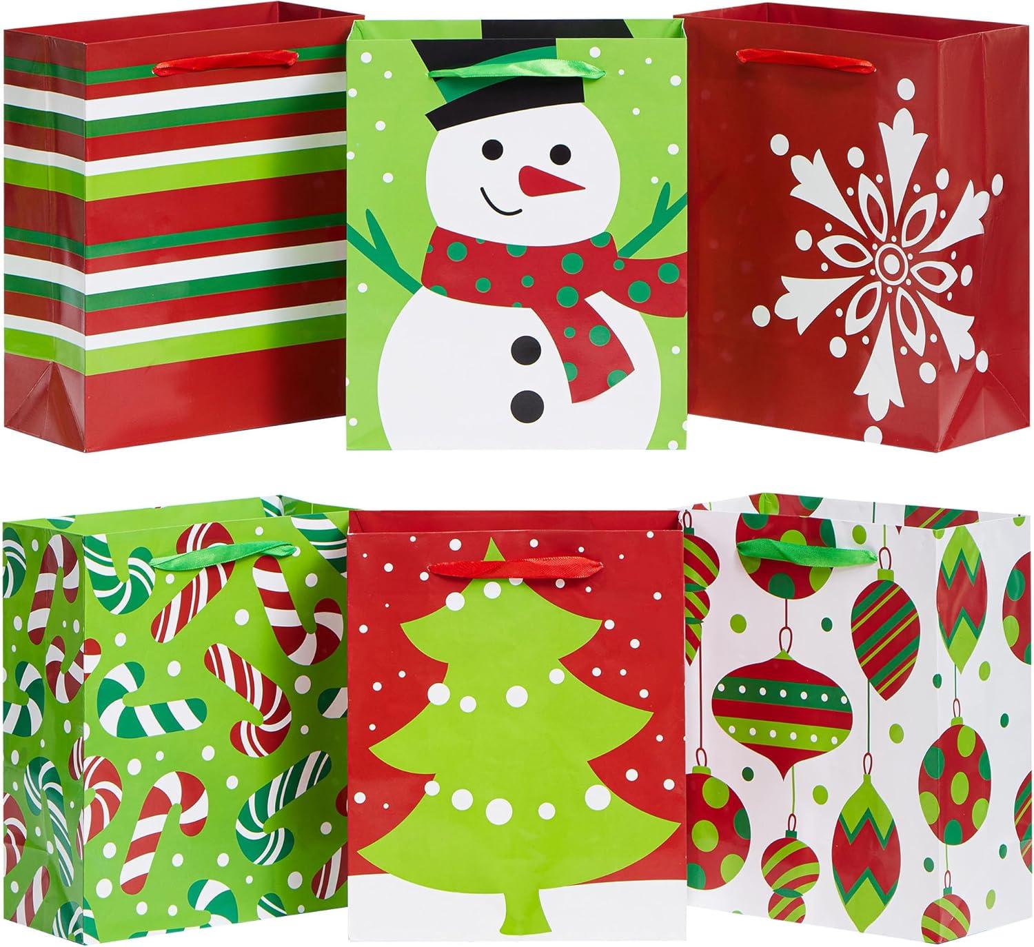 Convenient Size: Our Xmas Gift Bags include 18 pieces of Paper Gift Bags with 6 designs (Snowflakes, Christmas tree,Candy Canes, Stripes, Snowman, Ornaments), measuring 9″ x 3.5″ x 7.3″. These christmas paper gift bags are the perfect size for wrapping various presents, from small trinkets to medium-sized gifts. The ample capacity makes your gift wrapping easy and hassle-free.