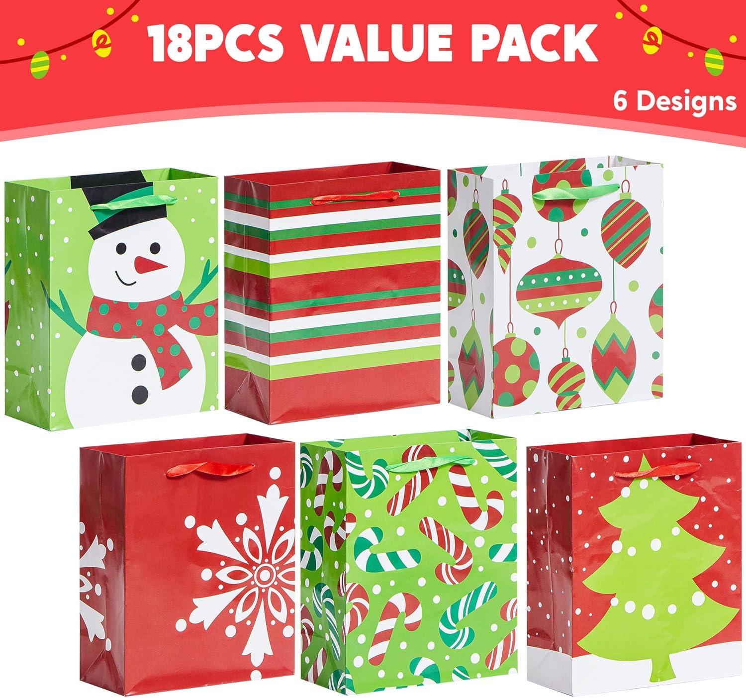 JOYIN 18 PCS Christmas Paper Bags for Present, Xmas Gift Wrap Bags with Handles for Wrapping Xmas Holiday Presents, Thanksgiving Gift Decor, Classroom and Party Favors (9"x 3.5"x 7.3")
