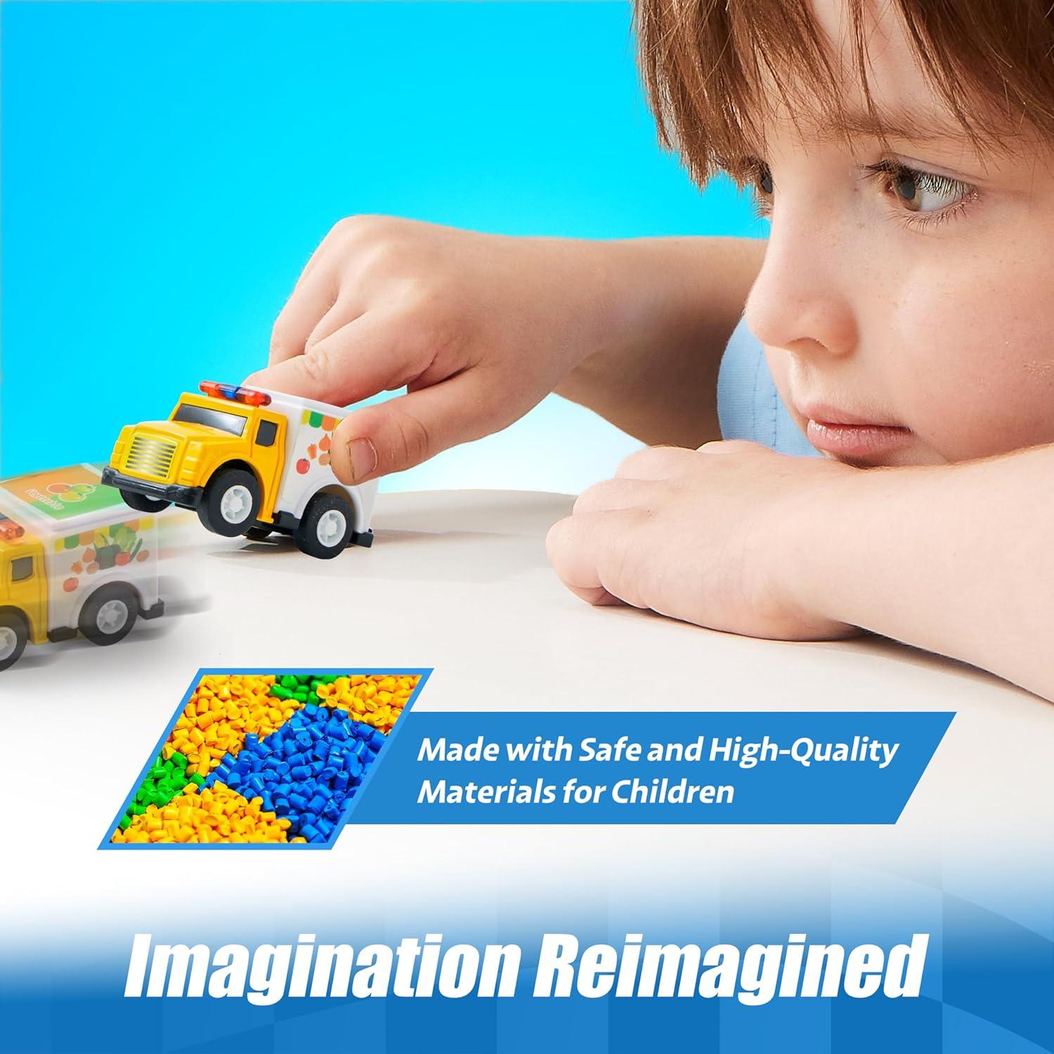 REAL FUNCTION. Our Push-n-Go Pull Back Assorted Vehicles Toy Set for Toddlers & Kids can withstand rough use and bumps on the wall! There are no sharp edges or corners that can hurt your child. Bright and colorful. Friction powered, no battery needed. Just pull it back and let it go forward naturally, the smooth wheels can keep the car running for a long time.