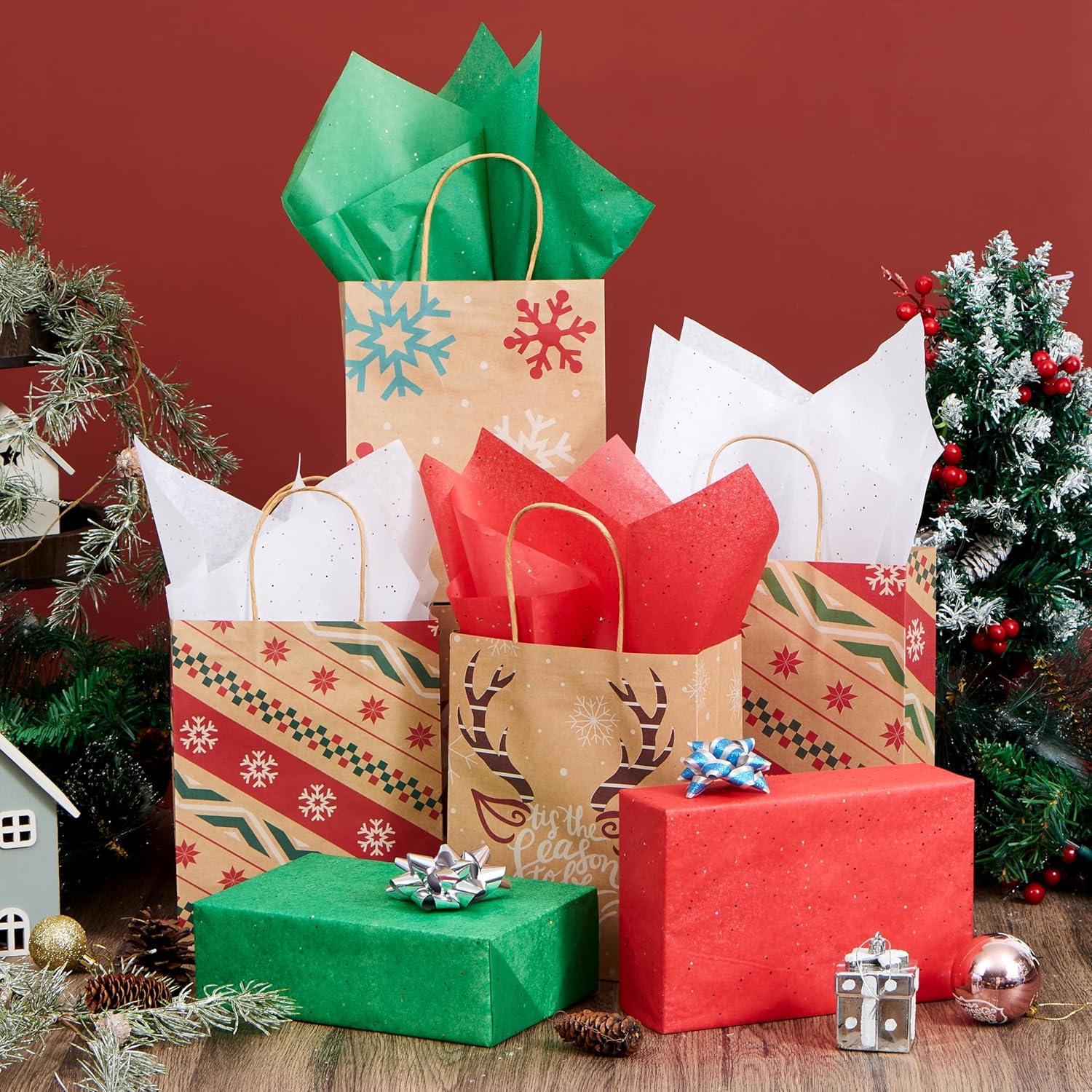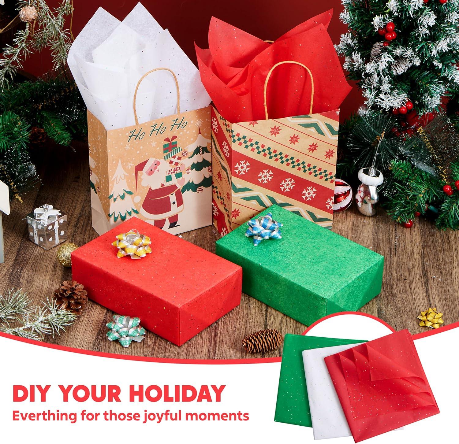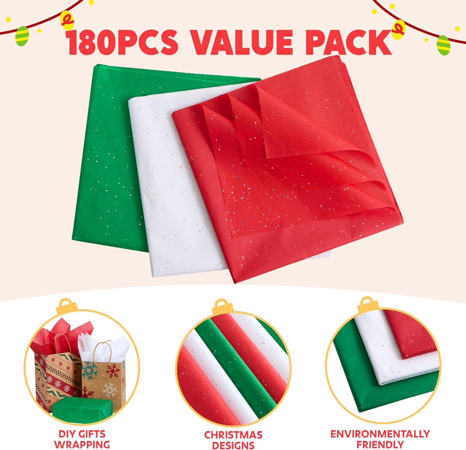 Christmas Wrapping Paper: Elevate your gift wrapping with our 180 sheets of glitter tissue paper set. Include 60 Sheets of red tissue paper, 60 sheets of green tissue paper, 60 sheets of white tissue paper, and each wrapping paper sheet measures 20*20 inches.