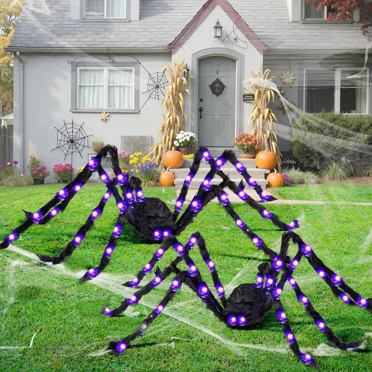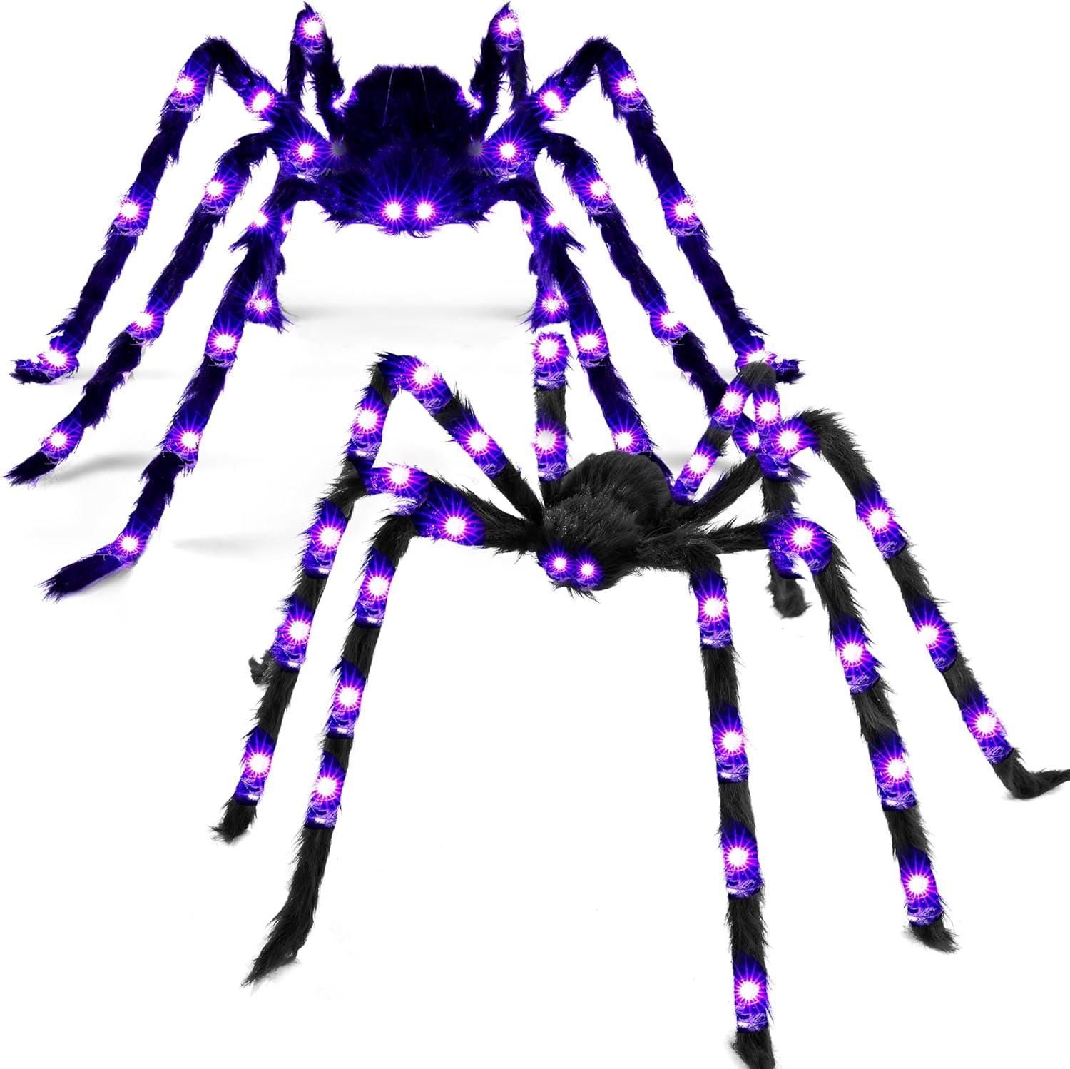 Package Includes: 2 Pack 5 Ft Giant Spider with Purple LED. Double the terror! Hang one colossal spider on your porch and position the other among garden foliage or spider web decorations to create a layered, hair-raising scene. Ideal for amplifying scary Halloween decorations outdoors with depth and drama.3 AA batteries required ( not included)