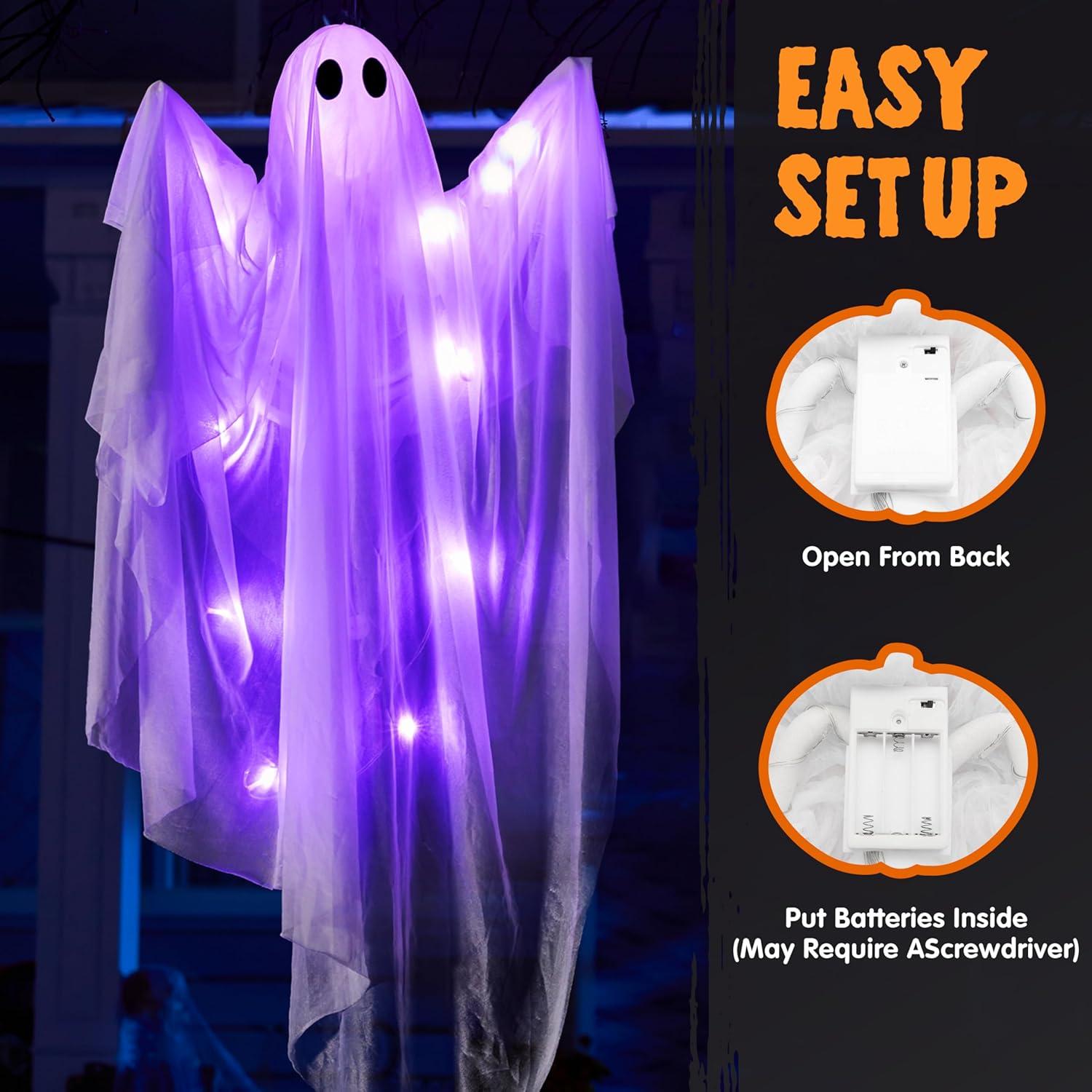 Premium Quality, Easy to Set Up: Crafted from durable and high-quality materials, our Hanging Light up Ghost is built to withstand the elements and last throughout the Halloween season. And it's easy to install and place, you can hang it anywhere you want, on trees, windows, ceilings, porches, or doorways, it's the perfect hassle-free decoration for adding a touch of terror to your home.