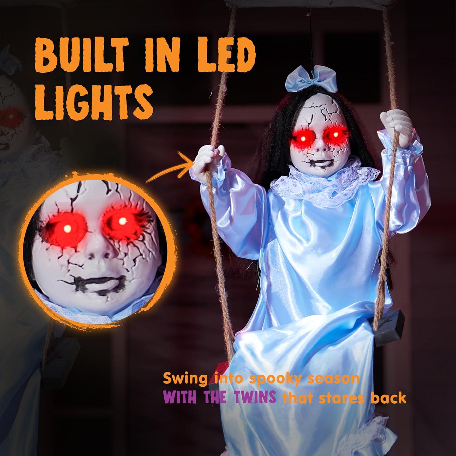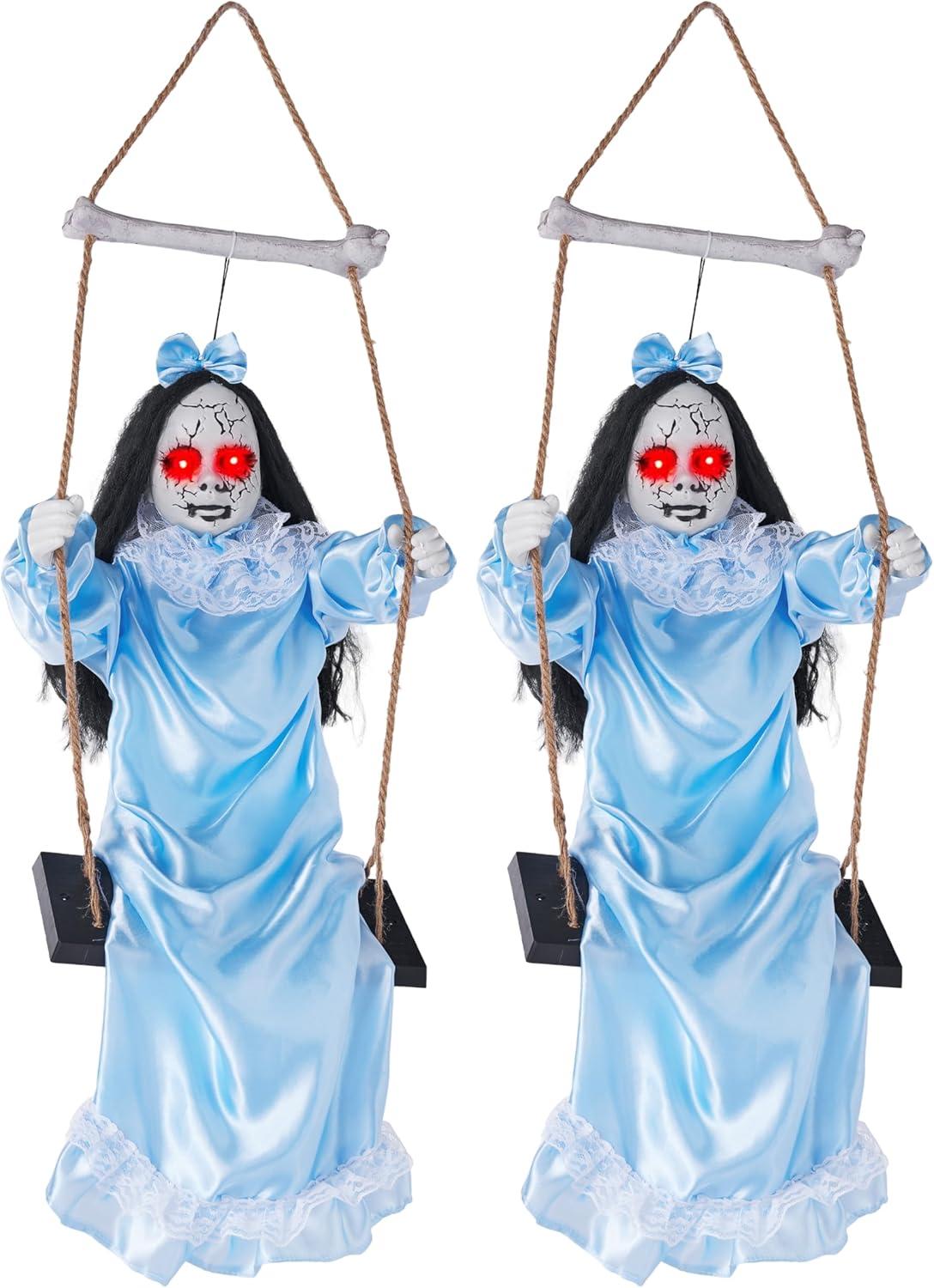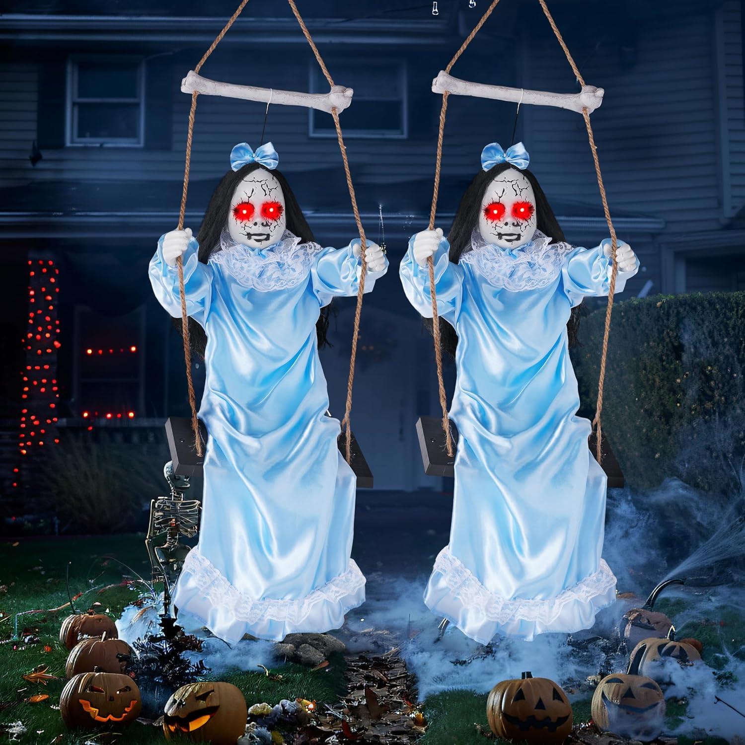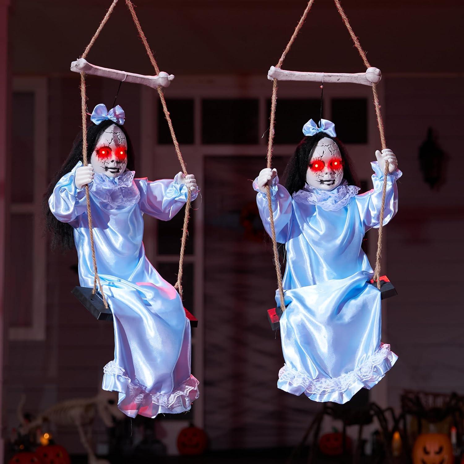 Scary Halloween Decorations: Two ghost sisters in tattered blue skirts swing. Ideal as hanging ghost Halloween decor for a hauntingly whimsical touch.