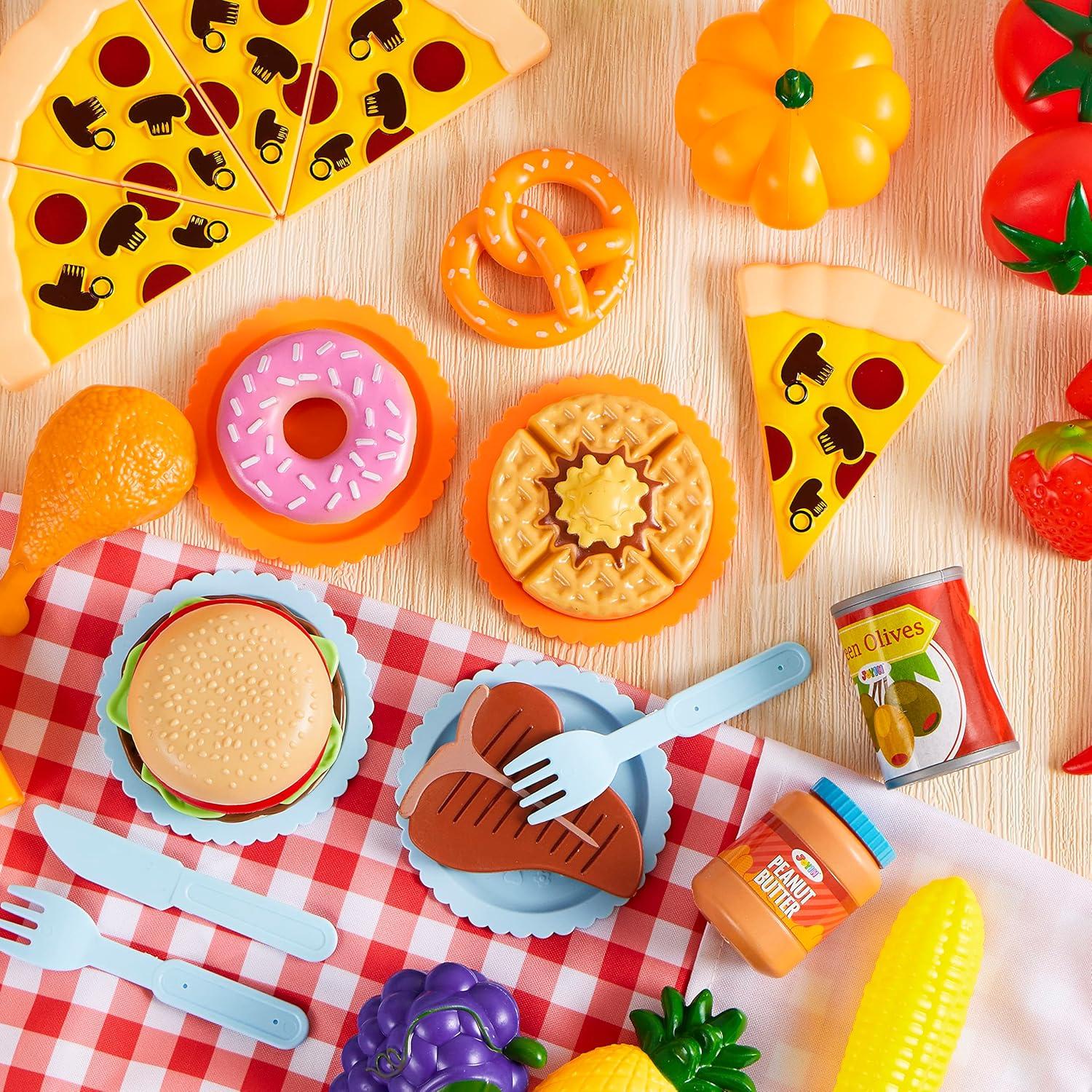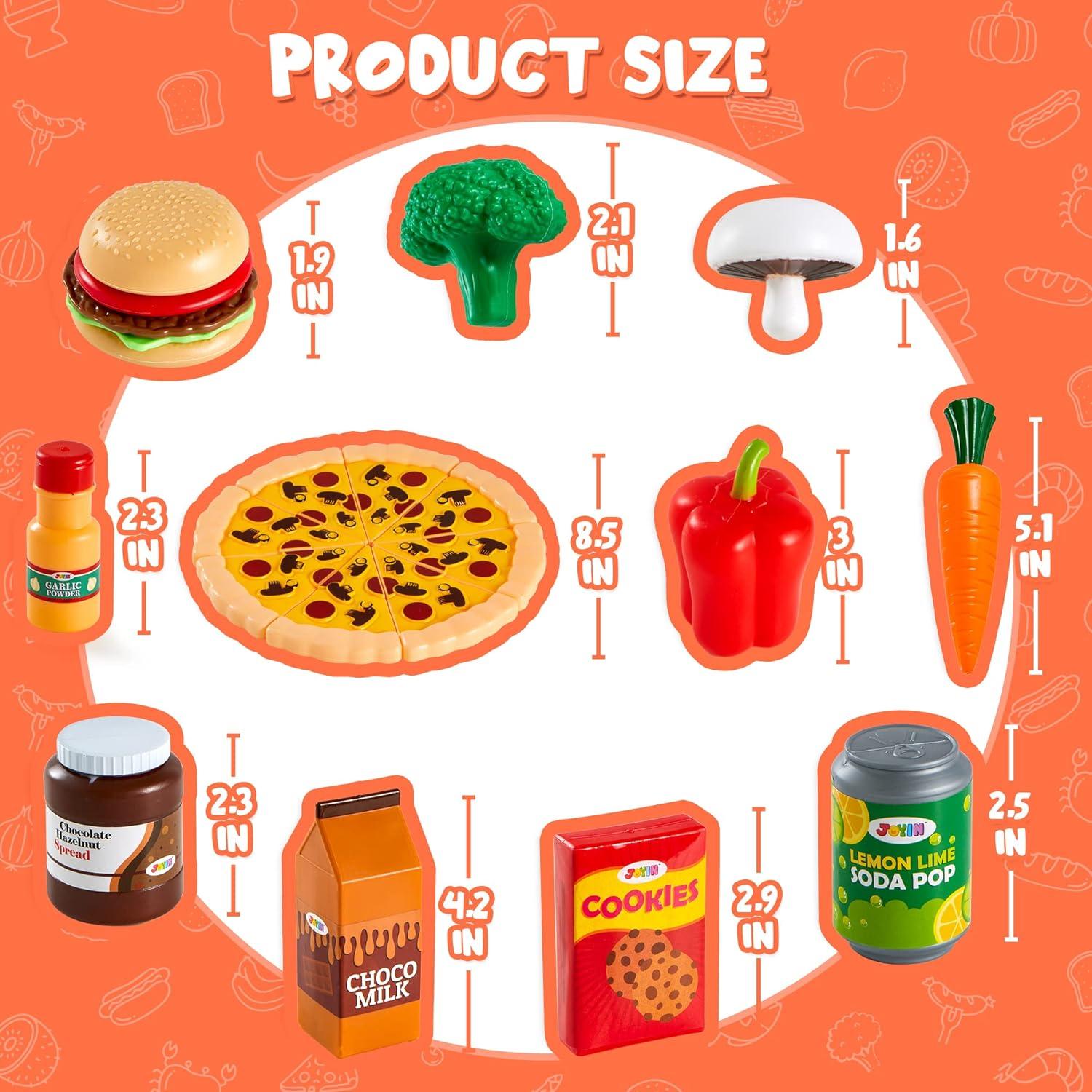 SUPER VALUE PACK. This play kitchen accessories includes 200 pieces of pretend toys for kids, toddlers. Includes fruits, vegetables, food can, soda can, dessert, sauce bottle, seasoning bottle, chicken broth, dish wash and many more.
