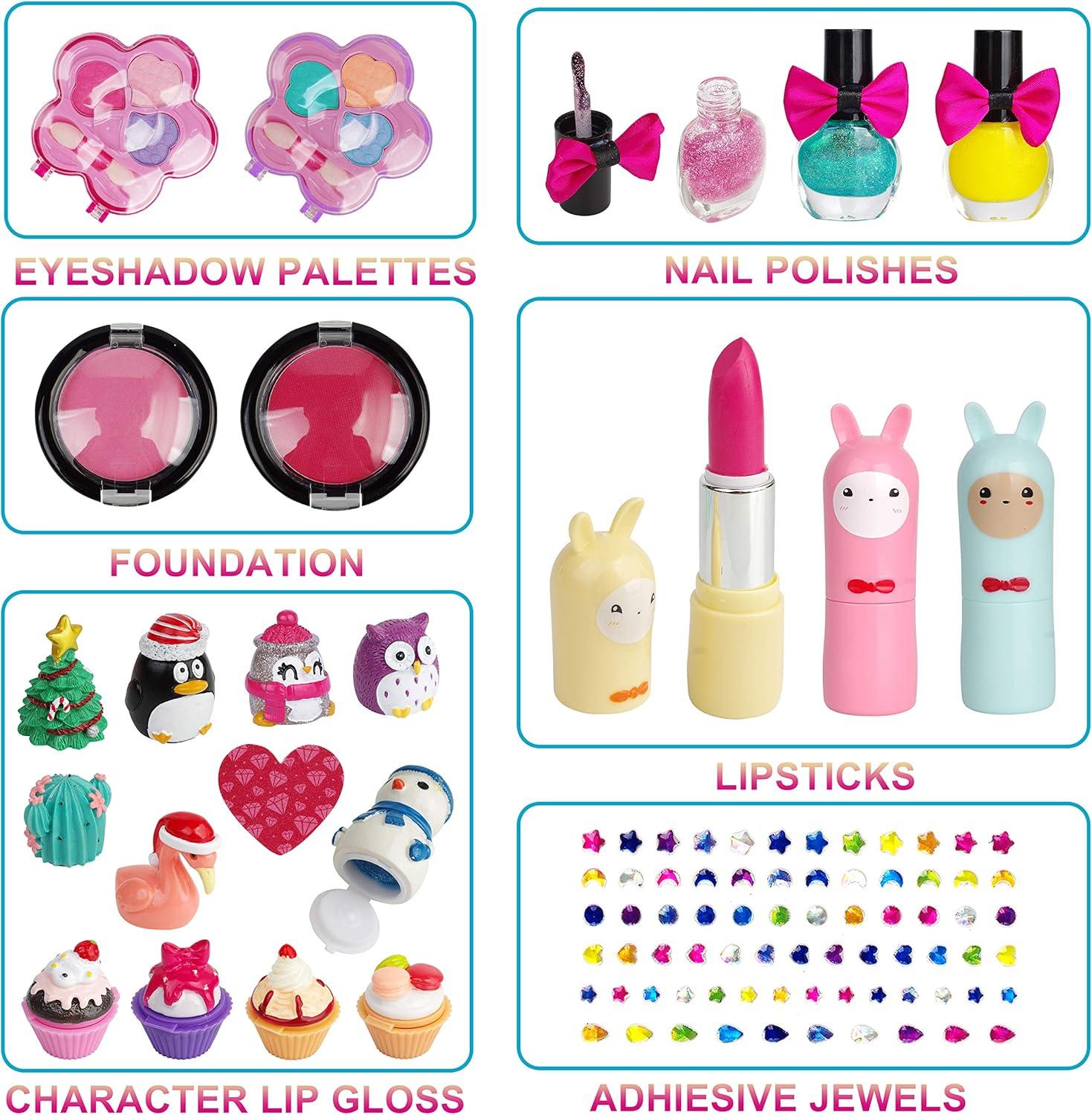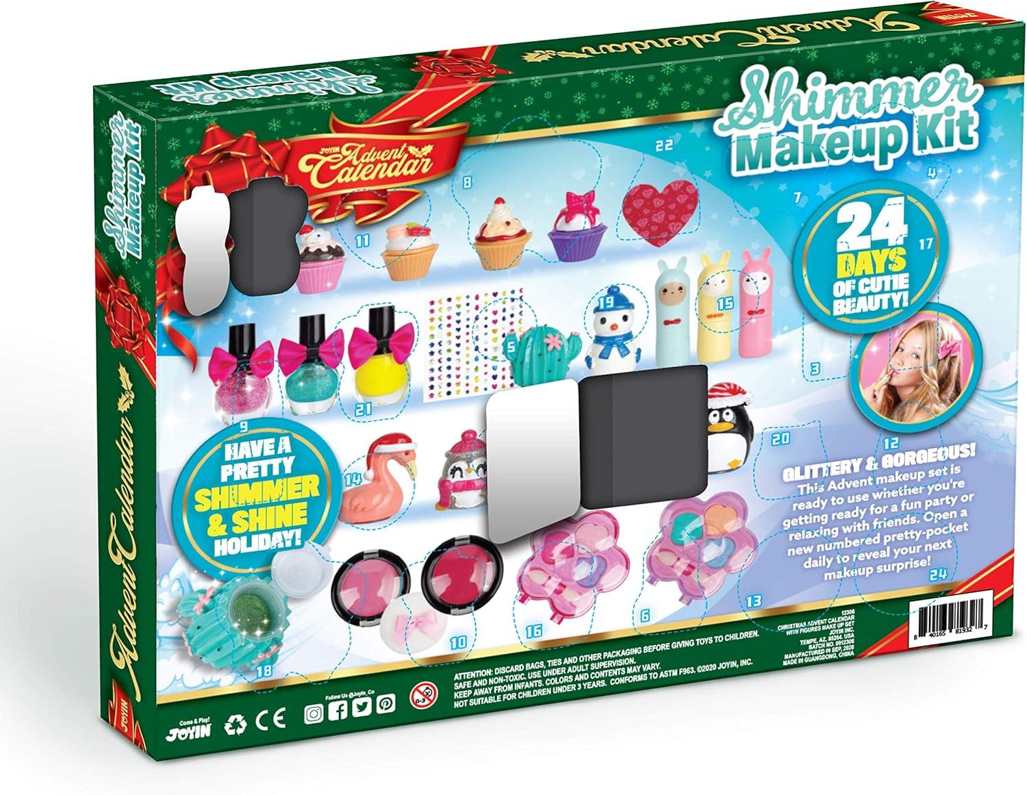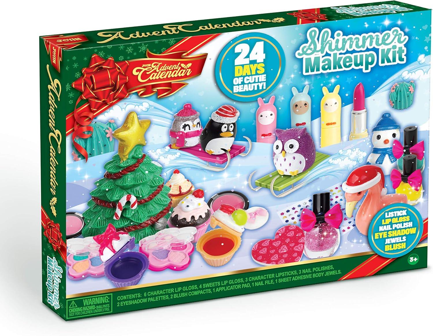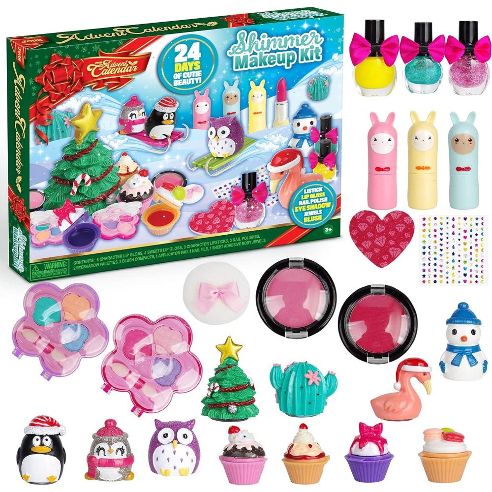 SUPER VALUE PACK. SUPER VALUE PACK.Our Advent Calendar includes 24 days Countdown, 6 character lip gloss, 4 sweet lip gloss, 3 character lipsticks, 3 nail polishes, 2 eyeshadow palettes, 2 blush compacts, 1 applicator pad, 1 nail file, 1 sheet adhesive body jewels