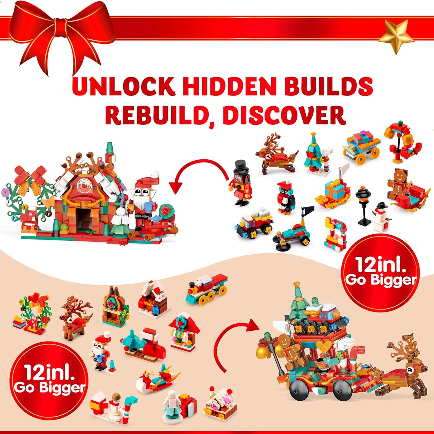 A Super Value Package:Count down to Christmas with daily block surprises! Over 24 days, kids unlock Christmas-themed building sets—think reindeer, nutcrackers, Santa, snowmen, and festive vehicles. Plus, discover 2 epic 12-in-1 large builds (a parade-ready vehicle and a cozy Christmas cottage) to assemble. Each day fuels holiday excitement with creative, screen-free play.