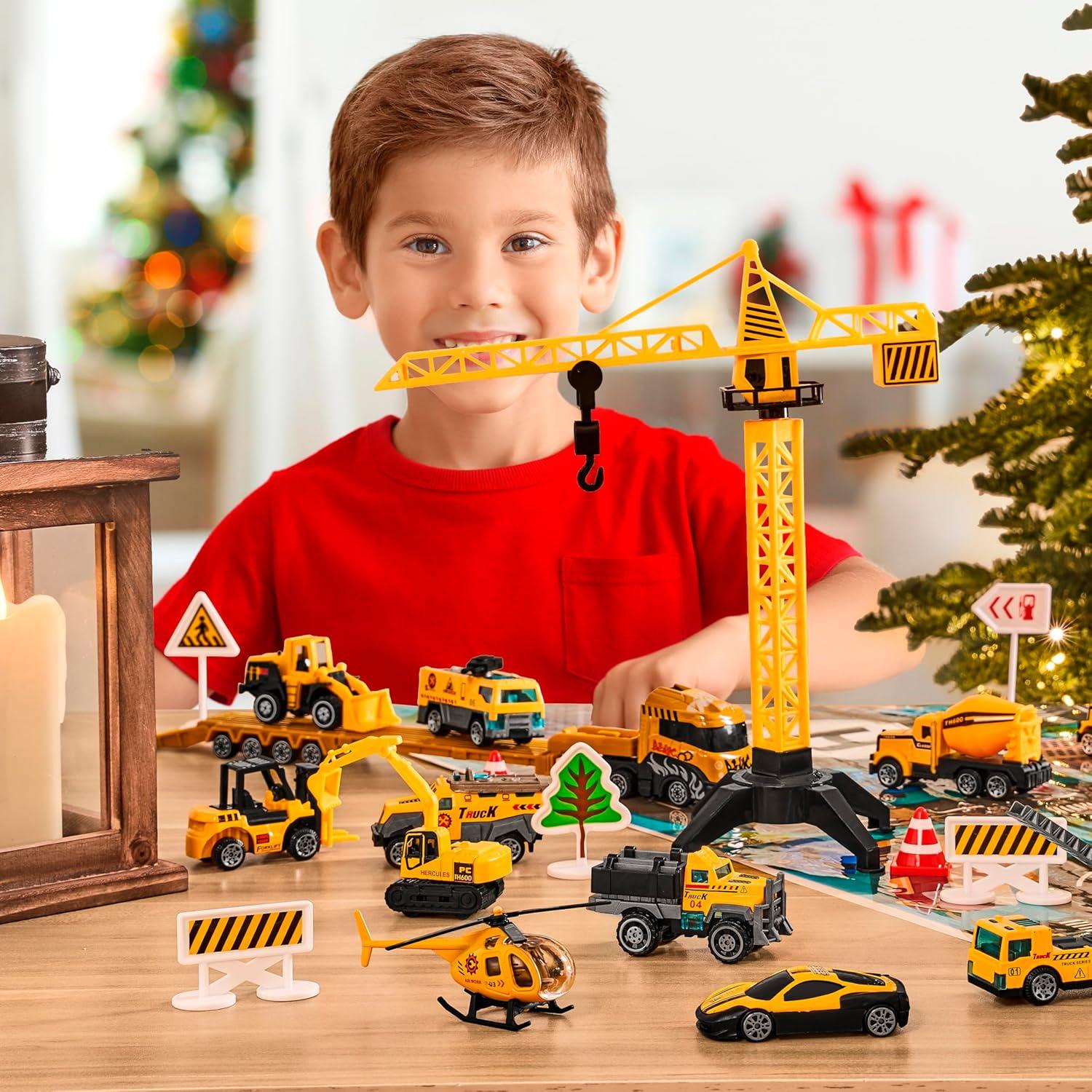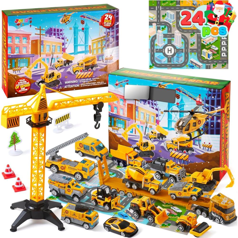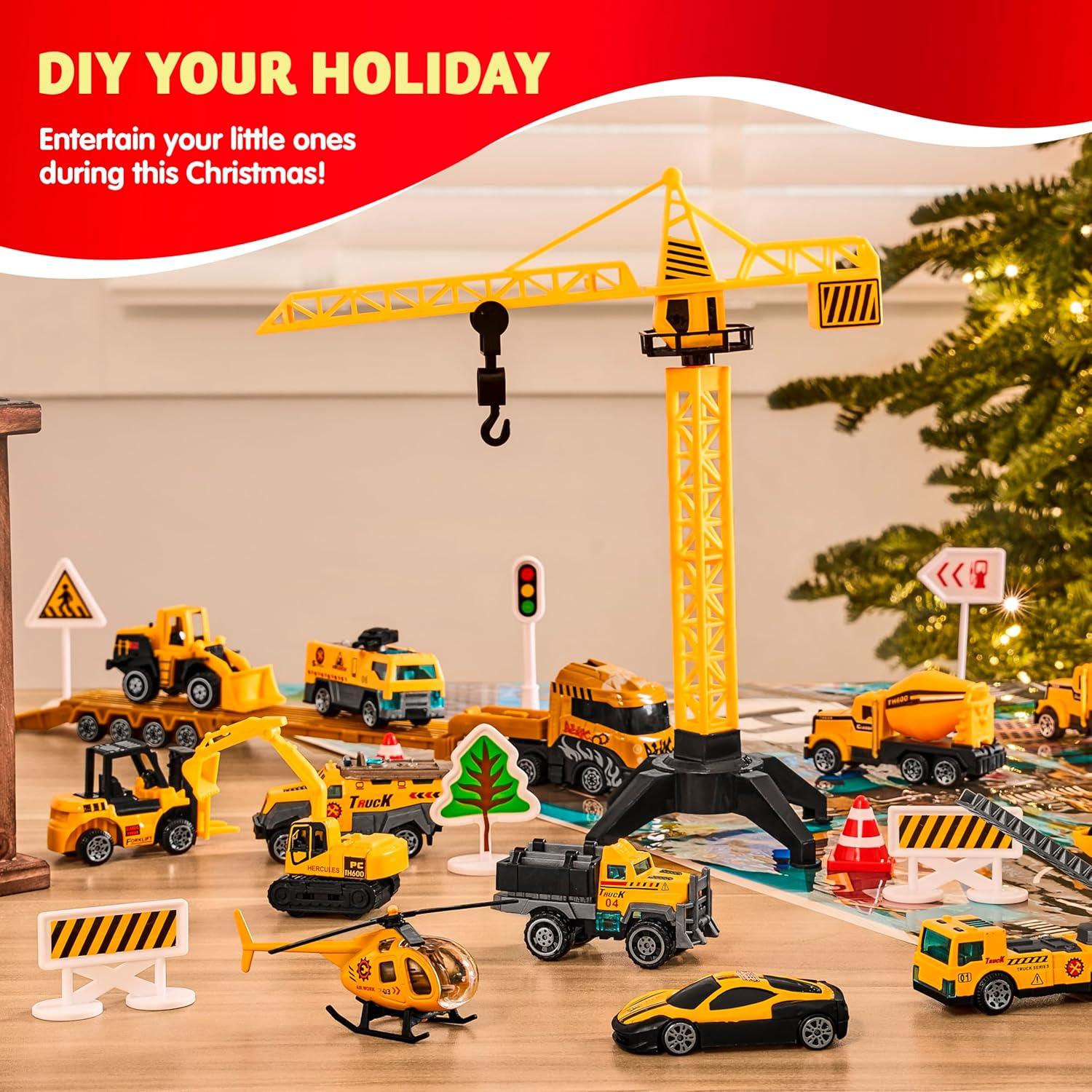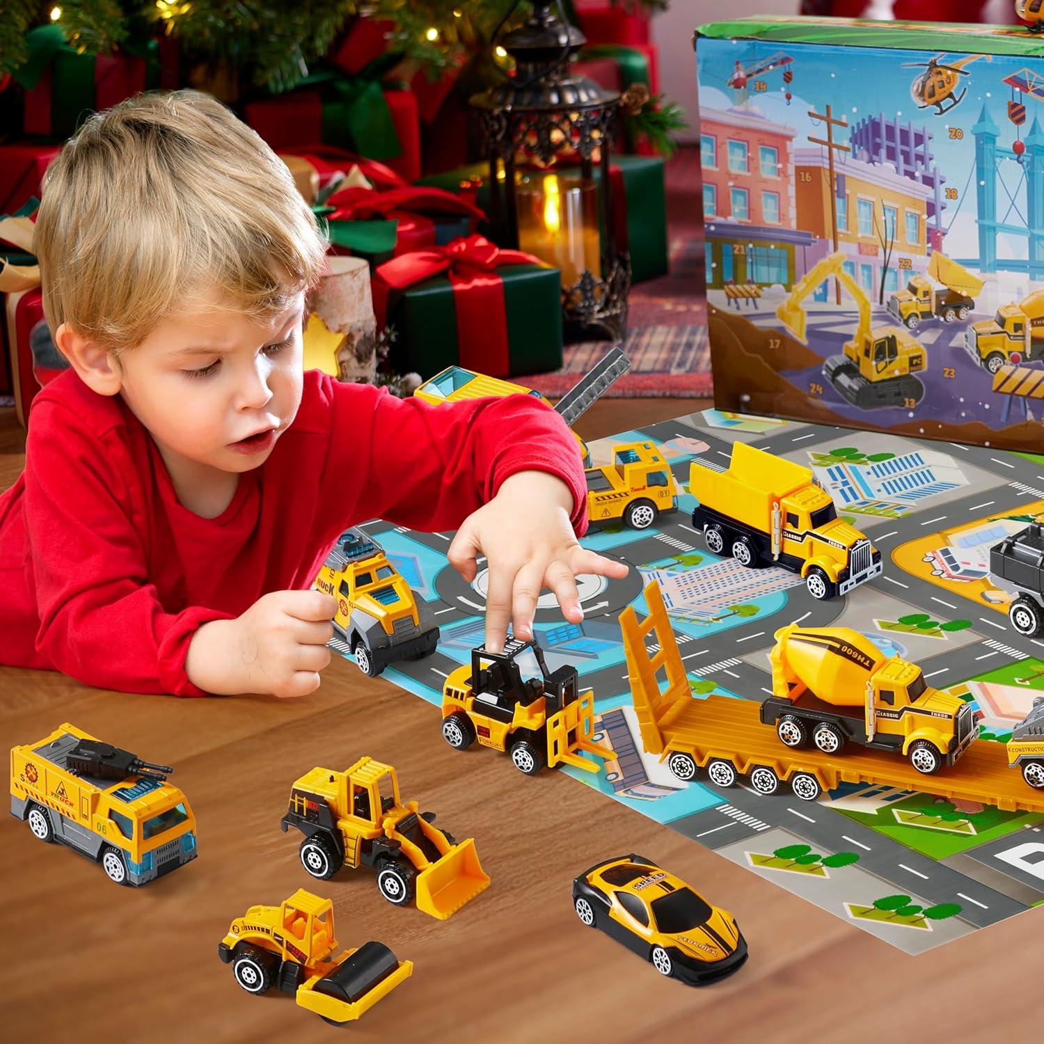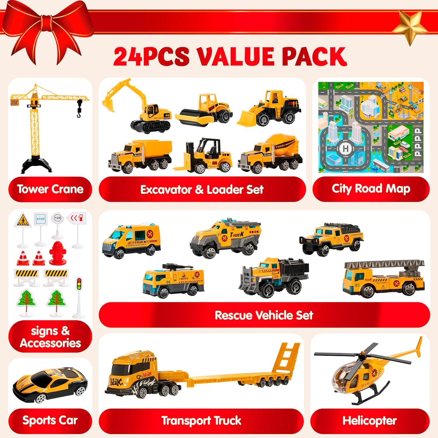 A Super Value Package: Unwrap daily surprises with this Advent Calendar! Over 24 days, kids discover alloy engineering vehicles (excavators, trucks, cranes), accessories (road signs, trees, barriers), and a colorful city play map with roads and buildings, building festive excitement leading up to Christmas. Each day brings a new toy to fuel their construction-themed imagination!
