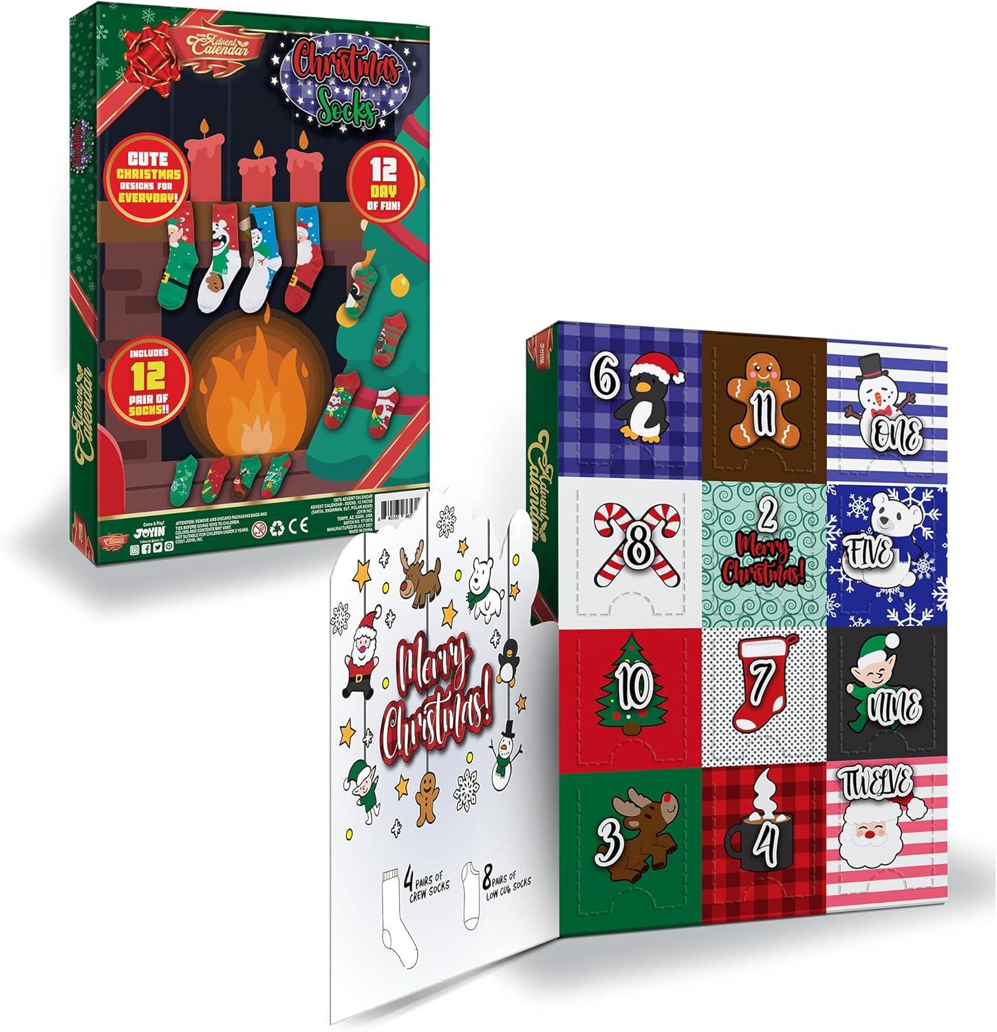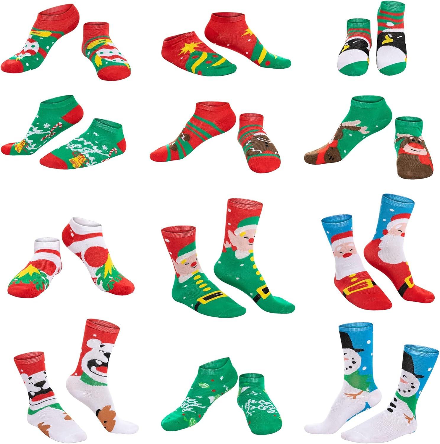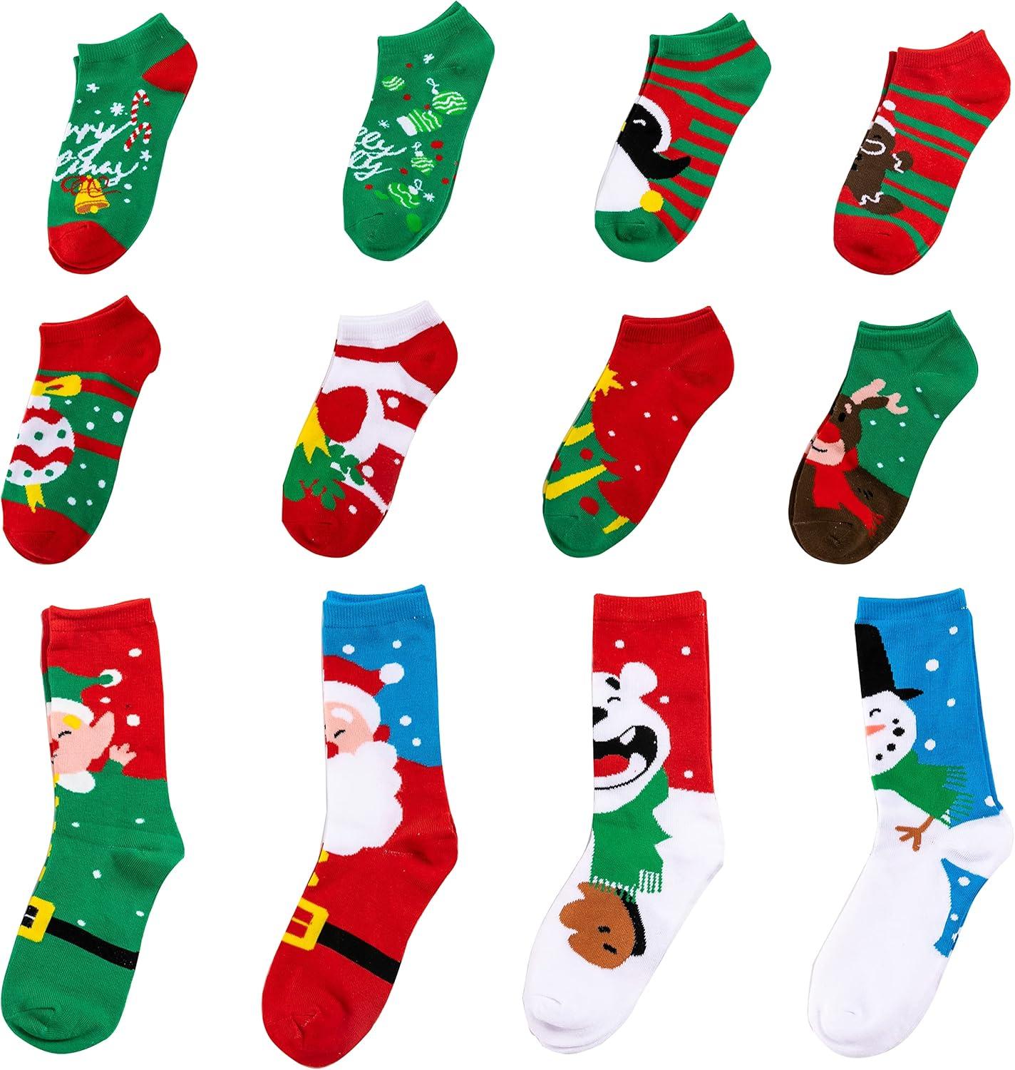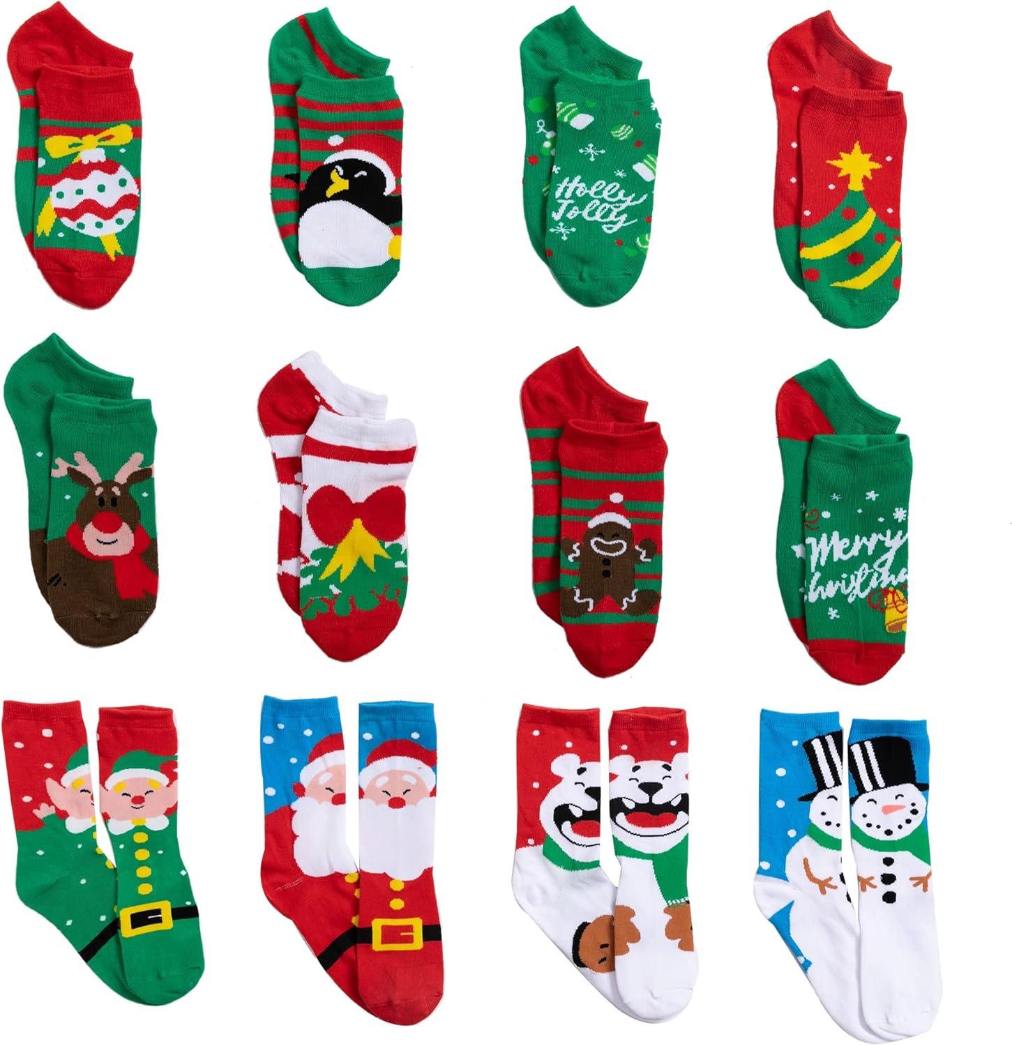 SUPER VALUE PACK. Our Advent Calendar includes 12 Packs Christmas Holiday Socks Advent Calendar with 12 socks: 8 short socks plus 4 long socks. Socks are packaged in colorful 12 Days of Advent Box Socks. Features with patterns like Santa, Snowman, Elf, Polar Bear. Size: One Size Fits All for women.