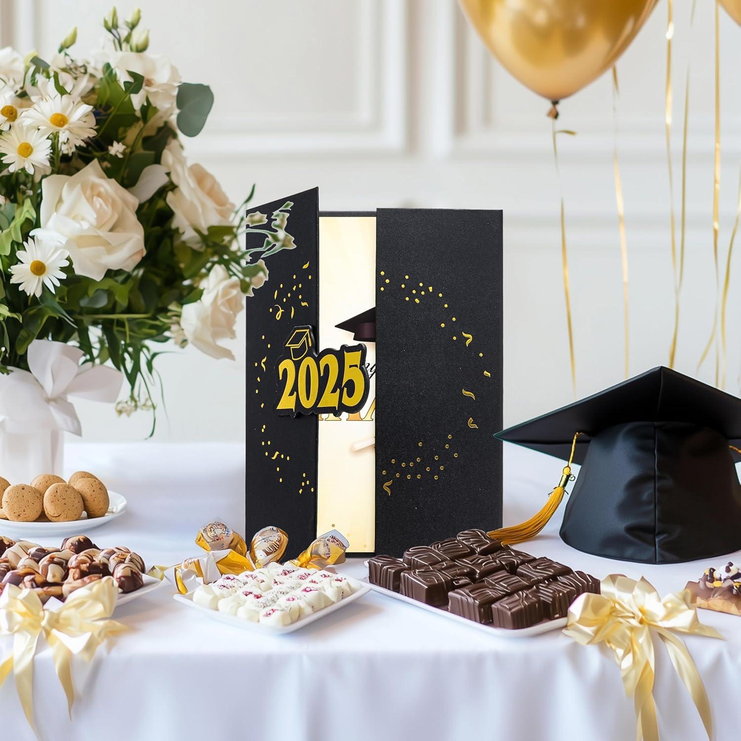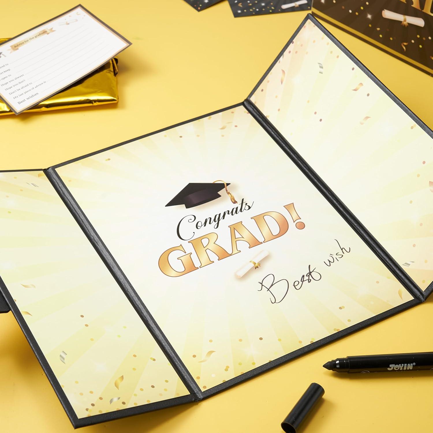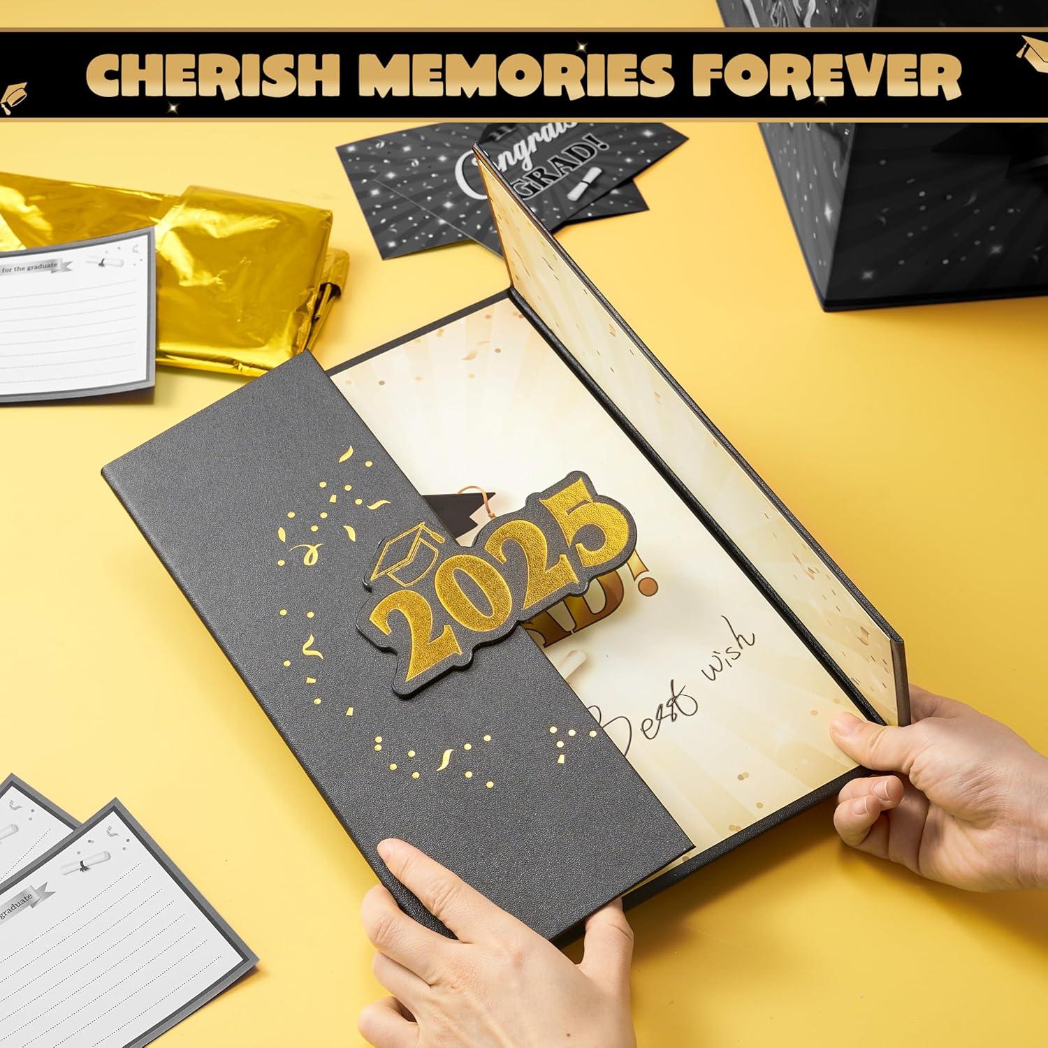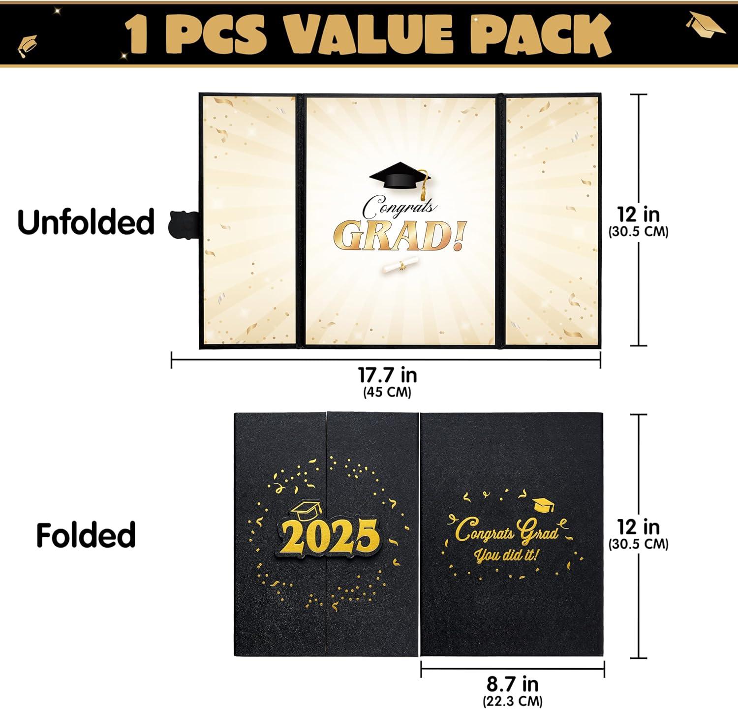 Graduation-Themed Design: This card box features stylish black & gold with fun graduation-inspired details, a ''2025'' font inlaid on the cover, and the inner page contains a graduation cap and “GRAD” design, with three sections for signatures, which are easy to write. Exuding cheerfulness, it is the perfect centerpiece for graduation parties.