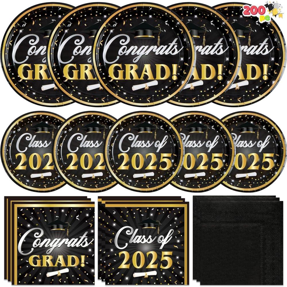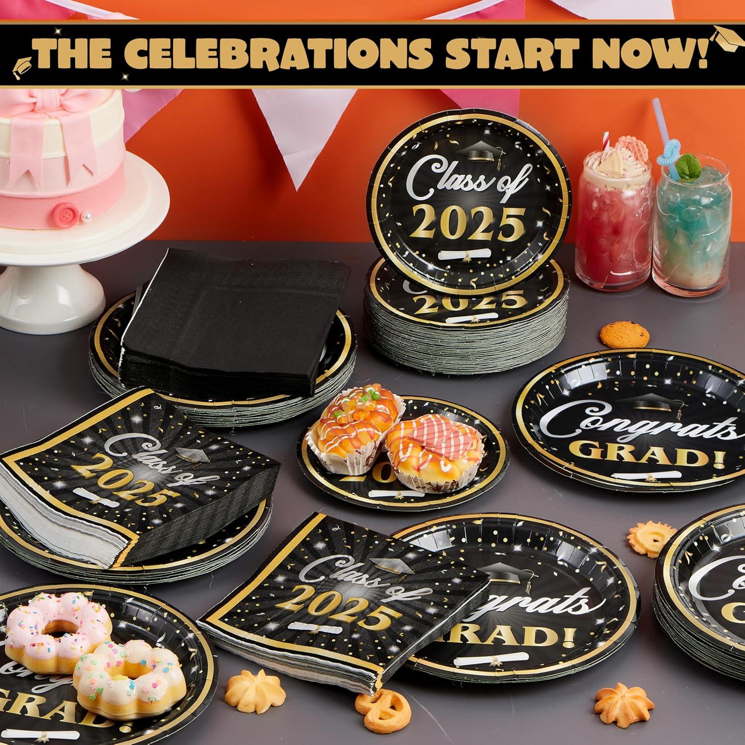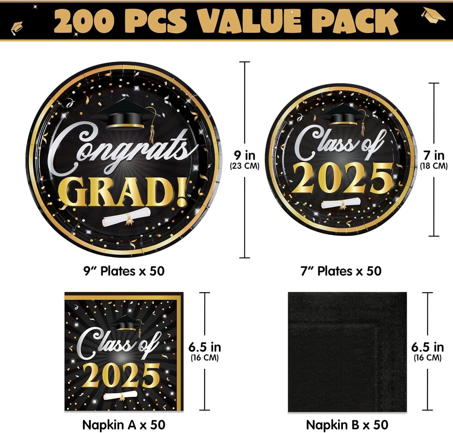 JOYIN 2025 Graduation Party Plates and Napkins Orange Tableware Set Supplies, 200 PCS Graduation Disposable Paper Plates Cocktail Napkins for Congrats Grad Party Decorations Celebration, Serve 50(Black & Gold)