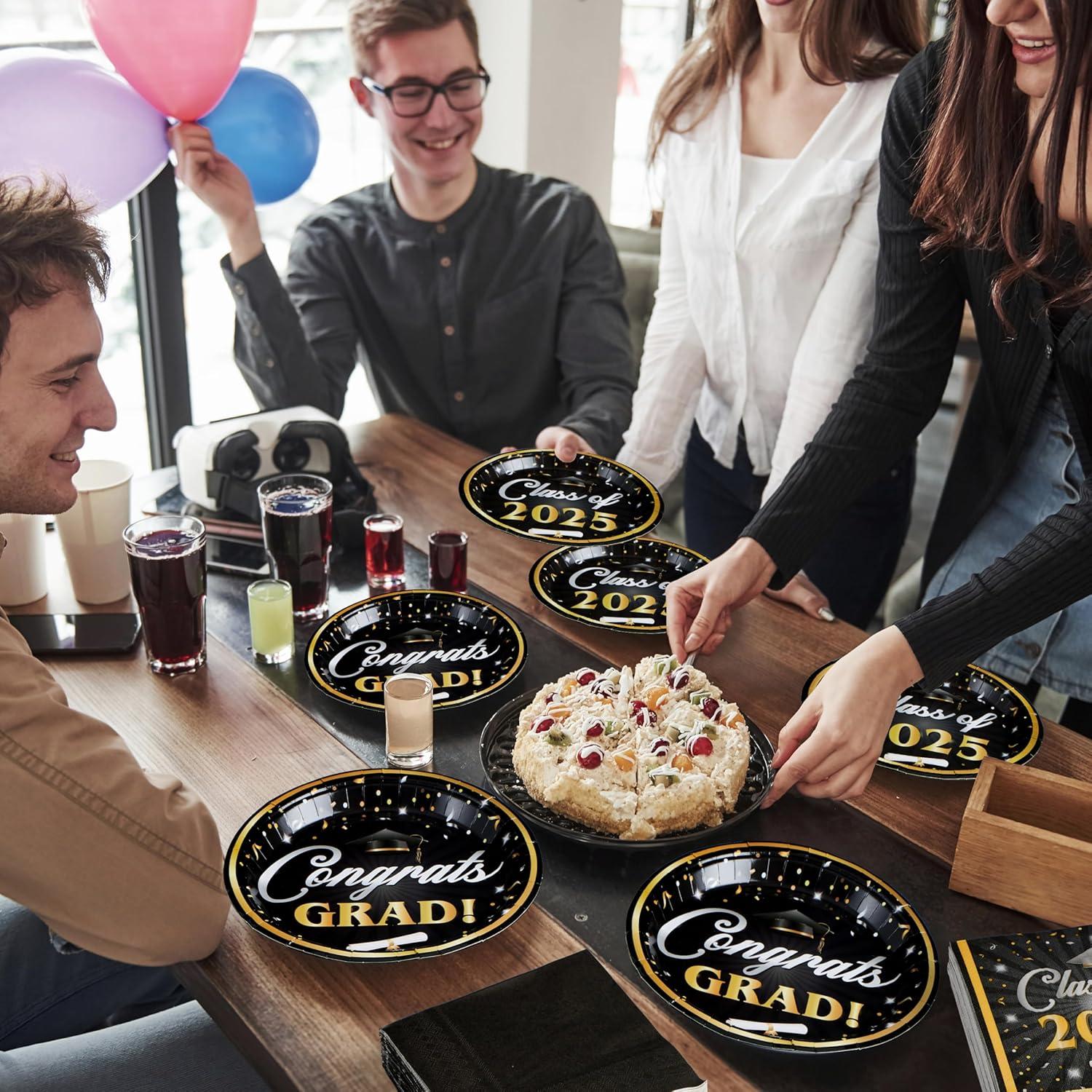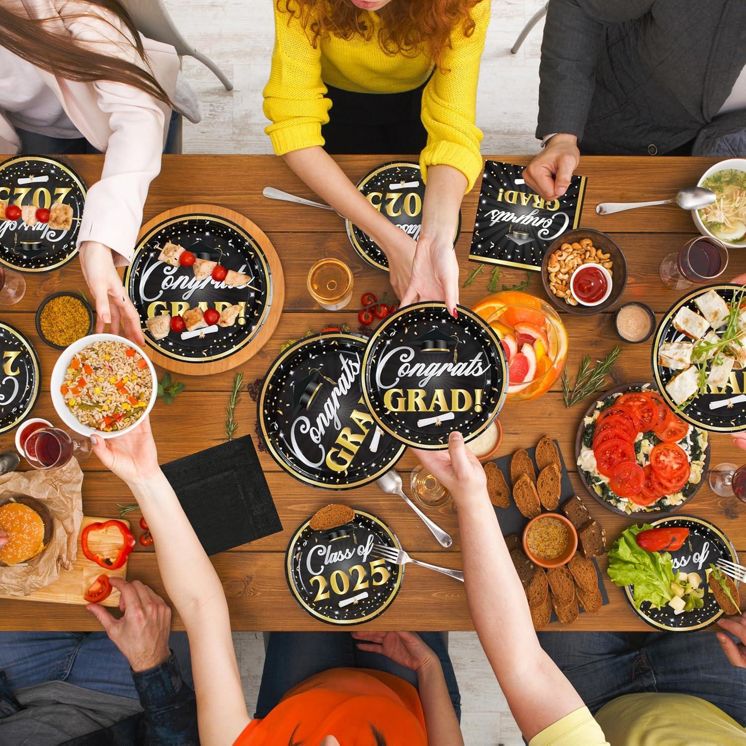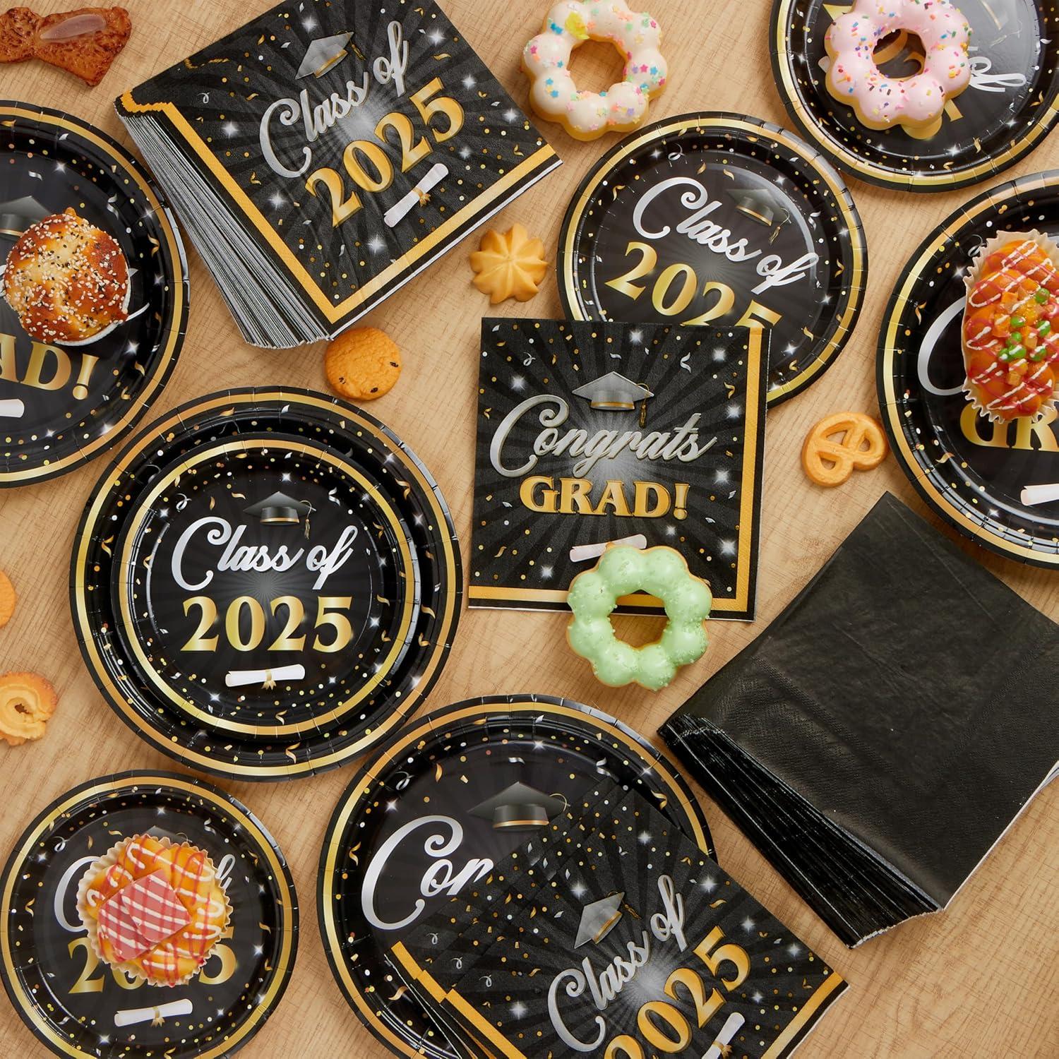 JOYIN 2025 Graduation Party Plates and Napkins Orange Tableware Set Supplies, 200 PCS Graduation Disposable Paper Plates Cocktail Napkins for Congrats Grad Party Decorations Celebration, Serve 50(Black & Gold)