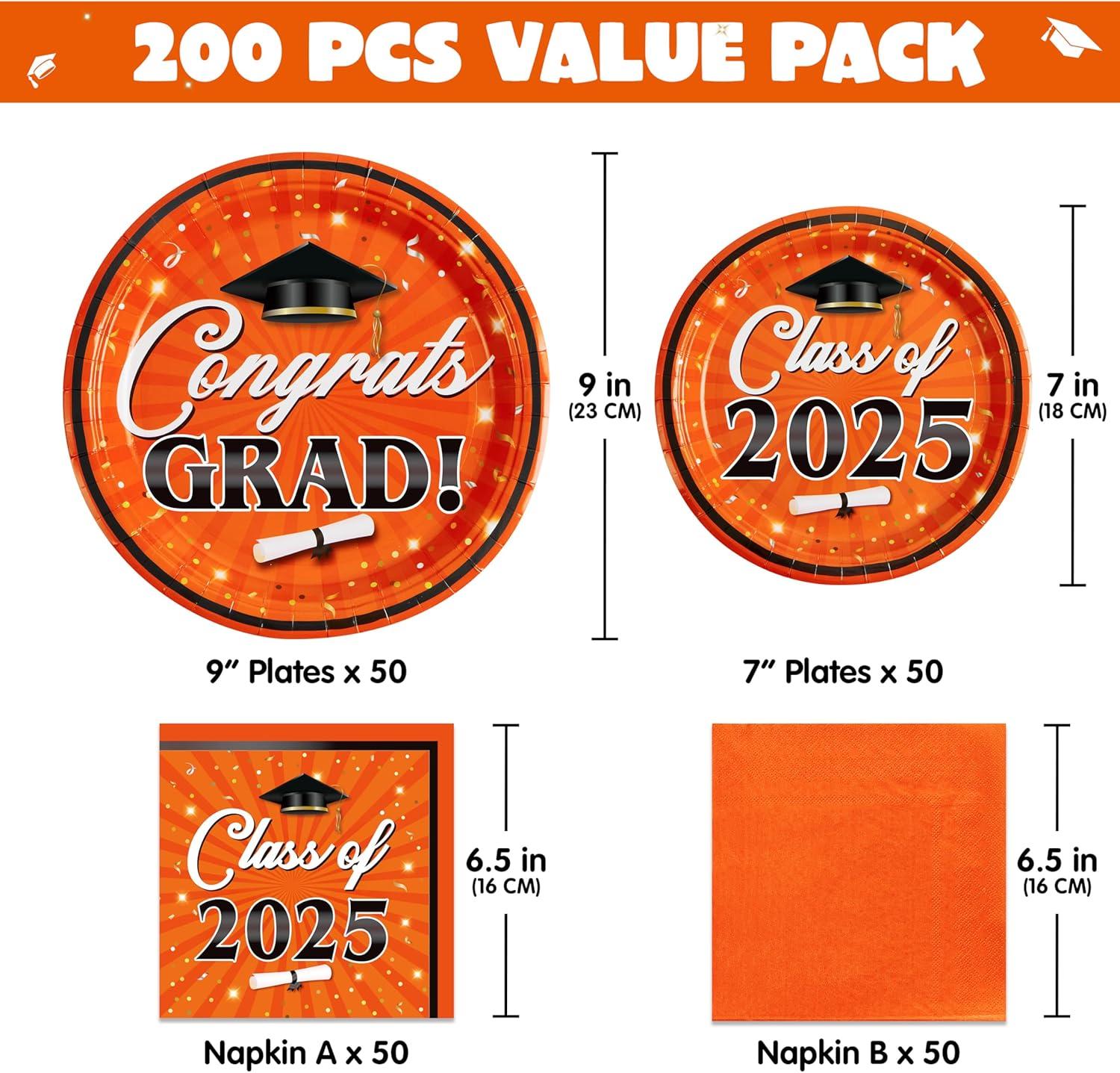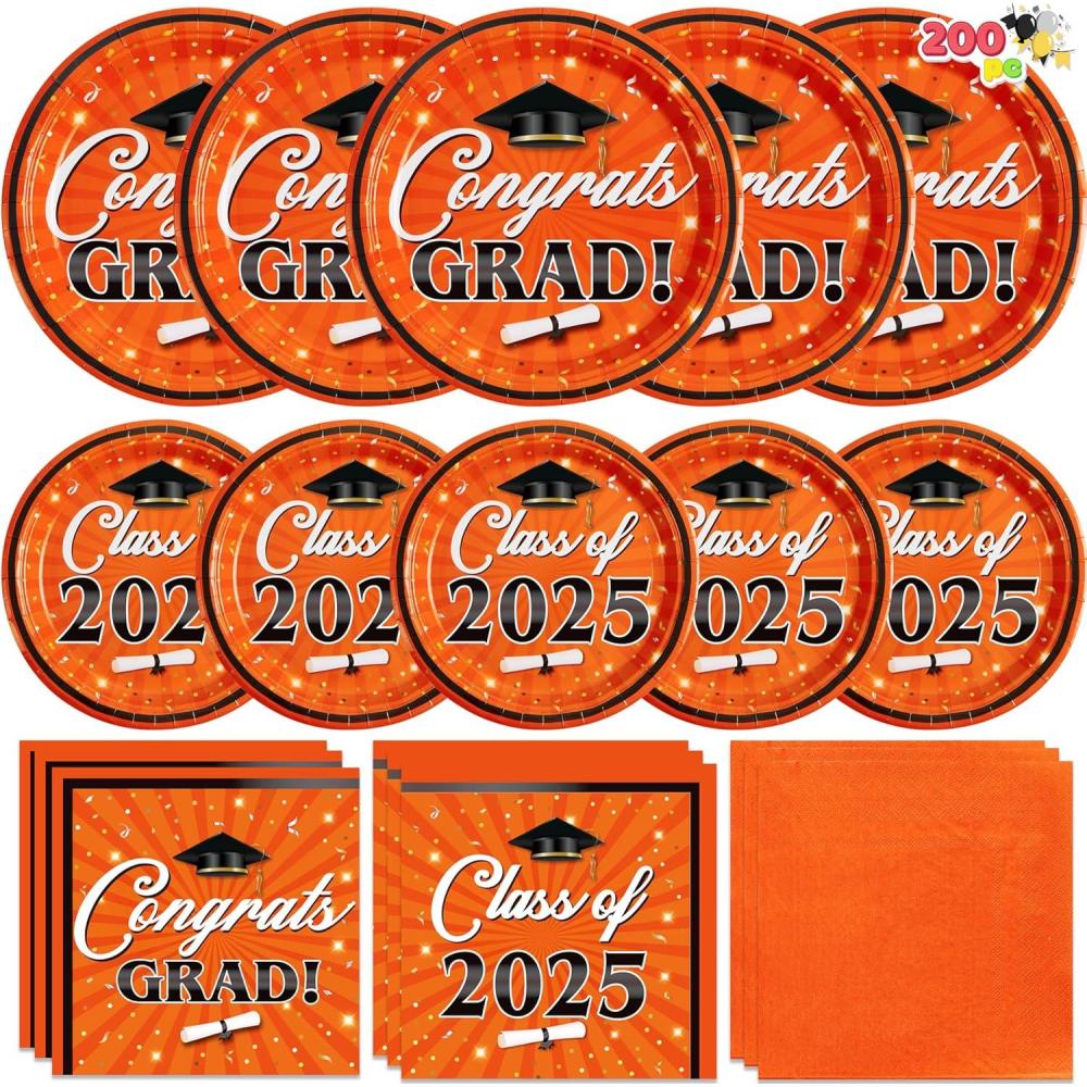 JOYIN 2025 Graduation Party Plates and Napkins Orange Tableware Set Supplies, 200 PCS Graduation Disposable Paper Plates Cocktail Napkins for Congrats Grad Party Decorations Celebration, Serve 50(Orange)