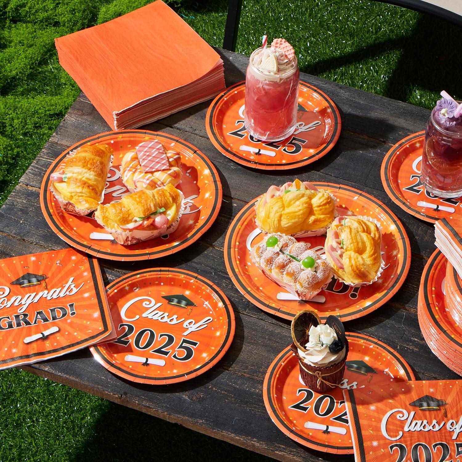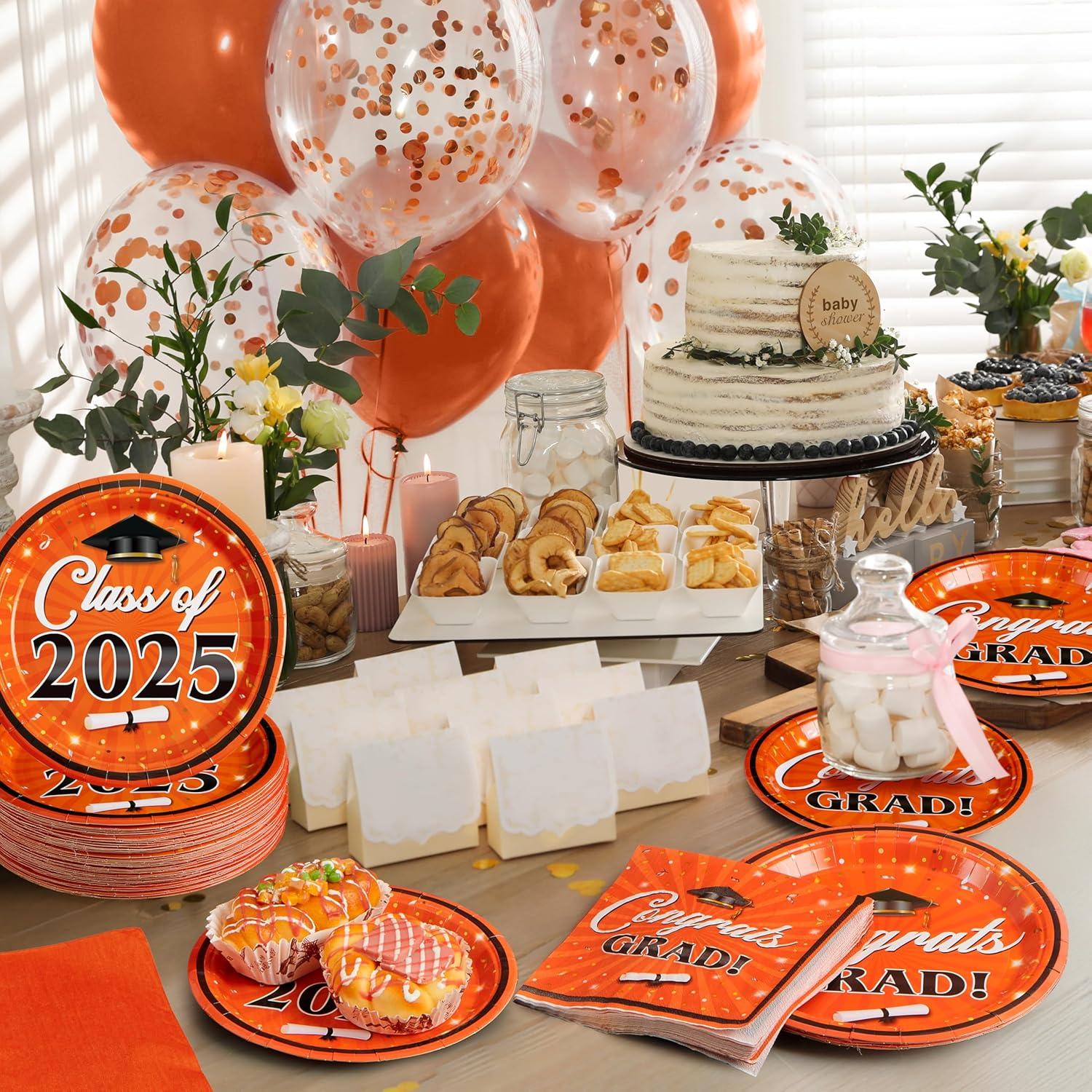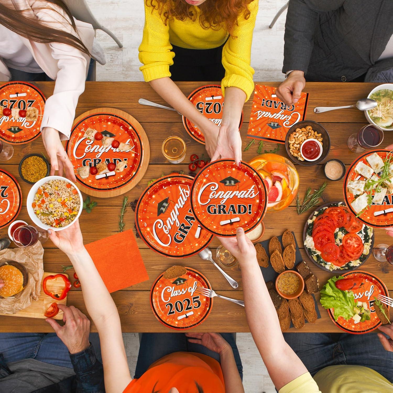 2025 Graduation-Themed Design: This Orange tableware set features two celebratory designs—one with “Congrats Grad” and another with “Class of 2025″—this tableware set adds a cheerful and polished touch to your graduation decor.