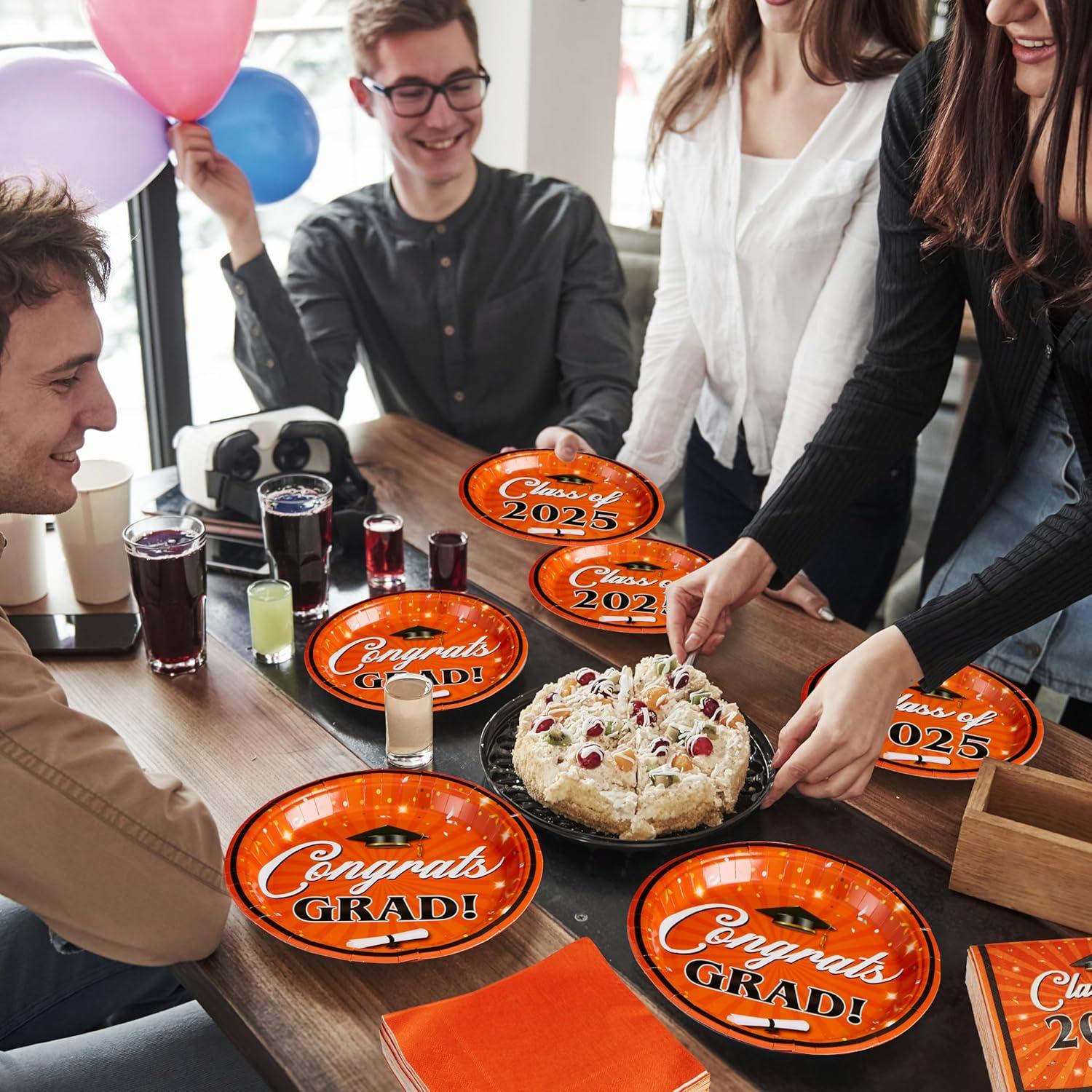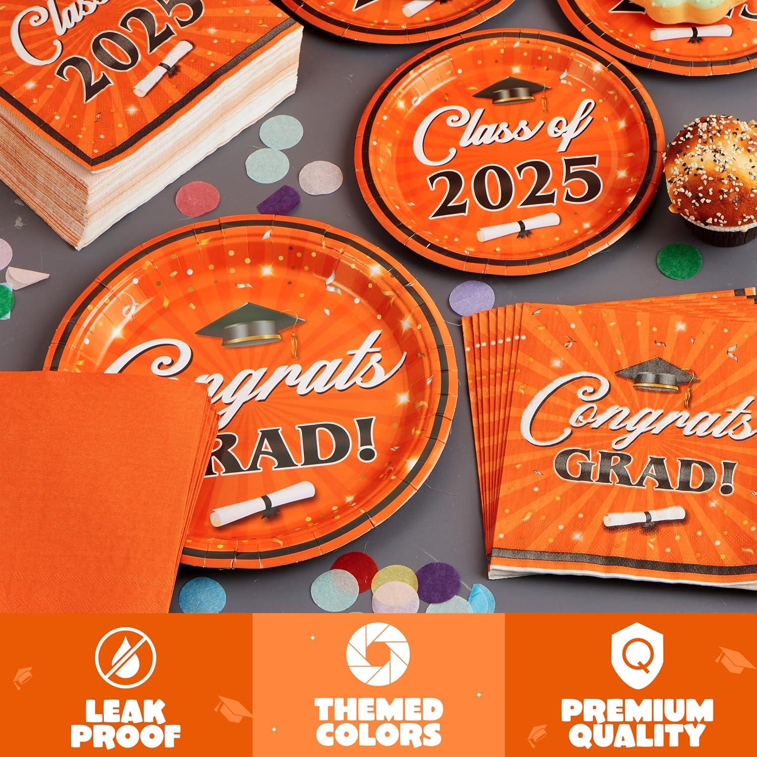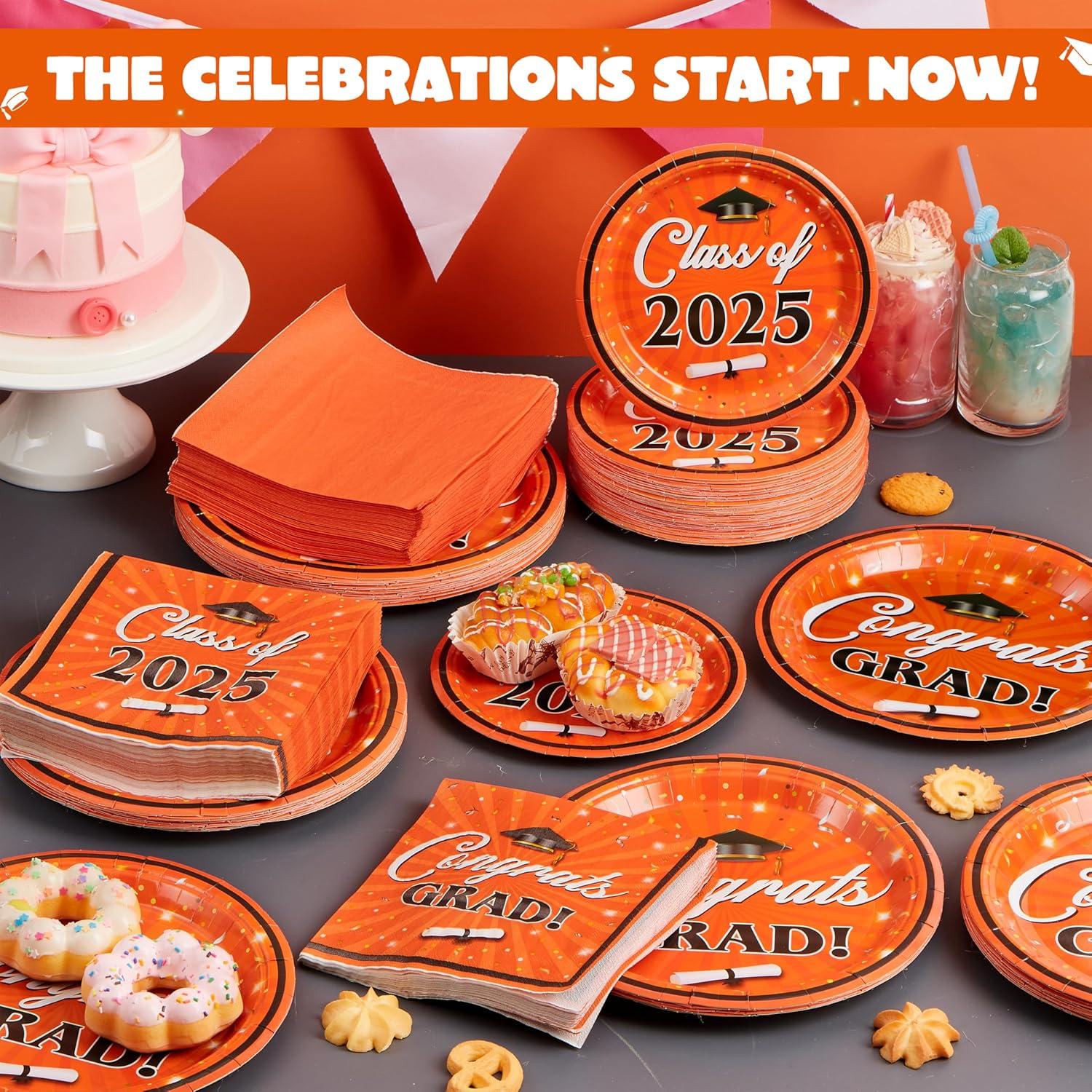 2025 Graduation-Themed Design: This Orange tableware set features two celebratory designs—one with “Congrats Grad” and another with “Class of 2025″—this tableware set adds a cheerful and polished touch to your graduation decor.